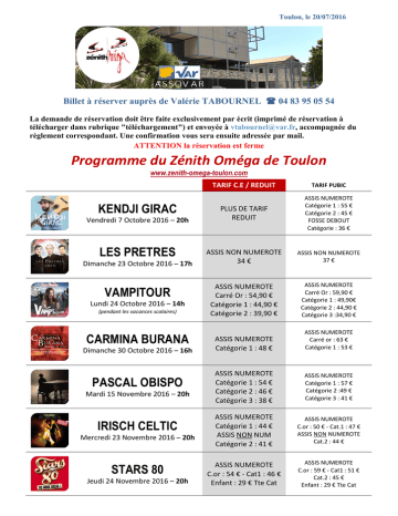 Toulon, le 20/07/2016 Billet à réserver auprès de Valérie TABOURNEL 04 83 95 05 54 La demande de réservation doit être faite exclusivement par écrit (imprimé de réservation à télécharger dans rubrique "téléchargement") et envoyée à [email protected], accompagnée du règlement correspondant. Une confirmation vous sera ensuite adressée par mail. ATTENTION la réservation est ferme Programme du Zénith Oméga de Toulon www.zenith-omega-toulon.com KENDJI GIRAC Vendredi 7 Octobre 2016 – 20h LES PRETRES Dimanche 23 Octobre 2016 – 17h VAMPITOUR Lundi 24 Octobre 2016 – 14h (pendant les vacances scolaires) CARMINA BURANA Dimanche 30 Octobre 2016 – 16h PASCAL OBISPO Mardi 15 Novembre 2016 – 20h IRISCH CELTIC Mercredi 23 Novembre 2016 – 20h STARS 80 Jeudi 24 Novembre 2016 – 20h TARIF C.E / REDUIT TARIF PUBIC PLUS DE TARIF REDUIT ASSIS NUMEROTE Catégorie 1 : 55 € Catégorie 2 : 45 € FOSSE DEBOUT Catégorie : 36 € ASSIS NON NUMEROTE 34 € ASSIS NON NUMEROTE 37 € ASSIS NUMEROTE Carré Or : 54,90 € Catégorie 1 : 44,90 € Catégorie 2 : 39,90 € ASSIS NUMEROTE Carré Or : 59,90 € Catégorie 1 : 49,90€ Catégorie 2 : 44,90 € Catégorie 3 :34,90 € ASSIS NUMEROTE Catégorie 1 : 48 € ASSIS NUMEROTE Carré or : 63 € Catégorie 1 : 53 € ASSIS NUMEROTE Catégorie 1 : 54 € Catégorie 2 : 46 € Catégorie 3 : 38 € ASSIS NUMEROTE Catégorie 1 : 57 € Catégorie 2 :49 € Catégorie 3 : 41 € ASSIS NUMEROTE Catégorie 1 : 44 € ASSIS NON NUM Catégorie 2 : 41 € ASSIS NUMEROTE C.or : 50 € - Cat.1 : 47 € ASSIS NON NUMEROTE Cat.2 : 44 € ASSIS NUMEROTE C.or : 54 € - Cat1 : 46 € Enfant : 29 € Tte Cat ASSIS NUMEROTE C.or : 59 € - Cat1 : 51 € Cat.2 : 45 € Enfant : 29 € Tte Cat DIEUDONNE Samedi 26 Novembre 2016 – 20h BOLERO Mercredi 7 Décembre 2016 – 20h ILS S'AIMENT DEPUIS 20 ANS MICHELE LAROQUE – PIERRE PALMADE Jeudi 8 Décembre 2016 – 20h30 ELTON JOHN Vendredi 9 Décembre 2016 – 20h LA REINE DES NEIGES Dimanche 11 Décembre 2016 15h30 ASSIS NON NUMEROTE 35 € ASSIS NON NUMEROTE 39 € ASSIS NUMEROTE Catégorie 1 : 45 € Catégorie 2 : 35 € ASSIS NUMEROTE Carré or : 62 € Catégorie 1 : 49 € Catégorie 2 : 39 € ASSIS NUMEROTE Catégorie 1 : 51 € ASSIS NUMEROTE Catégorie 1 : 55 € Catégorie 2 : 49 € Catégorie 3 : 45 € ASSIS NUMEROTE Platine : 221.50 € - Carré or : 150 € Catégorie 1 : 122.50 € - Catégorie 2 : 95 € Catégorie 3 : 67.50 € ASSIS NUMEROTE Carré or : 39 € - Carré or Enfant : 36 € Catégorie 1 : 34 € - Catégorie 1 Enfant : 30 € Catégorie 2 : 29 € - Catégorie 2 Enfant : 25 € ARNAUD DUCRET ASSIS NON NUMEROTE 35 € Vendredi 16 Décembre 2016 – 20h30 RENAUD Samedi 17 Décembre 2016 – 20h LE LAC DES CYGNES BALLET & ORCHESTRE OPERA NATIONAL DE RUSSIE Mercredi 22 Février 2017 – 20h LE LAC DES CYGNES SAINT PERTERSBOURG BALLET THEATRE ASSIS NUMEROTE Catégorie 1 : 46 € ASSIS NUMEROTE Catégorie 1 : 44 € Catégorie 2 : 34 € PAS DE TARIF C.E Vendredi 24 Février 2017 – 20h MICHAEL GREGORIO Jeudi 2 Mars 2017 – 20h30 LES CHEVALIERS DU FIEL NOEL D'ENFER Vendredi 3 Mars 2017 – 20h30 ASSIS NON NUMEROTE 38 € ASSIS NUMEROTE Catégorie 1 :49 € Catégorie 2 : 43 € FOSSE DEBOUT Catégorie 3 : 39 € ASSIS NUMEROTE Carré or : 62 € Catégorie 1 : 49 € Catégorie 2 : 39 € ASSIS NUMEROTE Carré or : 60 € Catégorie 1 :49 € Catégorie 2 : 39 € Enfant : 25 € Tte Cat ASSIS NUMEROTE Catégorie 1 : 44 € PAS DE TARIF C.E ASSIS NUMEROTE Carré or : 52 € Catégorie 1 : 47€ Catégorie 2 : 43 € Catégorie 3 : 38 € ASSIS NUMEROTE Carré or : 59 € Catégorie 1 : 49 € Catégorie 2 : 41 € Catégorie 3 : 35 € THE AUSTRALIAN PINK FLOYD SHOW ASSIS NUMEROTE Catégorie 1 : 55.40 € ASSIS NUMEROTE Catégorie 1 : 58.70 € Catégorie 2 : 47.70 € ASSIS NUMEROTE Catégorie 1 : 30 € ASSIS NON NUMEROTE Catégorie 2 : 20 € ASSIS NUMEROTE Carré or : 45 € - Enf : 42 € Cat. 1 : 35 € - Enf : 32 € ASSIS NON NUMEROTE Cat 2 : 25 € - Enf: 22 € Samedi 11 Mars 2017 – 20h LES SCHTROUMPFS LE SPECTACLE MUSICAL Dimanche 12 Mars 2017 – 17h30 PACK FAMILLE (à partir de 4 Places) CAT 1 : 32 € - CAT 2 : 22 € MESSMER Dimanche 26 Mars 2017 – 17h NOELLE PERNA Vendredi 7 Avril 2017 – 20h30 DIEUDONNE Samedi 8 Avril 2017 – 20h CHRISTOPHE MAE Jeudi 13 Avril 2017 – 20h JEREMY FERRARI Jeudi 4 Mai 2017 – 20h30 M.POKORA Samedi 20 Mai 2017– 20h TIMEO Vendredi 9 Juin 2017 – 20h CARMINA BURANA Vendredi 1er Décembre 2017 – 20h30 ASSIS NUMEROTE Catégorie 1 : 46.50 € ASSIS NUMEROTE Carré or : 59.50 € Catégorie 1 : 49.50 € Catégorie 2 :44.50 € Catégorie 3 : 39.50 € ASSIS NUMEROTE Catégorie 1 : 37 € Catégorie 2 : 33 € ASSIS NUMEROTE Catégorie 1 : 40 € Catégorie 2 :36 € ASSIS NON NUMEROTE 35 € ASSIS NON NUMEROTE 39 € ASSIS NUMEROTE Carré or : 66 € Catégorie 1 : 56 € Catégorie 2 : 46 € ASSIS NUMEROTE Carré or : 69 € Catégorie 1 : 59 € Catégorie 2 : 49 € Catégorie 3 : 39 € ASSIS NON NUMEROTE 38 € ASSIS NON NUMEROTE 41 € ASSIS NUMEROTE Catégorie 1 : 62 € Catégorie 2 : 52 € Catégorie 3 : 42 € ASSIS NUMEROTE Catégorie 1 : 65 € Catégorie 2 : 55 € Catégorie 3 : 45 € ASSIS NUMEROTE Catégorie 1 : 49 € Catégorie 2 : 35 € ASSIS NUMEROTE Carré or : 69 € Catégorie 1 : 59 € Catégorie 2 : 45 € Catégorie 3 : 29 € ASSIS NUMEROTE Catégorie 1 : 44 € Catégorie 2 : 34 € ASSIS NUMEROTE Carré or : 65 € Catégorie 1 : 49 € Catégorie 2 : 39 € ZENITH OMEGA – Bd du Commandant Nicolas – 83000 TOULON www.zenith-omega-toulon.com SPECTACLES A L'OMEGA LIVE TOULON TARIF REDUIT TARIF PUBLIC PLACEMENT ASSIS LIBRE : 19.20 € PLACEMENT ASSIS LIBRE : 21.20 € PACK VIP : 34 € PLACEMENT ASSIS LIBRE : 19.20 € PLACEMENT ASSIS LIBRE : 21.20 € PACK VIP : 34 € MOHAMED LE SUEDOIS PLACEMENT ASSIS LIBRE : 19.20 € PLACEMENT ASSIS LIBRE : 21.20 € PACK VIP : 34 € KEVIN RAZY