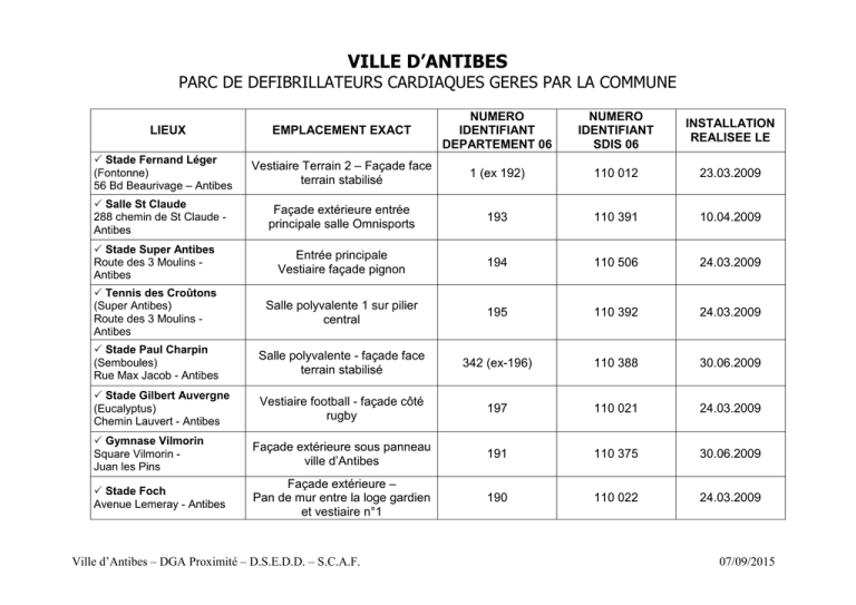 VILLE D’ANTIBES PARC DE DEFIBRILLATEURS CARDIAQUES GERES PAR LA COMMUNE EMPLACEMENT EXACT NUMERO IDENTIFIANT DEPARTEMENT 06 NUMERO IDENTIFIANT SDIS 06 INSTALLATION REALISEE LE Stade Fernand Léger (Fontonne) 56 Bd Beaurivage – Antibes Vestiaire Terrain 2 – Façade face terrain stabilisé 1 (ex 192) 110 012 23.03.2009 Salle St Claude 288 chemin de St Claude Antibes Façade extérieure entrée principale salle Omnisports 193 110 391 10.04.2009 Stade Super Antibes Route des 3 Moulins Antibes Entrée principale Vestiaire façade pignon 194 110 506 24.03.2009 Tennis des Croûtons (Super Antibes) Route des 3 Moulins Antibes Salle polyvalente 1 sur pilier central 195 110 392 24.03.2009 Stade Paul Charpin (Semboules) Rue Max Jacob - Antibes Salle polyvalente - façade face terrain stabilisé 342 (ex-196) 110 388 30.06.2009 Stade Gilbert Auvergne (Eucalyptus) Chemin Lauvert - Antibes Vestiaire football - façade côté rugby 197 110 021 24.03.2009 Gymnase Vilmorin Square Vilmorin Juan les Pins Façade extérieure sous panneau ville d’Antibes 191 110 375 30.06.2009 Stade Foch Avenue Lemeray - Antibes Façade extérieure – Pan de mur entre la loge gardien et vestiaire n°1 190 110 022 24.03.2009 LIEUX Ville d’Antibes – DGA Proximité – D.S.E.D.D. – S.C.A.F. 07/09/2015 Stade Fort Carré Avenue du 11 Novembre Antibes Centre Croix Rouge Chemin des Terriers Antibes Villa Eilen Roc Avenue Beaumont Cap d’Antibes Loge gardien – Façade terrain à gauche du panneau d’affichage 189 110 019 23.03.2009 Nouvelle salle à droite de l’entrée – Pan de mur extrême droite 188 110 390 30.06.2009 Entrée sud sous porche – mur à droite de la porte d’entrée 187 110 378 30.06.2009 Mairie Annexe de la Fontonne Place Jean Aude – Antibes Mur façade entre mairie annexe et pharmacie 2 (ex 186) 110 013 23.03.2009 Antibes Centre Ville Rue de la République – Antibes Mur toilettes publics - 2ème vitre en partant de la gauche 205 110 376 19.01.2010 206 110 015 07.10.2009 207 110 510 05.03.2010 208 110 389 08.07.2010 209 110 374 02.10.2009 210 110 373 07.10.2009 305 110 377 04.08.2010 Hôtel de Ville / Marché Couvert Devant le Service Courrier 22 cours Masséna – Antibes Juan Centre Passage Couvert Carrefour de la Joie – Mur à gauche de la vitrine du Juan les Pins magasin architecture Les Semboules Locaux « Association Culture & Place Charles Cros – Sports Adaptés » Antibes Pignon droit sous terrasse Antibes Les Pins Façade Mairie Annexe – Vitre Place André Malraux – extérieure droite Antibes les Pins Office de Tourisme Juan Avenue Courbet sur portion Avenue Amiral Courbet – marbre jouxtant mairie annexe Juan les Pins Musée Picasso A l’intérieur du Musée Picasso au Place Mariejol niveau de l’accueil Antibes Ville d’Antibes – DGA Proximité – D.S.E.D.D. – S.C.A.F. 07/09/2015 Salle Antibes Azur Arena ZI des Trois Moulins Antibes Salle Antibes Azur Arena ZI des Trois Moulins Antibes Plage en Régie RICHELIEU 23 boulevard Baudoin Juan Les Pins Batiment Municipal Foch Boulevard Foch – Antibes Palais des Congrès 60 chemin des Sables Juan Les Pins Stade Nautique Avenue Jules Grec – Antibes Hall d’entrée de la salle A définir Eté 2013 A l’intérieur de la salle de basket A définir Eté 2013 - A l’intérieur de la plage pendant la période estivale (01/06 – 30/09) - au sein du Service Mer & Littoral 43 avenue Pasteur Antibes hors période estivale A définir Août 2014 A l’extérieur du bâtiment devant le BIJ A définir Avril 2015 A l’intérieur du Palais des Congrès au niveau de l’accueil Niveau +1 A définir Avril 2015 Défibrillateur non géré par la convention SDIS 06 En fonction avant 2008 Au bord des bassins intérieurs Ville d’Antibes – DGA Proximité – D.S.E.D.D. – S.C.A.F. Défibrillateur non géré par la convention CG 06 07/09/2015