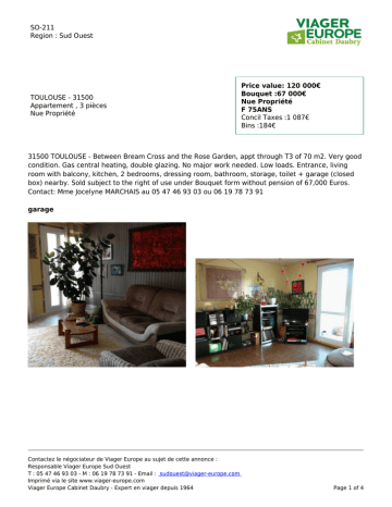 SO-211 Region : Sud Ouest TOULOUSE - 31500 Appartement , 3 pièces Nue Propriété Price value: 120 000€ Bouquet :67 000€ Nue Propriété F 75ANS Concil Taxes :1 087€ Bins :184€ 31500 TOULOUSE - Between Bream Cross and the Rose Garden, appt through T3 of 70 m2. Very good condition. Gas central heating, double glazing. No major work needed. Low loads. Entrance, living room with balcony, kitchen, 2 bedrooms, dressing room, bathroom, storage, toilet + garage (closed box) nearby. Sold subject to the right of use under Bouquet form without pension of 67,000 Euros. Contact: Mme Jocelyne MARCHAIS au 05 47 46 93 03 ou 06 19 78 73 91 garage Contactez le négociateur de Viager Europe au sujet de cette annonce : Responsable Viager Europe Sud Ouest T : 05 47 46 93 03 - M : 06 19 78 73 91 - Email : [email protected] Imprimé via le site www.viager-europe.com Viager Europe Cabinet Daubry - Expert en viager depuis 1964 Page 1 of 4 SO-211 Region : Sud Ouest Contactez le négociateur de Viager Europe au sujet de cette annonce : Responsable Viager Europe Sud Ouest T : 05 47 46 93 03 - M : 06 19 78 73 91 - Email : [email protected] Imprimé via le site www.viager-europe.com Viager Europe Cabinet Daubry - Expert en viager depuis 1964 Page 2 of 4 SO-211 Region : Sud Ouest Contactez le négociateur de Viager Europe au sujet de cette annonce : Responsable Viager Europe Sud Ouest T : 05 47 46 93 03 - M : 06 19 78 73 91 - Email : [email protected] Imprimé via le site www.viager-europe.com Viager Europe Cabinet Daubry - Expert en viager depuis 1964 Page 3 of 4 SO-211 Region : Sud Ouest Consommations énergétiques Emissions de gaz à effet de serre E 253 F 59 Contactez le négociateur de Viager Europe au sujet de cette annonce : Responsable Viager Europe Sud Ouest T : 05 47 46 93 03 - M : 06 19 78 73 91 - Email : [email protected] Imprimé via le site www.viager-europe.com Viager Europe Cabinet Daubry - Expert en viager depuis 1964 Page 4 of 4
