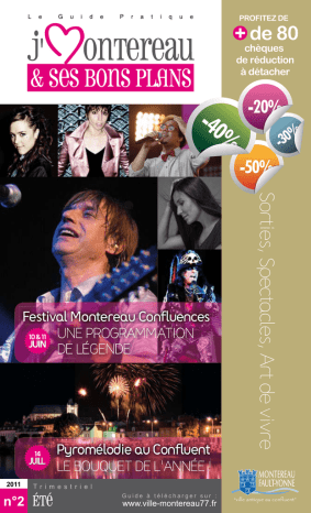 L e G u i d e P r a t i q u e PROFITEZ DE chèques de réduction à détacher -40 % -20% % -30 -50% 2011 romlodie au Confluent 'A ! Tr i m e s t r i e l n°2 été Guide à télécharger sur : www.ville-montereau77.fr Sorties, Spectacles, Art de vivre estival Montereau Confluenes PAMMA N Vos romans de vacances disponibles tout l'été ! 56 000 ouvrages dont 27 000 pour la jeunesse, 9 postes multimédias Médiathèque Alain Peyrefitte (Ville Haute) Maison des services Publics 3, rue André Thomas Tél. : 01 60 57 21 26 Médiathèque Gustave Flaubert (Ville Basse) Halle Nodet 5bis, boulevard du Mal Leclerc Tél. : 01 64 70 38 95 (espace adultes) Tél. : 01 64 70 38 94 (espaces enfants) Les deux médiathèques sont ouvertes tout l’été Catalogue, réservations, informations : http://montereau77.bibli.fr blog des médiathèques : http://mediathèques-montereau.eklablog.fr/ Voil l'été ! A commencer par le 15ème Festival Montereau Confluences, les 10 et 11 juin. D’emblée le ton est donné avec ce grand rendezvous populaire qui attire plus de 40 000 spectateurs. Le temps d’un week-end, les grands noms de la musique tels Zazie, JeanLouis Aubert ou Alice Cooper deviennent un luxe accessible à tous (12 € le pass 2 jours) et le Parc des Noues se transforme en une gigantesque salle de concert. Vous aussi, laissez-vous gagner par la magie du Festival ! Le mois de juillet va nous époustoufler, tant par l’exploit sportif de la mythique Traversée de Montereau à la nage le 10 juillet, que par le grandiose spectacle pyro-mélodique du 14 juillet, lancé à la Pointe du Confluent. Les 29 et 30 juillet, les plus jeunes seront les rois de la Fête de l’Anim’ et leurs aînés pourront les rejoindre le soir pour un cinéma en plein air sur le Parc des Noues. En août, les spécialistes de la pétanque pourront profiter à loisir de concours très « pointus »… Voilà les événements marquants de cette saison, détaillés au fil des pages de ce magazine. Toutes les occasions sont bonnes pour venir célébrer l’été à Montereau… Vous pourrez encore le constater avec les « chèques bons plans » de nos commerçants que vous trouverez dans le cahier central, une formule que vous avez plébiscitée dès le premier numéro de ce guide. yves Jégo, Maire de Montereau-fault-Yonne Député de Seine-et-Marne Hôtel de Ville - 54, rue Jean Jaurès - 77875 Montereau cedex - Tél. : 01 64 70 44 00 - Fax : 01 64 70 44 46 - www.montereau77.fr Responsable de publication : Chantal Jamet, adjointe au Maire chargée de la Communication • Rédacteur en chef : Bertrand Leclair, Directeur de la Communication • Secrétaire de rédaction : Caroline Legrais • Rédaction : Caroline Legrais, Jérôme Lefier, Mylène Goude, Bertrand Leclair, Erwan Feuilletin • Crédits photos : Service Communication, Chantal Jamet, Phox Bracq Photo Montereau, Patrick Armipertis, Les Pictographistes, Jean-Michel Muyl, Alain Desplats, Dominique Bruneau, Fotolia.fr • Charte graphique et mise en page : www.liberte-expression.com • Imprimeur : La Galiote-Prenant • Dépôt légal : Mars 2011 Si vous souhaitez faire de la publicité dans ce magazine ou participer aux « chèques bons plans », contactez Erwan Feuilletin au 06 78 42 71 30. Sorties, Spectacles, Art de vivre Nous l'avons tant attendu ! Trois mois pour profiter d’une certaine douceur de vivre, et naturellement, Montereau sera de la fête ! Dimanche 19 juin 2011 Vi de-Greni er Montereau-fault-Yonne en centre-ville Informations au 01 64 32 10 08 Inscriptions jusqu'au 11 juin inclus au Magasin SMART - 22, rue Jean-Jaurès sommaire Sorties, Spectacles, Art de vivre 2011 © Patrick Armipertis n°2 été Se distraire Art de vivre • L’agenda de vos loisirs • Festival Montereau Confluences • Feu d’artifice • Tourisme au Confluent • Mode in Montereau • Tous-éco motivés ! • Rétro-Montereau P.6/13 S'informer • Mouv’in Montereau P.14 Chèques « b ns plans » P.15/36 P.37/41 Côté pratique • Carnet d’adresses • Plan de Montereau P.42/51 P.6 Se distraire 'aenda de vos l isirs uin 4 et 5 uin : Camionnat de eine et Marne d'tltisme individuels adets seniors 7 h / 18 h : stade Jean Bouin - Infos : 01 60 57 21 12 4 au 26 uin : osition astels de atalie oussa Musée de la Faïence - Infos : 01 64 32 95 64 5 uin : euiem de olfan madeus Moart Le chef-d’œuvre inachevé de Mozart, interprété avec superbe par trois formations lyriques et l’orchestre Ars Fidelis. 17 h : Collégiale Notre-Dame et Saint-Loup - Infos / réservations : 01 60 74 74 30 5 uin : estival de danses folloriues du ortual Amicale Culturelle et Sportive des Portugais de Montereau 7, rue du Pré Rebourg - Infos : 01 60 96 12 71 10meet 11 uin : 15 estival Montereau Confluenes L’événement incontournable Parc des Noues Infos : 01 64 70 44 14 - www.festivalmontereau.com 18 uin : tae ado CSM Cercle d’Arts Martiaux 13 h 30 / 18 h 30 : Complexe Jacky Boiché (petit dojo) - Infos / inscriptions : 01 60 57 21 12 19 uin : te de l't en musiue 13 h / 19 h : Place Jean XXIII - Infos : 01 60 57 21 08 19 uin : iderenier du otarClu 1001 trouvailles sont à chiner au coin des rues de Montereau ! Infos : 01 64 32 10 08 19 uin : etales et auditions des teliers d'art dramatiue 17 h : Conservatoire de musique Gaston Litaize, Auditorium Maurice Ravel - Infos : 01 60 74 74 30 Se distraire 26 uin : 2 Tournois de site foot seniors et vtrans Parc des Noues - Infos / inscriptions : 06 73 26 86 66 uillet 2 uillet : and all Callene C Centre Omnisport Jean Allasseur - Infos : 01 60 57 21 12 2 au 31 uillet : osition de dessins d'lette iltenrand Musée de la Faïence - Infos : 01 64 32 95 64 © -M Muyl P.7 10 uillet : 2me Traverse de Montereau la nae 14 h : départ en face de l’école de la Poterie 15 h : départ Petite Traversée (800 m), quai des Bordes 16 h : départ Grande Traversée (2000 m), chemin de halage de l’Yonne Arrivée en face de l’école de la Poterie Infos / Inscriptions