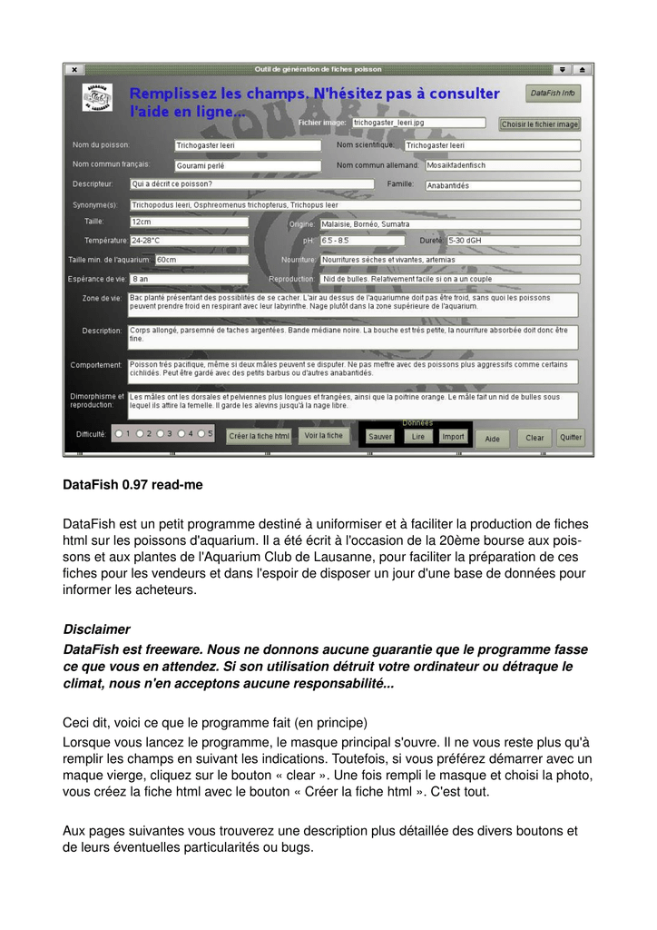 DataFish 0.97 readme DataFish est un petit programme destiné à uniformiser et à faciliter la production de fiches html sur les poissons d'aquarium. Il a été écrit à l'occasion de la 20ème bourse aux pois sons et aux plantes de l'Aquarium Club de Lausanne, pour faciliter la préparation de ces fiches pour les vendeurs et dans l'espoir de disposer un jour d'une base de données pour informer les acheteurs. Disclaimer DataFish est freeware. Nous ne donnons aucune guarantie que le programme fasse ce que vous en attendez. Si son utilisation détruit votre ordinateur ou détraque le climat, nous n'en acceptons aucune responsabilité... Ceci dit, voici ce que le programme fait (en principe) Lorsque vous lancez le programme, le masque principal s'ouvre. Il ne vous reste plus qu'à remplir les champs en suivant les indications. Toutefois, si vous préférez démarrer avec un maque vierge, cliquez sur le bouton « clear ». Une fois rempli le masque et choisi la photo, vous créez la fiche html avec le bouton « Créer la fiche html ». C'est tout. Aux pages suivantes vous trouverez une description plus détaillée des divers boutons et de leurs éventuelles particularités ou bugs. Fonctionnement des boutons Bouton « Aide » Le bouton « Aide » permet d'accéder à un résumé de ces explications. Bouton « Clear » Le bouton « Clear » permet de vider d'un coup tous les champs, pour travailler à partir d'une fiche vierge. Si vous disposez d'un fichier de sauvegarde (*.sav) ou d'un fichier html compatible (voir plus loin), vous pouvez ensuite « Lire » ou « Importer » des données dans les cases vides. Bouton « Quitter » Comme son nom l'indique, il permet de quitter le programme. Il n'y a pas de dia logue de confirmation, ni de sauvegarde. Bouton « DataFish Info » « DataFish Info » fournir quelques informations sur le programmeur et la version du programme. Bouton « Choisir le fichier image » Le bouton « choisir le fichier image » ouvre le dialogue dans le réper toire dans lequel se trouve le programme. Si ce n'est pas le cas, allez dans ce répertoire pour choisir la photo que vous voulez ajouter à la fiche. DANS TOUS LES CAS le chemin pour l'image sera celui du répertoire ou se trouve la fiche (./ pour les unixiens), étant don né que tout autre chemin changerait d'un utilisateur à l'autre... Placez donc vos photos dans le même répertoire que DataFish et vos fiches fonctionneront sans problème. Une remarque importante: l'interprétation des fichiers html se fait souvent selon les règles UNIX, et si votre fiche n'affiche pas la photo, le cause en est souvent que votre nom de fi chier contient des caractères accentués et/ou des espaces. Pour éviter les mauvaises sur prises, utilisez donc des noms de fichiers qui sont compatibles avec toutes les plate formes: pas d'accents et pas d'espaces: Mauvais nom de fichier: mon ancistrus doré.JPG Bon nom de fichier: ancistrus_dore.jpg Bouton « Créer la fiche html » Une fois la fiche terminée, cliquez sur « Créer la fiche html », la fiche sera créée (avec confirmation), das le répertoire depuis lequel vous avez lancé l'appplica tion. Vous pouvez maintenant modifier vos données pour la prochaine fiche (il est suggéré de travailler par famille de poissons pour minimiser l'édition). Bouton « Voir la fiche » Vous pouvez vous assurer de la création correcte de la fiche en utilisant l'afficheur html intégré – sachez toutefois qu'il n'est pas très efficace et peut ne pas rendre votre fiche de façon parfaite. Vérifiez donc avec un navigateur clas sique avant de refaire tout le travail (les fiches ont été contrôlées avec Opera et Seamon key sous Linux et MacOS X). Boutons spéciaux Trois boutons ont des fonctions spéciales, destinnées à vous faciliter la vie. Bouton « Sauver » Lorsque votre masque est rempli, vous pouvez enregistrer les données par « Données Sauver ». Le contenu de tous les champs (sauf le nom de la photo et le niveau de difficul té) sont sauvés dans un fichier texte (par défaut datafish.sav) dans le répertoire ou se trouve le programme. Vous pouvez changer le nom du fichier de sauvegarde si vous sou haitez disposer de vos données pour une autre fois. Notez que, bien que la boîte de dia logue vous permette de choisir un autre répetoire, la sauvegarde se fera TOUJOURS dans le répertoire depuis lequel vous avez lancé l'application (je ne sais pas pourquoi...) Bouton « Lire » Si vous cliquez sur le bouton « Données Lire », le contenu d'un fichier de sauvegarde est lu et remplace les données existantes – sauf le nom de la photo et le niveau de difficulté, et sans demander de confirmation. Seuls les fichiers *.sav de DataFish peuvent être char gés, tout autre fichier ne fournissant aucune information utilisable. Cette foisci la boîte de dialogue vous permet de charger un fichier *.sav situé ailleurs sur votre disque. Bouton « Import » Certains utilisateurs ont souhaité pourvoir reprendre les données d'une fiche existante (html) pour les éditer. Ce bouton permet maintenant de le faire (avec quelques restrictions). En fait, il faudra (faudrait?) probablement revoir complètement le code html de la fiche html pour optimiser ce processus. Pour l'heure, si vous cliquez sur « Import », une fenêtre de dialogue s'ouvre qui vous per met de sélectionner une fiche html. Il y toutefois plusieurs caveats: • Seuls des fichiers html peuvent être ouverts (cela semble logique) • Seuls des fichiers html créés par DataFish dans une version égale ou supé rieure à 0.97 peuvent être ouverts. Ceci est du au fait qu'il a fallu modifier le code de création de la fiche html pour pouvoir retrouver les champs. Une fiche plus an cienne peut être éditée à la main le cas échéant, mais ce n'est guère pratique... La routine a été testée (sur toutes les plateformes) avec la fiche de base (Fiche Type.html) et fonctionne. Mais avec les autres fiches, il arrive qu'