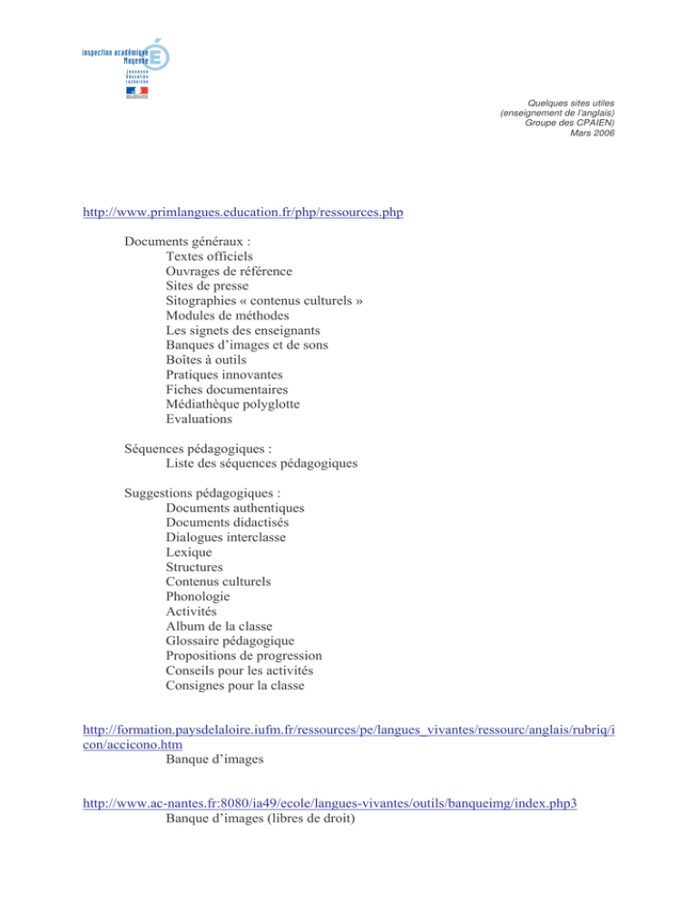 Quelques sites utiles (enseignement de l’anglais) Groupe des CPAIEN) Mars 2006 ! " # $ "% & ' # ( )# + # * # # ! # # # ! # , ' -. / ' , , # * 0 " # $ 1 " # 2323 45 $ 7. 1 8 .# . # 6 Quelques sites utiles (enseignement de l’anglais) Groupe des CPAIEN) Mars 2006 9 :; . # .. < . . .# * * < . * .. # .6 . < " < =* . * *. 1 + . # . # :>? 0 :4? 0 9 0 A < (B < * C 1D < .. < "", < 0 :;@ >:;? 0 Quelques sites utiles (enseignement de l’anglais) Groupe des CPAIEN) Mars 2006 / < E E