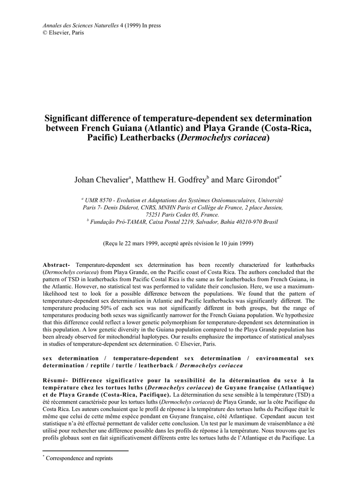 Annales des Sciences Naturelles 4 (1999) In press © Elsevier, Paris Significant difference of temperature-dependent sex determination between French Guiana (Atlantic) and Playa Grande (Costa-Rica, Pacific) Leatherbacks (Dermochelys coriacea) Johan Chevaliera , Matthew H. Godfreyb and Marc Girondota* a UMR 8570 - Evolution et Adaptations des Systèmes Ostéomusculaires, Université Paris 7- Denis Diderot, CNRS, MNHN Paris et Collège de France, 2 place Jussieu, 75251 Paris Cedex 05, France. b Fundação Pró-TAMAR, Caixa Postal 2219, Salvador, Bahia 40210-970 Brasil (Reçu le 22 mars 1999, accepté après révision le 10 juin 1999) Abstract- Temperature-dependent sex determination has been recently characterized for leatherbacks (Dermochelys coriacea) from Playa Grande, on the Pacific coast of Costa Rica. The authors concluded that the pattern of TSD in leatherbacks from Pacific Costal Rica is the same as for leatherbacks from French Guiana, in the Atlantic. However, no statistical test was performed to validate their conclusion. Here, we use a maximumlikelihood test to look for a possible difference between the populations. We found that the pattern of temperature-dependent sex determination in Atlantic and Pacific leatherbacks was significantly different. The temperature producing 50% of each sex was not significantly different in both groups, but the range of temperatures producing both sexes was significantly narrower for the French Guiana population. We hypothesize that this difference could reflect a lower genetic polymorphism for temperature-dependent sex determination in this population. A low genetic diversity in the Guiana population compared to the Playa Grande population has been already observed for mitochondrial haplotypes. Our results emphasize the importance of statistical analyses in studies of temperature-dependent sex determination. © Elsevier, Paris. s e x determination / temperature-dependent s e x determination / determination / reptile / turtle / leatherback / Dermochelys coriacea environmental sex Résumé- Différence significative pour la sensibilité de la détermination du sexe à la température chez les tortues luths (Dermochelys coriacea) de Guyane française (Atlantique) et de Playa Grande (Costa-Rica, Pacifique). La détermination du sexe sensible à la température (TSD) a été récemment caractérisée pour les tortues luths (Dermochelys coriacea) de Playa Grande, sur la côte Pacifique du Costa Rica. Les auteurs concluaient que le profil de réponse à la température des tortues luths du Pacifique était le même que celui de cette même espèce pondant en Guyane française, côté Atlantique. Cependant aucun test statistique n’a été effectué permettant de valider cette conclusion. Un test par le maximum de vraisemblance a été utilisé pour rechercher une différence possible dans les profils de réponse à la température. Nous trouvons que les profils globaux sont en fait significativement différents entre les tortues luths de l’Atlantique et du Pacifique. La * Correspondence and reprints 2 J. Chevalier et al. température produisant 50% de chaque sexe n’est pas significativement différente entre les deux groupes, par contre l’intervalle de température produisant les deux sexes est significativement plus étroit pour les tortues luths pondant en Guyane française. Cet intervalle de température plus étroit pourrait refléter à une variabilité génétique plus faible pour ce caractère dans cette population. Une diversité génétique plus faible pour les femelles pondant en Guyane française en comparaison de celles pondant à Playa Grande a d’ailleurs déjà été démontrée pour l’ADN mitochondrial. Nos résultats renforcent la nécessité de l’utilisation de tests statistiques pour l’étude de la détermination du sexe sensible à la température. © Elsevier, Paris. détermination du sexe / détermination du sexe sensible à la température / détermination du sexe sensible à des facteurs de l’environnement / reptile / rortue / tortue luth / Dermochelys coriacea 1. INTRODUCTION Temperature-dependent sex determination (TSD) occurs in all marine turtle species (Dermochelys coriacea, Chelonia mydas, Eretmochelys imbricata, Lepidochelys olivacea, Lepidochelys kempii, Caretta caretta, Natator depressus) [14, 17, S. Hewavisenthi, pers. comm.]. However, the exact patterns of sex ratio response to different temperatures and differences among populations are not well known. The best analyzed species to date is Caretta caretta, in which 6 different populations have been analyzed [11, 12, 13] and exhibit some degree of differentiation among populations [6]. Recently the pattern of TSD for Dermochelys coriacea nesting at Playa Grande (Pacific coast of Costa Rica) was described by Binckley et al. [1] and the authors proposed that Pacific leatherbacks exhibit a pattern of TSD similar to the pattern observed for French Guiana (Atlantic) turtles [19, 20]. This information is particularly interesting because genetic differences between Atlantic and Pacific females for mitochondrial DNA have been observed [4]. Morover, initial results obtained using nuclear microsatellites indicate also a genetic differentiation between Atlantic and Pacific leatherbacks [3]. However, a rigorous comparison of TSD pattern has not been performed. Therefore, we conducted a maximumlikelihood statistical procedure to derive the pivotal temperature (the constant temperature producing both sexes in equal amounts) and the transitional range of temperature (TRT, range of incubation temperatures producing both sexes) for Playa Grande leatherbacks [6]. These values were used to evaluate if the observed distribution of males and females for each incubation temperature from French Guiana leatherbacks is compatible with the values expected if TSD distributions for both sites were the same. 2. MATERIALS AND METHODS Data for sex determination in French Guiana leat