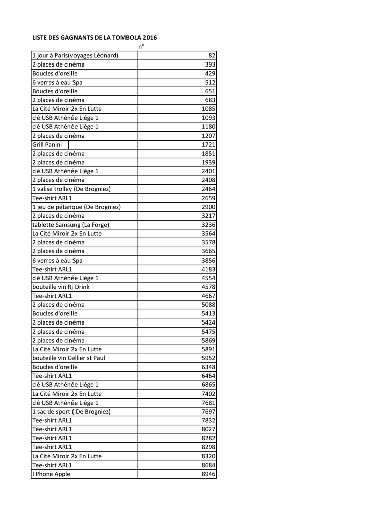 LISTE DES GAGNANTS DE LA TOMBOLA 2016 n° 1 jour à Paris(voyages Léonard) 2 places de cinéma Boucles d'oreille 6 verres à eau Spa Boucles d'oreille 2 places de cinéma La Cité Miroir 2x En Lutte clé USB Athénée Liège 1 clé USB Athénée Liège 1 2 places de cinéma Grill Panini 2 places de cinéma 2 places de cinéma clé USB Athénée Liège 1 2 places de cinéma 1 valise trolley (De Brogniez) Tee-shirt ARL1 1 jeu de pétanque (De Brogniez) 2 places de cinéma tablette Samsung (La Forge) La Cité Miroir 2x En Lutte 2 places de cinéma 2 places de cinéma 6 verres à eau Spa Tee-shirt ARL1 clé USB Athénée Liège 1 bouteille vin Rj Drink Tee-shirt ARL1 2 places de cinéma Boucles d'oreille 2 places de cinéma 2 places de cinéma 2 places de cinéma La Cité Miroir 2x En Lutte bouteille vin Cellier st Paul Boucles d'oreille Tee-shirt ARL1 clé USB Athénée Liège 1 La Cité Miroir 2x En Lutte clé USB Athénée Liège 1 1 sac de sport ( De Brogniez) Tee-shirt ARL1 Tee-shirt ARL1 Tee-shirt ARL1 Tee-shirt ARL1 La Cité Miroir 2x En Lutte Tee-shirt ARL1 I Phone Apple 82 393 429 512 651 683 1085 1093 1180 1207 1721 1851 1939 2401 2408 2464 2659 2900 3217 3236 3564 3578 3665 3856 4183 4554 4578 4667 5088 5413 5424 5475 5869 5891 5952 6348 6464 6865 7402 7681 7697 7832 8027 8282 8298 8320 8684 8946 2 places de cinéma clé USB Athénée Liège 1 clé USB Athénée Liège 1 bouteille vin Cellier st Paul Boucles d'oreille 2 places de cinéma Sac Kenzo (Parisxl) Ecouteurs(London) 2 places de cinéma 2 places de cinéma clé USB Athénée Liège 1 2 places de cinéma bouteille vin Cellier st Paul 2 places de cinéma clé USB Athénée Liège 1 Dictionnaire anglais Samsung Galaxy j 3 Drap de plage Azzaro (Paris xl) casque audio Logitech 1 drap de bain Rochas 2 places de cinéma Boucles d'oreille 2 places de cinéma 2 places de cinéma 2 places de cinéma Sac Givenchy(Paris xl) Friteuse Domo Sous-verre Portable - tablette ASUS bouteille vin Cellier st Paul Samsung Galaxy s III mini clé USB Athénée Liège 1 bouteille vin Rj Drink clé USB Athénée Liège 1 I Pad Apple Disque dur externe(Fermatique) 2 places de cinéma Boucles d'oreille 2 places de cinéma clé USB Athénée Liège 1 clé USB Athénée Liège 1 bouteille vin Cellier st Paul 1 jour à Paris(voyages Léonard) clé USB Athénée Liège 1 2 places de cinéma Boucles d'oreille clé USB Athénée Liège 1 2 places de cinéma clé USB Athénée Liège 1 Tee-shirt ARL1 8951 9169 9222 9246 9348 9814 9862 9925 10197 10343 10389 10564 10601 10689 10782 10869 11088 11113 11208 11382 11538 11881 12492 12568 12933 12958 13026 13322 13638 13391 13628 13690 13907 14088 14149 14224 14309 14495 14568 14728 14839 14928 15102 15340 15383 15387 15527 15535 15780 15956 clé USB Athénée Liège 1 Samsung Galaxy j 3 Boucles d'oreille 2 places de cinéma 1 jeu de pétanque (De Brogniez) Sous-verre 2 places de cinéma clé USB Athénée Liège 1 6 verres long drink cristal La Cité Miroir 2x En Lutte Senseo 1 sorbetière(De Brogniez) clé USB Athénée Liège 1 2 places de cinéma Boucles d'oreille 15966 16008 16035 16134 16393 16991 17196 17378 17389 17436 17497 17619 17756 17830 17919 Les lots sont à retirer auprès de Ch. Barbarossa au prêt des livres à partir du 12 mai jusqu'au 28 juin inclus. Merci à tous les vendeurs A l'année prochaine. Christine Barbarossa