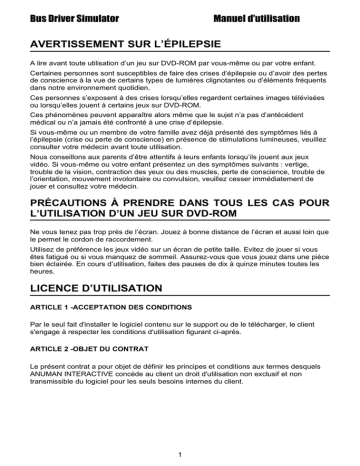 Bus Driver Simulator Manuel d'utilisation AVERTISSEMENT SUR L’ÉPILEPSIE A lire avant toute utilisation d’un jeu sur DVD-ROM par vous-même ou par votre enfant. Certaines personnes sont susceptibles de faire des crises d’épilepsie ou d’avoir des pertes de conscience à la vue de certains types de lumières clignotantes ou d’éléments fréquents dans notre environnement quotidien. Ces personnes s’exposent à des crises lorsqu’elles regardent certaines images télévisées ou lorsqu’elles jouent à certains jeux sur DVD-ROM. Ces phénomènes peuvent apparaître alors même que le sujet n’a pas d’antécédent médical ou n’a jamais été confronté à une crise d’épilepsie. Si vous-même ou un membre de votre famille avez déjà présenté des symptômes liés à l’épilepsie (crise ou perte de conscience) en présence de stimulations lumineuses, veuillez consulter votre médecin avant toute utilisation. Nous conseillons aux parents d’être attentifs à leurs enfants lorsqu’ils jouent aux jeux vidéo. Si vous-même ou votre enfant présentez un des symptômes suivants : vertige, trouble de la vision, contraction des yeux ou des muscles, perte de conscience, trouble de l’orientation, mouvement involontaire ou convulsion, veuillez cesser immédiatement de jouer et consultez votre médecin. PRÉCAUTIONS À PRENDRE DANS TOUS LES CAS POUR L’UTILISATION D’UN JEU SUR DVD-ROM Ne vous tenez pas trop près de l’écran. Jouez à bonne distance de l’écran et aussi loin que le permet le cordon de raccordement. Utilisez de préférence les jeux vidéo sur un écran de petite taille. Evitez de jouer si vous êtes fatigué ou si vous manquez de sommeil. Assurez-vous que vous jouez dans une pièce bien éclairée. En cours d’utilisation, faites des pauses de dix à quinze minutes toutes les heures. LICENCE D’UTILISATION ARTICLE 1 -ACCEPTATION DES CONDITIONS Par le seul fait d'installer le logiciel contenu sur le support ou de le télécharger, le client s'engage à respecter les conditions d'utilisation figurant ci-après. ARTICLE 2 -OBJET DU CONTRAT Le présent contrat a pour objet de définir les principes et conditions aux termes desquels ANUMAN INTERACTIVE concède au client un droit d'utilisation non exclusif et non transmissible du logiciel pour les seuls besoins internes du client. 1 Bus Driver Simulator Manuel d'utilisation ARTICLE 3 - OFFRE DE LICENCE En acquérant le support inclus ou en téléchargeant le logiciel, le client bénéficie d'une licence d'utilisation du logiciel contenu sur ce support ou téléchargé. Cette licence donne uniquement le droit d'effectuer une seule installation du logiciel, et de le faire fonctionner conformément à sa destination, sur le matériel prévu. Ce logiciel livré dans sa version code-objet est directement lisible par l'ordinateur. ARTICLE 4 – DUREE DU CONTRAT Cette licence est valable pour la durée légale de la protection du logiciel, sous réserve du respect des conditions d'utilisation du logiciel. ARTICLE 5 - OBLIGATION DU CLIENT - Le client s’engage à ne pas procéder ou faire procéder à une reproduction, hormis la copie de sauvegarde, ou une modification, partielle ou totale du logiciel, quelle qu’en soit la forme. Lorsque le logiciel est fourni sur un support numérique garantissant sa préservation, le support original tient lieu de copie de sauvegarde au sens de l'article L 122-6-1 du code de la propriété intellectuelle. - Le client s’engage à ne pas réaliser, ni distribuer de copies du logiciel, ni transférer électroniquement le logiciel d’un ordinateur à un autre ou sur un réseau. - Le client s’engage à ne pas altérer, fusionner, modifier, adapter ou convertir le logiciel, à ne pas décompiler (ingénierie inverse), désosser, désassembler ou autrement réduire le logiciel à une forme déchiffrable. - Le logiciel est conçu pour un l’usage strictement privé du client, qui s’engage donc à ne pas louer, prêter à bail, commercialiser ou accorder de sous-licence du logiciel. - Le client s’engage à ne pas modifier le logiciel ni créer de travaux dérivés basés sur le logiciel. De manière générale, il est strictement interdit d'en faire l'objet ou l'instrument d'une utilisation qui bénéficie à un tiers, que ce soit à titre gratuit ou onéreux. Ces restrictions concernent le logiciel pris dans son ensemble mais également dans toutes ses composantes : ainsi, les photographies, images, cliparts, sons, textes et tous autres éléments contenus dans le logiciel, restent la propriété de leurs créateurs. ARTICLE 6 - RESPONSABILITE ANUMAN est soumis à une obligation de moyen, à l'exclusion de toute autre. Il garantit la conformité du logiciel aux spécifications décrites dans sa documentation. Le client à toutes les responsabilités autres que celle de conformité du logiciel aux spécifications et notamment celles qui concernent : - l'adéquation du logiciel à ses besoins, - l'exploitation du logiciel. 2 Bus Driver Simulator Manuel d'utilisation Le client reconnaît expressément avoir reçu d’ANUMAN INTERACTIVE toutes les informations nécessaires lui permettant d'apprécier l'adéquation du logiciel à ses besoins et de prendre toutes précautions utiles pour sa mise en oeuvre et son exploitation. ANUMAN INTERACTIVE ne sera en aucun cas tenu de réparer d'éventuels dommages directs ou indirects, même si il a été informé de la possibilité de tels dommages. Le client sera seul responsable de l'utilisation du logiciel. ARTICLE 7 - GARANTIES ANUMAN INTERACTIVE garantit le bon fonctionnement du logiciel téléchargé, sous réserve d’en faire un usage normal. Cependant, ANUMAN INTERACTIVE ne peut garantir que ses logiciels fonctionnent sur l'intégralité des systèmes. A ce titre le client est tenu de s’informer sur les caractéristiques du produit en se reportant sur les descriptions du produit présent sur le site. ANUMAN INTERACTIVE n'est