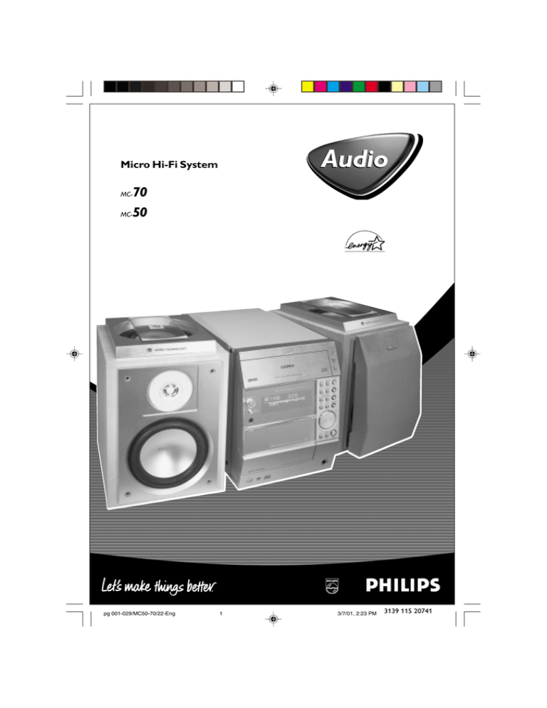 Audio Micro Hi-Fi System 70 MC- 50 MC- 1 pg 001-029/MC50-70/22-Eng 1 3/7/01, 2:23 PM 3139 115 20741 Important notes for users in the U.K. Italia DICHIARAZIONE DI CONFORMITA’ Mains plug This apparatus is fitted with an approved 13 Amp plug. To change a fuse in this type of plug proceed as follows: Si dichiara che l’apparecchio MC-50, MC-70 Philips risponde alle prescrizioni dell’art. 2 comma 1 del D.M. 28 Agosto 1995 n. 548. 1 2 Remove fuse cover and fuse. Fatto a Eindhoven 3 Refit the fuse cover. Fix new fuse which should be a BS1362 5 Amp, A.S.T.A. or BSI approved type. If the fitted plug is not suitable for your socket outlets, it should be cut off and an appropriate plug fitted in its place. If the mains plug contains a fuse, this should have a value of 5 Amp. If a plug without a fuse is used, the fuse at the distribution board should not be greater than 5 Amp. Philips Consumer Electronics Philips, Glaslaan 2 5616 JB Eindhoven, The Netherlands Norge Typeskilt finnes på apparatens underside. Note: The severed plug must be disposed of to avoid a possible shock hazard should it be inserted into a 13 Amp socket elsewhere. Observer: Nettbryteren er sekundert innkoplet. Den innebygde netdelen er derfor ikke frakoplet nettet så lenge apparatet er tilsluttet nettkontakten. How to connect a plug The wires in the mains lead are coloured with the following code: blue = neutral (N), brown = live (L). For å redusere faren for brann eller elektrisk støt, skal apparatet ikke utsettes for regn eller fuktighet. ¶ As these colours may not correspond with the colour markings identifying the terminals in your plug, proceed as follows: – Connect the blue wire to the terminal marked N or coloured black. – Connect the brown wire to the terminal marked L or coloured red. – Do not connect either wire to the earth terminal in the plug, marked E (or e) or coloured green (or green and yellow). Before replacing the plug cover, make certain that the cord grip is clamped over the sheath of the lead - not simply over the two wires. CAUTION Use of controls or adjustments or performance of procedures other than herein may result in hazardous radiation exposure or other unsafe operation. Copyright in the U.K. Recording and playback of material may require consent. See Copyright Act 1956 and The Performer’s Protection Acts 1958 to 1972. 2 pg 001-029/MC50-70/22-Eng 2 3/7/01, 2:23 PM 3139 115 20741 CD OPEN•CLOSE # CD 1 $ CD 2 3CD CD / CD-R / CD-RW COMPATIBLE CHANGER CD 3 % PLAY MICRO CD 1•2•3 STOP @ SYSTEM STANDBY-ON PAUSE 1 2 3 PREV DEMO STOP TUNER NEXT NEWS ! PRESET SEARCH/ TUNE TAPE ECO POWER PROG REC AUX/CDR iR VOL 4 OPEN 0 9 BASS TREBLE 8 7 6 PHONES 5 3 pg 001-029/MC50-70/22-Eng 3 3 3/7/01, 2:23 PM 3139 115 20741 DK SF Advarsel: Usynlig laserstråling ved åbning når sikkerhedsafbrydere er ude af funktion. Undgå utsættelse for stråling. Luokan 1 laserlaite Varoitus! Laitteen käyttäminen muulla kuin tässä käyttöohjeessa mainitulla tavalla saattaa altistaa käyttäjän turvallisuusluokan 1 ylittävälle näkymättömälle lasersäteilylle. Oikeus muutoksiin varataan. Laite ei saa olla alttiina tippu-ja roiskevedelle. Bemærk: Netafbryderen er sekundært indkoblet og ofbryder ikke strømmen fra nettet. Den indbyggede netdel er derfor tilsluttet til lysnettet så længe netstikket sidder i stikkontakten. S Klass 1 laseraparat Varning! Om apparaten används på annat sätt än i denna bruksanvisning specificerats, kan användaren utsättas för osynlig laserstrålning, som överskrider gränsen för laserklass 1. Huom.Toiminnanvalitsin on kytketty toisiopuolelle, eikä se kytke laitetta irti sähköverkosta. Sisäänrakennettu verkkoosa on kytkettynä sähköverkkoon aina silloin, kun pistoke on pistorasiassa. Observera! Stömbrytaren är sekundärt kopplad och bryter inte strömmen från nätet. Den inbyggda nätdelen är därför ansluten till elnätet så länge stickproppen sitter i vägguttaget. 4 pg 001-029/MC50-70/22-Eng 4 3/7/01, 2:23 PM 3139 115 20741 Sommaire Généralités Français Environnement .................................................... 31 Agrément ............................................................. 31 Accessoires fournis ............................................ 31 Consignes de sécurité ....................................... 31 Préparatifs Connexions arrière .................................... 32–33 Connexions facultatives .................................... 33 Installation des piles dans la télécommande 33 Utilisation du lecteur de cassettes / enregistrement Lecture d’une cassette ............................... 46–47 Généralités sur l’enregistrement .................... 47 Préparation avant l’enregistrement ................ 47 Enregistrement immédiat ................................. 47 Enregistrement synchronisé sur CD ............. 48 Enregistrement numérique à l’aide de la sortie numérique Digital Out ...................... 48 Sources externes Commandes Ecoute de sources externes ............................ 48 Commandes sur la chaîne et sur la télécommande ............................................. 34–35 Horloge / Temporisateur Fonctions de base Plug & Play ..................................................... 36–37 Mode de démonstration ................................... 37 Pour mettre le système en marche ................ 37 Pour mettre la chaîne en mode de veille ...... 37 Pour mettre la chaîne en mode de veille d’économie d’énergie ........................................ 37 Veille d’économie d’énergie ............................. 37 Mode de gradateur ............................................ 38 Réglage du volume ............................................. 38 Commande interactive du son ................. 38–39 Réglage de l’horloge .......................................... 49 Affichage de l’horloge ........................................ 49 Réglage du temporisateur ...