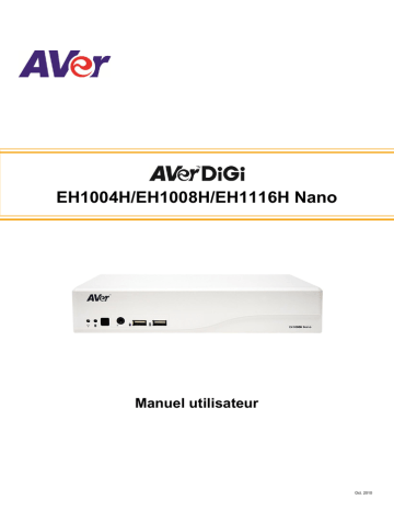EH1004H/EH1008H/EH1116H Nano Manuel utilisateur Oct. 2010 European Community Compliance Statement (Class A) This product is herewith confirmed to comply with the requirements set out in the Council Directives on the Approximation of the laws of the Member States relating to Electromagnetic Compatibility Directive 2004/108/EEC. Warning - This is a Class A product. In a domestic environment this product may cause radio interference in which case the user may be required to take adequate measures to correct this interference. DISCLAIMER No warranty or representation, either expressed or implied, is made with respect to the contents of this documentation, its quality, performance, merchantability, or fitness for a particular purpose. Information presented in this documentation has been carefully checked for reliability; however, no responsibility is assumed for inaccuracies. The information contained in this documentation is subject to change without notice. In no event will AVerMedia be liable for direct, indirect, special, incidental, or consequential damages arising out of the use or inability to use this product or documentation, even if advised of the possibility of such damages. TRADEMARKS AVerMedia, being authorized AVerMedia Information, Inc. to use, is registered trademarks of AVerMedia TECHNOLOGIES, Inc. “AVerDiGi” and “AVer” are trademarks (or registered trademarks) of AVerMedia Information, Inc. Other trademarks used herein for description purposes only belong to each of their respective companies. All other products or corporate names mentioned in this documentation are for identification and explanation purposes only, and may be trademarks or registered trademarks of their respective owners. COPYRIGHT © 2010 by AVerMedia Information, Inc. All rights reserved. No part of this publication may be reproduced, transmitted, transcribed, stored in a retrieval system, or translated into any language in any form by any means without the written permission of AVerMedia Information, Inc. The mark of Crossed-out wheeled bin indicates that this product must not be disposed of with your other household waste. Instead, you need to dispose of the waste equipment by handing it over to a designated collection point for the recycling of waste electrical and electronic equipment. For more information about where to drop off your waste equipment for recycling, please contact your household waste disposal service or the shop where you purchased the product. Informations de sécurité concernant les batteries - Stocker la batterie dans un endroit sec Ne jeter pas les batteries usages dans avec les ordures ménagères . Laisser les batteries dans un point de collecte pour les batteries usagées. Changer les batteries non utilises pendant une longue période. Changer les batteries de la télécommande. Les fuites occasionnées par les batteries peuvent endommager la télécommande. Ne pas mélanger les batteries neuves avec des batteries usagées. Ne pas mélanger plusieurs types de batteries: alkaline, standard (carbon-zinc) ou rechargeables (nickel-cadmium). Ne pas laisser les batteries auprès d'une source de chaleur. Les batteries pourraient fuire ou exploser. Ne jamais court circuiter les borniers des batteries . ATTENTION AFIN DE REDUIRE LES RISQUES D'INCENDIE NE PAS EXPOSER LE PRODUIT AUX MOISISSURES OU A L'HUMIDITE ATTENTION DANS LE CAS OU L'EMBALLAGE SERAIT DETERIORE, OU LIVRE AVEC DES ACESSOIRES MANQUANT, VEUILLEZ CONTACTER VOTRE REVENDEUR AFIN DE FAIRE JOUER LA GARANTIE. INFORMATION - LES INFORMATIONS CONTENUES DANS CE DOCUMENT POURRONT ETRE MODIFIEES SANS NOTICE PREALABLE. - LES INFORMATIONS DE CE MANUEL NE SONT PRECISEES QUE POUR REFENCE UNIQUEMENT. Table des matières Chapitre 1 Introduction .............................................................................................. 1 1.1 Contenu de l'emballage .......................................................................................................... 1 1.1.1 EH1004H-4 Nano ............................................................................................................... 1 1.1.2 EH1008H-4/EH1116H-4 Nano ............................................................................................ 1 1.1.3 Accessoires optionnels ....................................................................................................... 2 1.2 Panneau avant ........................................................................................................................ 2 1.2.1 EH1004H-4/EH1008H-4/EH1116H Nano ........................................................................... 2 1.3 Panneau arrière ...................................................................................................................... 3 1.3.1 EH1004H-4 Nano ............................................................................................................... 3 1.3.2 EH1008H-4/EH1116H-4 ..................................................................................................... 3 1.4 Configuration de l'enregistreur ................................................................................................ 5 1.4.1 Installation du disque dur.................................................................................................... 5 1.4.2 Connexion des autres périphériques .................................................................................. 7 1.5 Disposition des entrées senseurs, sorties relais et connexion PTZ ........................................ 9 1.5.1 Entrées et sorties audio ...................................................................................................... 9 1.5.2 Entrées et sorties senseurs ................................................................................................ 9 1.5.3 Sortie relais ........................................................................................................................ 9 1.5.4 Conne