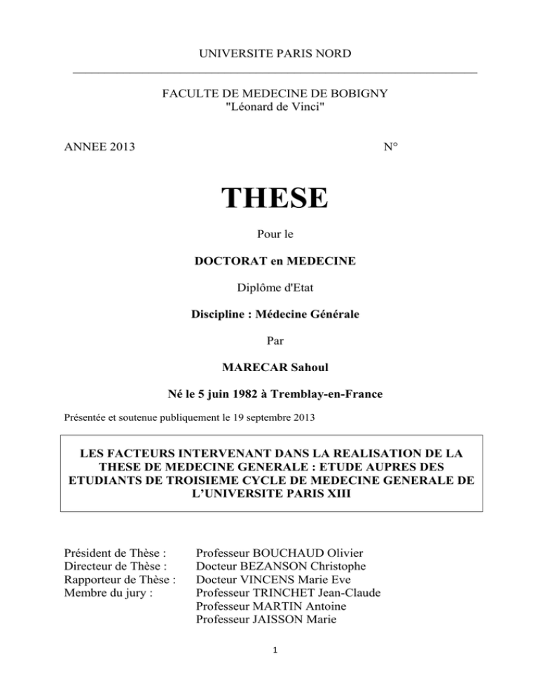 UNIVERSITE PARIS NORD ________________________________________________________________ FACULTE DE MEDECINE DE BOBIGNY "Léonard de Vinci" ANNEE 2013 N° THESE Pour le DOCTORAT en MEDECINE Diplôme d'Etat Discipline : Médecine Générale Par MARECAR Sahoul Né le 5 juin 1982 à Tremblay-en-France Présentée et soutenue publiquement le 19 septembre 2013 LES FACTEURS INTERVENANT DANS LA REALISATION DE LA THESE DE MEDECINE GENERALE : ETUDE AUPRES DES ETUDIANTS DE TROISIEME CYCLE DE MEDECINE GENERALE DE L’UNIVERSITE PARIS XIII Président de Thèse : Directeur de Thèse : Rapporteur de Thèse : Membre du jury : Professeur BOUCHAUD Olivier Docteur BEZANSON Christophe Docteur VINCENS Marie Eve Professeur TRINCHET Jean-Claude Professeur MARTIN Antoine Professeur JAISSON Marie 1 REMERCIEMENTS : A mon jury, A Monsieur le Professeur BOUCHAUD Olivier, qui nous a fait l’honneur de présider cette thèse. A Monsieur le Professeur TRINCHET Jean-Claude, qui a accepté de faire partie du jury. A Monsieur le Professeur MARTIN Antoine, qui a accepté de faire partie du jury. A Madame le Docteur VINCENS Marie-Eve, qui a accepté le rôle de rapporteur ainsi que celui de membre du jury. A Madame le Professeur JAISSON Marie qui m’a aidé et guidé dans l’élaboration de mon questionnaire et qui a accepté de faire partie du jury. Et mon immense reconnaissance et gratitude envers le Docteur BEZANSON Christophe, directeur de cette thèse, qui est à l’origine de ce travail. Et encore merci pour m’avoir soutenu et aidé. A mes maîtres de stages : Au Docteurs JACQ qui m’a appris la rigueur et l’implication. Au Docteur PEYREBRUNE qui m’a aidé à avoir un esprit plus « carré ». Merci pour l’aide qu’elle m’a apporté au cours de ce travail. Au Docteur RENAUDIN pour m’avoir donné le goût de la médecine générale et sa vision humaine de la médecine. Je me souviens encore de mon premier jour de stage où j’ai compris que j’avais trouvé ma voie. A ma mère, qui m’a toujours donné en exemple courage et volonté. A mon père, qui a est à l’origine de tous cela. Merci d’avoir cru en moi et de m’avoir soutenu jusqu’au bout. A mon frère, pour ses plaisanteries, son soutien informatique et son soutien tout court. A mes amis : Rani le photographe, Nordine le pilote, Sandra et la B.U. A ceux du ski : Benjamin, Pranesh, Nicolas Et merci à tous ceux qui ont m’ont aidé et encouragé pour la rédaction de cette thèse. 2 TABLE DES MATIERES REMERCIEMENTS : ....................................................................................................................................... 2 TABLE DES MATIERES ................................................................................................................................... 3 LISTE DES ABREVATIONS : ............................................................................................................................ 9 1 INTRODUCTION ................................................................................................................... 10 2 CONTEXTE ........................................................................................................................... 11 2.1 Organisation des études de médecine générale en France (5) .......................................... 11 2.2 Le premier cycle des études médicales (2) ......................................................................... 11 2.2.1 La Première Année commune aux Etudes de Santé (PAES) ............................................... 11 2.2.2 La deuxième année de médecine ....................................................................................... 12 2.2.3 La troisième année de médecine ........................................................................................ 12 2.3 Le deuxième cycle des études médicales (DCEM) (2) ......................................................... 12 2.4 Le troisième cycle des études médicales de médecine générale (8) .................................. 13 2.5 Les formations universitaires complémentaires................................................................. 15 2.5.1 Les diplômes d’études spécialisés complémentaires (DESC) (11) ...................................... 15 2.5.2 Les Diplômes universitaires (D.U.) ou Diplômes Interuniversitaires (D.I.U) ....................... 15 2.5.3 Les Masters ......................................................................................................................... 16 2.6 Le post-internat .................................................................................................................. 16 2.6.1 Le remplacement en médecine générale et les débuts dans la « vie professionnelle » (12)………….. ............................................................................................ 17 2.6.2 Le clinicat de médecine générale (14) ................................................................................ 18 3 L’université Paris 13 Bobigny .............................................................................................. 19 3.1 Histoire de la formation de médecine générale à Bobigny (15) ......................................... 19 3.2 L’université Paris XIII Bobigny (17) ..................................................................................... 21 3.3 Le département de médecine générale de Paris XIII Bobigny ............................................ 23 3.3.1 Composition du département de médecine générale ....................................................... 23 3.3.2 Les étudiants en troisième cycle de médecine générale .................................................... 24 4 La thèse ............................................................................................................................... 25 4.1 Qu’est-ce que la thèse d’exercice de médecine générale ? ...............