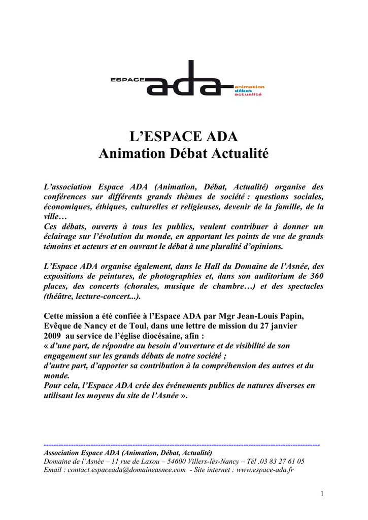 L’ESPACE ADA Animation Débat Actualité L’association Espace ADA (Animation, Débat, Actualité) organise des conférences sur différents grands thèmes de société : questions sociales, économiques, éthiques, culturelles et religieuses, devenir de la famille, de la ville… Ces débats, ouverts à tous les publics, veulent contribuer à donner un éclairage sur l’évolution du monde, en apportant les points de vue de grands témoins et acteurs et en ouvrant le débat à une pluralité d’opinions. L’Espace ADA organise également, dans le Hall du Domaine de l’Asnée, des expositions de peintures, de photographies et, dans son auditorium de 360 places, des concerts (chorales, musique de chambre…) et des spectacles (théâtre, lecture-concert...). Cette mission a été confiée à l’Espace ADA par Mgr Jean-Louis Papin, Evêque de Nancy et de Toul, dans une lettre de mission du 27 janvier 2009 au service de l’église diocésaine, afin : « d’une part, de répondre au besoin d’ouverture et de visibilité de son engagement sur les grands débats de notre société ; d’autre part, d’apporter sa contribution à la compréhension des autres et du monde. Pour cela, l’Espace ADA crée des événements publics de natures diverses en utilisant les moyens du site de l’Asnée ». ---------------------------------------------------------------------------------------------------------------Association Espace ADA (Animation, Débat, Actualité) Domaine de l’Asnée – 11 rue de Laxou – 54600 Villers-lès-Nancy – Tél .03 83 27 61 05 Email : [email protected] - Site internet : www.espace-ada.fr 1 Les manifestations de l’Espace ADA Conférences-débats 1 - La ville en refondation • 17 octobre 2008 : « La politique de rénovation Urbaine » par André Rossinot, Maire de Nancy et Jean-Marie Duthilleul, architecte. • 21 Novembre 2008 : « Le lien social » par Jean-Marie Schléret, Vice-Président de la communauté urbaine du Grand Nancy et Président de l’ARS (Association Accueil et Réinsertion Emploi). • 16 janvier 2009 : « La culture, c’est n’importe quoi ? » par Tanguy Wilhem, maître de conférence en sciences de l’information et de la communication à l’Université Nancy 2 • 27 Février 2009 : « La communauté catholique : quel repère dans la ville ? » par Monseigneur Defois. • 4 Mai 2015 : « 1945-1975 en Meruthe-et-Moselle : regards croisés sur 30 ans de constructions religieuses », par Lucile Pierron, doctorante en architecture (ENSA-Versailles, chercheur associé au LHAC (ENSA-Nancy) et Martine Tronquart, conservateur du patrimoine à l’Inventaire général-Région Lorraine. 2 - Prison (dans le cadre des Journées Nationales Prison) • 24 Novembre 2010 : « PRISON, Ensemble se la faire belle » avec Pierre Botton. Conférence-débat avec les associations intervenant dans les prisons pour un meilleur accueil et accompagnement des personnes détenues en vue de faciliter leur réinsertion. • 29 Novembre 2011 : « Prisons : activités dedans, insertion dehors ». Conférence-débat avec Gino Necchi, ancien Procureur de la République, Membre du contrôle général des lieux de privation de liberté. Avec des témoignages de détenu, de membres des associations locales accompagnant les personnes détenues en vue de favoriser leur réinsertion. Accompagnant cette conférence, une exposition sur les œuvres réalisées par des détenues était présentée dans le hall du Domaine de l’Asnée du 21 Novembre au 15 décembre 2011. Exposition réalisée avec le concours international des Aumôneries catholiques de Prisons. • 29 Novembre 2012 : projection au Caméo-Commanderie du film de Stéphane Mercurio « A l’ombre de la République », suivie d’un débat avec la participation de Jean-Marie Delarue, Contrôleur Général des lieux de privation de liberté et du réalisateur. Manifestation organisée par le Secours catholique et les associations du Groupe de Concertation Prison avec l’appui de l’Espace ADA. • 26 Novembre 2013 : « Prison et santé ». Table-ronde de Directeurs, médecins et psychologues de centres de détention. • 25 Novembre 2014 : « La vie après la peine » par Serge Portelli, président de chambre auprès de la Cours d’appel de Versailles • 26 Novembre 2015 : « Des peines de substitution à l’incarcération : laxisme ou opportunité ? » Projection du court-métrage « Travaux d’intérêt général : une chance de se réinsérer ? » suivie d’une table-ronde. 2 3 – Ethique et Bioéthique • 28 Avril 2009 : « Jusqu'à la mort, vivre dignement. Entre obstination thérapeutique et euthanasie, une troisième voie ? Les apports de la loi Leonetti. » par le Dr Marie-Sylvie Richard, médecin à la Maison Jeanne Garnier à Paris. • 5 Novembre 2009 : « Le droit à l'enfant, jusqu'où? Et les droits de l'enfant ? Donner et accueillir la vie, questions de bioéthique » par Xavier Lacroix, membre du comité consultatif national d’éthique. • 2012 : Cycle de 4 conférences-débat sur le thème « Le corps a ses raisons : en prendre soin, une approche globale » : - Mardi 10 Janvier 2012 : « Le corps dans toute sa diversité » par Hervé Marchal, sociologue, enseignant-chercheur à la Faculté de Lettres de Nancy 2 - Vendredi 27 Janvier 2012 : « Maladie et guérison du corps et de l’esprit » par Frère JeanMarie GUEULLETTE o.p., Médecin, Directeur du Centre Interdisciplinaire d'Ethique de l’Université Catholique de Lyon. - Jeudi 9 Février 2012 : « Soigner autrement, la quête contemporaine du bien-être et de la guérison » par Laurent DENIZEAU, Enseignant-chercheur à l’Université catholique de Lyon - Mardi 28 Février 2012 : « La vieillesse, une maladie ? » par Athanase BENETOS, Professeur de gériatrie et de biologie du vieillissement au CHU de Nancy. • 27 Janvier 2013 : « Euthanasie, le débat est-il clos ? » par Marine Lamoureux, journaliste à La Croix et co