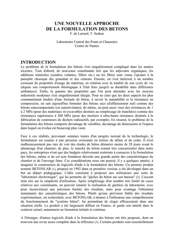 UNE NOUVELLE APPROCHE DE LA FORMULATION DES BETONS F. de Larrard, T. Sedran Laboratoire Central des Ponts et Chaussées Centre de Nantes INTRODUCTION Le problème de la formulation des bétons s'est singulièrement compliqué dans les années récentes. Tout d'abord, de nouveaux constituants tels que les adjuvants organiques, les additions minérales (cendres volantes, fillers etc.) ou les fibres sont venus s'ajouter à la panoplie classique des granulats et des ciments. Ensuite, on s'est intéressé à un nombre croissant de propriétés d'usage du matériau, en relation avec la totalité de son cycle de vie (depuis son comportement rhéologique à l'état frais jusqu'à sa durabilité dans différentes ambiances). Enfin, la gamme des propriétés que l'on peut atteindre avec les moyens industriels modernes s'est singulièrement élargie. Pour ne citer que les deux aspects les plus communément étudiés d'une formule de béton, à savoir la maniabilité et la résistance en compression, on sait aujourd'hui formuler des bétons secs (d'affaissement nul) comme des bétons autocompactants (ou autonivelants); de même, on peut aussi viser des résistances de 1 à 2 MPa (pour des matériaux ré-excavables destinés au remplissage de tranchées) comme des résistances supérieures à 200 MPa (pour des mortiers à ultra-haute résistance destinés à la fabrication de conteneurs de déchets radioactifs, par exemple). En résumé, le problème de la formulation des bétons comporte davantage de variables, davantage de dimensions et l'espace dans lequel on évolue est beaucoup plus vaste. Face à ces réalités, provenant sommes toutes d'un progrès normal de la technologie, le formulateur est soumis à une pression croissante en termes de délais et de coûts. Il n'est malheureusement pas rare de voir des études de béton démarrer moins de 28 jours avant le démarrage d'un chantier; de plus, le marché du béton restant très concurrentiel dans notre pays, les entreprises n'ont que des budgets relativement restreints à consacrer à la formulation des bétons, même si de cet acte fondateur découle une grande partie des caractéristiques du chantier et de l'ouvrage futur. Ces considérations nous ont poussé, il y a quelques années, à imaginer la construction de logiciels d'aide à la formulation des bétons. Un premier produit nommé BETONLAB [1], proposé en 1992 dans sa première version, a été développé dans un but au départ pédagogique. L'idée consistait à proposer aux utilisateurs une sorte de "laboratoire électronique", qui lui permette de "gâcher du béton sur son bureau" [2]. L'accent était mis sur la simplicité d'utilisation. Après remplissage d'un nombre très limité de cases relatives aux constituants, on pouvait simuler la réalisation de gâchées de laboratoire, avec pour inconvénient une précision limitée des résultats, mais pour avantage l'obtention instantanée des caractéristiques des bétons. Plutôt qu'une prévision fidèle des résultats expérimentaux, on recherchait, avec BETONLAB, à donner à l'utilisateur une compréhension du fonctionnement du "système béton", lui permettant de réagir efficacement dans une situation réelle. Le produit a été largement diffusé en France, et garde son intérêt dans le contexte actuel, notamment en formation initiale et continue. A l'étranger, d'autres logiciels d'aide à la formulation des bétons ont étés proposés, dont on trouvera une revue assez complète dans la référence [3]. Certains produits sont essentiellement une "mise en musique informatique" de méthodes conventionnelles telles que la méthode de l'American Concrete Institute (ACI 211 [4]), ou, en France, la méthode Dreux-Gorisse [5]. Un nombre plus restreint d'exemples concerne des approches originales, comme celle de Day, plus axée sur le contrôle de la qualité en production que sur la formulation de départ [6], ou celle de Dewar [7], basée sur un modèle ternaire d'empilement granulaire. Cependant, aucune de ses méthodes ne repose sur un corpus scientifique à la fois solide et explicite. Or, étant donné les progrès de l'informatique, l'utilisation pratique de modèles numériques ne présente plus aujourd'hui de difficultés. Le coeur du problème ne réside donc plus dans l'assemblage des modèles permettant de formuler un béton, mais bien, plutôt, dans la construction même de ces modèles, illustrant le plus fidèlement possible les relations existant entre la composition d'un mélange et des propriétés d'usage. C'est pourquoi le LCPC s'est lancé, il y a plusieurs années, dans la construction d'un tel ensemble de modèles, au travers notamment d'un certain nombre de thèses de doctorat [8-13], synthétisées, assemblées et enrichies dans un ouvrage récent [14-15]. Le présent article décrit dans les grandes lignes la démarche scientifique d'ensemble, ainsi que son pendant informatique, le logiciel BETONLAB-PRO [16]. Ce dernier n'est cependant qu'une application informatique particulière des modèles décrits. Un utilisateur peut les programmer directement à partir des références [14-15], en utilisant par exemple un logiciel de type tableur. CONTENU SCIENTIFIQUE L'approche scientifique du béton sous-tendant le logiciel s'appuie principalement sur une analyse de la structure granulaire du matériau. Trois étapes sont successivement parcourues: celle de l'empilement sec, dont on cherche à prévoir la compacité et la ségrégabilité; celle de l'empilement humide (béton frais), intéressant par ses propriétés rhéologiques; enfin, celle de l'empilement constitué du squelette du granulat noyé dans une matrice de pâte de ciment durcie. L'exposé complet de cette approche, avec ses développements mathématiques, peut être trouvé dans les références [14-15]. MODELE D'EMPILEMENT GRANULAIRE Le modèle actuel, appelé Modèle d'Empilement Compressible (MEC), est la troisième génération de modèles 