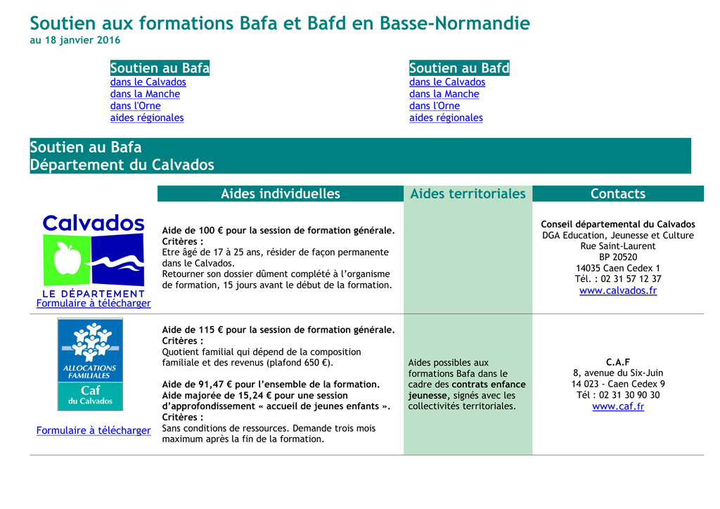 Soutien aux formations Bafa et Bafd en Basse-Normandie au 18 janvier 2016 Soutien au Bafa Soutien au Bafd dans le Calvados dans la Manche dans l'Orne aides régionales dans le Calvados dans la Manche dans l'Orne aides régionales Soutien au Bafa Département du Calvados Aides individuelles Aides territoriales Contacts Conseil départemental du Calvados DGA Education, Jeunesse et Culture Rue Saint-Laurent BP 20520 14035 Caen Cedex 1 Tél. : 02 31 57 12 37 Aide de 100 € pour la session de formation générale. Critères : Etre âgé de 17 à 25 ans, résider de façon permanente dans le Calvados. Retourner son dossier dûment complété à l’organisme de formation, 15 jours avant le début de la formation. www.calvados.fr Formulaire à télécharger Aide de 115 € pour la session de formation générale. Critères : Quotient familial qui dépend de la composition familiale et des revenus (plafond 650 €). Formulaire à télécharger Aide de 91,47 € pour l’ensemble de la formation. Aide majorée de 15,24 € pour une session d’approfondissement « accueil de jeunes enfants ». Critères : Sans conditions de ressources. Demande trois mois maximum après la fin de la formation. Aides possibles aux formations Bafa dans le cadre des contrats enfance jeunesse, signés avec les collectivités territoriales. C.A.F 8, avenue du Six-Juin 14 023 - Caen Cedex 9 Tél : 02 31 30 90 30 www.caf.fr Aide de 150 € maximum pour l'ensemble de la formation. Critères : Être allocataire MSA en prestations familiales ou, à défaut, être assuré maladie agricole dans le cas d'une famille avec un seul enfant ou dernier enfant ; avoir un quotient familial inférieur ou égal à 1 300 € (inférieur ou égal à 1 000 € à partir du 1er avril 2012). Mais encore ? Aides possibles aux formations Bafa dans le cadre des contrats enfance jeunesse, signés avec les collectivités territoriales. M.S.A Côtes Normandes 37, rue de Maltot 14 026 - Caen Cedex 9 Tél. : 02 31 25 39 39 www.msa-cotesnormandes.fr Imprimé délivré en téléphonant au service Prestations ASS (MSA) Se renseigner auprès de votre mairie et de votre comité d’entreprise. Soutien au Bafa Département de la Manche Aides individuelles Aide de 91,47 € à l’issue de la session d’approfondissement. Aide majorée de 15,24 € pour une session d’approfondissement « accueil de jeunes enfants ». Critères : Sans conditions de ressources. Demande trois mois maximum après la fin de la formation. Aides territoriales Contacts Aides possibles aux formations Bafa dans le cadre des contrats enfance jeunesse, signés avec les collectivités territoriales. C.A.F 63,Boulevard Amiral Gauchet 50 306 - Avranches cedex Tél. : 0 810 25 50 10 www.caf.fr Formulaire à télécharger Aide de 150 € maximum pour l'ensemble de la formation. Critères : Être allocataire MSA en prestations familiales ou, à défaut, être assuré maladie agricole dans le cas d'une famille avec un seul enfant ou dernier enfant ; avoir un quotient familial inférieur ou égal à 1 300 € (inférieur ou égal à 1 000 € à partir du 1er avril 2012). Mais encore ? Aides possibles aux formations Bafa dans le cadre des contrats enfance jeunesse, signés avec les collectivités territoriales. M.S.A Côtes Normandes 9, place du Champ de Mars CS 80205 50 005 Saint-Lô Cedex Tél. : 02 31 25 39 39 www.msa-cotesnormandes.fr Imprimé délivré en téléphonant au service Prestations ASS (MSA) Se renseigner auprès de votre mairie et de votre comité d’entreprise. Soutien Bafa Département de l’Orne Aides individuelles Formulaire à télécharger Imprimé CAF Orne Aides territoriales Conseil départemental de l’Orne Bureau sport et jeunesse Hôtel du département 27, boulevard de Strasbourg - BP 528 61 017 – Alençon cedex Tél. : 02 33 81 61 80 Aide de 200 € maximum par stagiaire pour tout le cursus BAFA (soit 100€ par session). Critères : Être domicilié dans l’Orne. La demande de bourse se fait en deux fois au moment de la confirmation d’inscription à chaque stage, par l’organisme de formation. - Aide de 91,47 € majorée de 15,24 € si la session d’approfondissement est centrée sur l’accueil du jeune enfant - Aide complémentaire de 350 € Critères : Être résidents dans l’Orne Être ou non allocataire de la CAF de l’Orne Sans condition de ressources Déposer la demande dans le délai de 3 mois maximum suivant l’inscription à la session d’approfondissement Contacts [email protected] www.orne.fr Onglet « sports et jeunesse »/ « aides »/« aides à la jeunesse »/ « formulaires utiles » Aides possibles aux formations Bafa dans le cadre des contrats enfance jeunesse, signés avec les collectivités territoriales. C.A.F 14, rue du 14ème Hussard 61 021 - Alençon cedex Tél. : 0 810 25 61 10 www.caf.fr Aides possibles aux formations Bafa dans le cadre des contrats enfance jeunesse, signés avec les collectivités territoriales. M.S.A 52, boulevard du 1er chasseur 61 011 - Alençon cedex Tél. : 02 33 31 40 00 Formulaire CNAF à télécharger Formulaire à télécharger Aide de 220 € par stage dans la limite de deux sessions. Critères : Sans conditions de ressources pour les16 à 25 ans, à charge des familles allocataires de la MSA, où adhérents de la MSA Mayenne-Orne-Sarthe. www.msa-mayenne-orne-sarthe.fr Mais encore ? Se renseigner auprès de votre mairie et de votre comité d’entreprise. Soutien au Bafa Aides régionales Aides individuelles L'@too Formation BAFA-BAFD est un nouvel avantage de la Cart'@too. Ce bon de 40 € octroie une réduction immédiate lors de l'inscription à une session de formation au BAFA ou au BAFD. Si le jeune adhère à la Cart'@too l'année suivante, il pourra bénéficier d'une autre réduction de 40 €. Cette aide est également cumulable avec les aides apportées par d'autres financeurs Pour adhérer aux @toos Loisirs et bénéficier de ces réductions recevoir le carnet d'@toos, lil faut