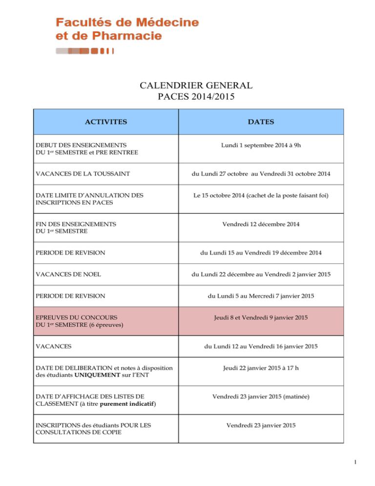 CALENDRIER GENERAL PACES 2014/2015 ACTIVITES DEBUT DES ENSEIGNEMENTS DU 1er SEMESTRE et PRE RENTREE DATES Lundi 1 septembre 2014 à 9h VACANCES DE LA TOUSSAINT du Lundi 27 octobre au Vendredi 31 octobre 2014 DATE LIMITE D’ANNULATION DES INSCRIPTIONS EN PACES Le 15 octobre 2014 (cachet de la poste faisant foi) FIN DES ENSEIGNEMENTS DU 1er SEMESTRE PERIODE DE REVISION VACANCES DE NOEL PERIODE DE REVISION EPREUVES DU CONCOURS DU 1er SEMESTRE (6 épreuves) VACANCES DATE DE DELIBERATION et notes à disposition des étudiants UNIQUEMENT sur l’ENT DATE D’AFFICHAGE DES LISTES DE CLASSEMENT (à titre purement indicatif) INSCRIPTIONS des étudiants POUR LES CONSULTATIONS DE COPIE Vendredi 12 décembre 2014 du Lundi 15 au Vendredi 19 décembre 2014 du Lundi 22 décembre au Vendredi 2 janvier 2015 du Lundi 5 au Mercredi 7 janvier 2015 Jeudi 8 et Vendredi 9 janvier 2015 du Lundi 12 au Vendredi 16 janvier 2015 Jeudi 22 janvier 2015 à 17 h Vendredi 23 janvier 2015 (matinée) Vendredi 23 janvier 2015 1 ACTIVITES DATES CONSULTATION DES COPIES DES EPREUVES DU 1er SEMESTRE du Lundi 26 au Jeudi 29 janvier 2015 (sans exception) INSCRIPTIONS AUX CONCOURS (IP WEB) via l’ENT par les étudiants du Mercredi 28 janvier au Lundi 2 février 2015 DEBUT DES ENSEIGNEMENTS DU 2ème SEMESTRE Lundi 19 janvier 2015 DEBUT DES ENSEIGNEMENTS DES UE SPECIFIQUES Lundi 23 février 2015 FIN DES ENSEIGNEMENTS DU 2ème SEMESTRE Vendredi 24 avril 2015 VACANCES DE PAQUES du Lundi 27 avril au Vendredi 8 mai 2015 PERIODE DE REVISION du Lundi 11 au Mardi 19 mai 2015 EPREUVES DU CONCOURS DU 2ème SEMESTRE DATE DE DELIBERATION et notes à disposition des étudiants UNIQUEMENT sur l’ENT DATE D’AFFICHAGE DES LISTES DE CLASSEMENT INSCRIPTIONS des étudiants POUR LES CONSULTATIONS DE COPIE CONSULTATION DES COPIES DES EPREUVES DU 2ème SEMESTRE PERIODE OBLIGATOIRE DE CHOIX DE FILIERE CONSULTATION DES AFFECTATIONS DEFINITIVES EN LIGNE AFFICHAGE DES AFFECTATIONS DEFINITIVES Mercredi 20, Jeudi 21 et Vendredi 22 Mai 2015 Jeudi 11 juin 2015 à 17 h Vendredi 12 juin 2015 (matinée) Vendredi 12 juin 2015 du Lundi 15 au Mardi 16 juin 2015 (sans exception) du Vendredi 12 au Mercredi 17 juin 2015 Jeudi 18 juin 2015 Vendredi 19 juin 2015 (en matinée) 2 ACTIVITES DATES Admis en Odontologie CHOIX DES AFFECTATIONS entre Bordeaux et Clermont-Ferrand Vendredi 19 juin 2015 à 10h30 Admis en kinésithérapie CHOIX DES AFFECTATIONS entre ILFOMER et Institut de formation Croix Rouge Vendredi 19 juin 2015 à 11h00 Admis en 2ème année de médecine (DFGSM2) CHOIX DU STAGE D’INITIATION A LA CLINIQUE ET AUX SOINS PERIODE DE STAGE Admis en 2ème année de pharmacie (DFGSP2) REUNION d’INFORMATION SUR LE STAGE OFFICINAL D’INITIATION PERIODE DE STAGE Vendredi 19 juin à 14 h 00 du Lundi 24 août au Vendredi 18 septembre 2015 Vendredi 19 juin à 14 h 30 Entre le Lundi 22 juin et le Samedi 29 août 2015 pour les stages en région Limousin Entre le Lundi 29 juin et le Samedi 29 août 2015 pour les stages hors région Limousin Admis en 2ème année de sage-femme (DFGSMa2) CHOIX DU STAGE D’OBSERVATION Admis en Ergothérapie REUNION D’INFORMATION RELEVES DE NOTES FORMAT PAPIER à disposition des ETUDIANTS Vendredi 19 juin à 14 h 00 Vendredi 19 juin à 14h A compter du Lundi 22 juin 2015 COMMISSION de DEROGATION (TRIPLEMENT Date limite de dépôt des demandes : Mardi 23 juin à 17 h et REORIENTATION) Lundi 29 juin à 17 h CALENDRIER SUSCEPTIBLE DE SUBIR DES MODIFICATIONS EN COURS D’ANNEE Soumis aux délibérations du conseil de médecine siégeant en formation plénière le 4 septembre 2014 Approuvé le 4 septembre 2014 Soumis aux délibérations du conseil de pharmacie siégeant en formation plénière le 16 septembre 2014 Approuvé le 16 septembre 2014 3
