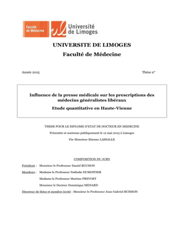 UNIVERSITE DE LIMOGES Faculté de Médecine Année 2015 Thèse n° Influence de la presse médicale sur les prescriptions des médecins généralistes libéraux Etude quantitative en Haute-Vienne THESE POUR LE DIPLOME D’ETAT DE DOCTEUR EN MEDECINE Présentée et soutenue publiquement le 12 mai 2015 à Limoges Par Monsieur Etienne LASSALLE COMPOSITION DU JURY Président : Monsieur le Professeur Daniel BUCHON Membres : Madame le Professeur Nathalie DUMOITIER Madame le Professeur Martine PREVOST Monsieur le Docteur Dominique MENARD Directeur de thèse et membre invité : Monsieur le Professeur Jean-Gabriel BUISSON UNIVERSITE DE LIMOGES Faculté de Médecine Année 2015 Thèse n° Influence de la presse médicale sur les prescriptions des médecins généralistes libéraux Etude quantitative en Haute-Vienne THESE POUR LE DIPLOME D’ETAT DE DOCTEUR EN MEDECINE Présentée et soutenue publiquement le 12 mai 2015 à Limoges Par Monsieur Etienne LASSALLE COMPOSITION DU JURY Président : Monsieur le Professeur Daniel BUCHON Membres : Madame le Professeur Nathalie DUMOITIER Madame le Professeur Martine PREVOST Monsieur le Docteur Dominique MENARD Directeur de thèse et membre invité : Monsieur le Professeur Jean-Gabriel BUISSON 1 U N I V E R S I T E de L I M O G E S FACULTE de MEDECINE TITRES des PROFESSEURS et MAITRES de CONFERENCES des UNIVERSITES pour la REDACTION des DEDICACES PROFESSEURS DES UNIVERSITES - PRATICIENS HOSPITALIERS ABOYANS Victor Professeur des Universités-Praticien CARDIOLOGIE Responsable de service Hospitalier ACHARD Jean-Michel Professeur des Universités-Praticien Hospitalier PHYSIOLOGIE ADENIS Jean-Paul Professeur des OPHTALMOLOGIE Universités-Praticien Hospitalier ALAIN Sophie Professeur des Universités-Praticien BACTERIOLOGIE-VIROLOGIE Hospitalier ALDIGIER Jean-Claude Professeur des Universités-Praticien Hospitalier NEPHROLOGIE ARCHAMBEAUD Françoise Professeur des Universités-Praticien Hospitalier MEDECINE INTERNE Responsable de service ARNAUD Jean-Paul Professeur des Universités-Praticien Hospitalier CHIRURGIE ORTHOPEDIQUE et TRAUMATOLOGIQUE AUBARD Yves Professeur des Universités-Praticien Hospitalier GYNECOLOGIE-OBSTETRIQUE Responsable de service AUBRY Karine Professeur des Universités-Praticien Hospitalier O.R.L. BEDANE Christophe Professeur des Universités-Praticien Hospitalier DERMATO-VENEREOLOGIE Responsable de service BERTIN Philippe Professeur des Universités-Praticien Hospitalier THERAPEUTIQUE Responsable de service de RHUMATOLOGIE BESSEDE Jean-Pierre Professeur des Universités-Praticien Hospitalier O.R.L. Responsable de service 2 BONNAUD François Professeur des Universités-Praticien Hospitalier PNEUMOLOGIE Doyen Honoraire BORDESSOULE Dominique Professeur des Universités-Praticien Hospitalier HEMATOLOGIE Responsable de service d'HEMATOLOGIE CLINIQUE et THERAPIE CELLULAIRE CAIRE François Professeur des Universités-Praticien Hospitalier NEUROCHIRURGIE CHARISSOUX Jean-Louis Professeur des Universités-Praticien Hospitalier CHIRURGIE ORTHOPEDIQUE et TRAUMATOLOGIQUE CLAVERE Pierre Professeur des Universités-Praticien Hospitalier RADIOTHERAPIE Responsable de service CLEMENT Jean-Pierre Professeur des Universités-Praticien Hospitalier PSYCHIATRIE d'ADULTES Responsable de service COGNE Michel Professeur des Universités-Praticien Hospitalier IMMUNOLOGIE Responsable de service CORNU Elisabeth Professeur des Universités-Praticien Hospitalier CHIRURGIE THORACIQUE et CARDIOVASCULAIRE COURATIER Philippe Professeur des Universités-Praticien Hospitalier NEUROLOGIE Responsable de service DANTOINE Thierry Professeur des Universités-Praticien Hospitalier GERIATRIE et BIOLOGIE du VIEILLISSEMENT Responsable de service DARDE Marie-Laure Professeur des Universités-Praticien Hospitalier PARASITOLOGIE et MYCOLOGIE Responsable de service DAVIET Jean-Christophe Professeur des Universités-Praticien Hospitalier MEDECINE PHYSIQUE et de READAPTATION DESCAZEAUD Aurélien Professeur des Universités-Praticien Hospitalier UROLOGIE DESPORT Jean-Claude Professeur des Universités-Praticien Hospitalier NUTRITION DRUET-CABANAC Michel Professeur des Universités-Praticien Hospitalier MEDECINE et SANTE au TRAVAIL Responsable de service 3 DUMAS Jean-Philippe ESSIG Marie Professeur des Universités-Praticien Hospitalier UROLOGIE Responsable de service Professeur des Universités-Praticien Hospitalier NEPHROLOGIE Responsable de service FAUCHAIS Anne-Laure Professeur des Universités-Praticien Hospitalier MEDECINE INTERNE Responsable de service FEUILLARD Jean Professeur des Universités-Praticien Hospitalier HEMATOLOGIE Responsable de service du Laboratoire d'HEMATOLOGIE FOURCADE Laurent Professeur des Universités-Praticien Hospitalier CHIRURGIE INFANTILE Responsable de service GAINANT Alain Professeur des Universités-Praticien Hospitalier CHIRURGIE DIGESTIVE GUIGONIS Vincent Professeur des Universités-Praticien Hospitalier PEDIATRIE JACCARD Arnaud Professeur des Universités-Praticien Hospitalier HEMATOLOGIE JAUBERTEAU-MARCHAN M. Odile Professeur des Universités-Praticien Hospitalier IMMUNOLOGIE LABROUSSE François Professeur des Universités-Praticien Hospitalier ANATOMIE et CYTOLOGIE PATHOLOGIQUES Responsable de service LACROIX Philippe Professeur des Universités-Praticien Hospitalier MEDECINE VASCULAIRE LAROCHE Marie-Laure Professeur des Universités-Praticien Hospitalier PHARMACOLOGIE CLINIQUE LASKAR Marc Professeur des Universités-Praticien Hospitalier CHIRURGIE THORACIQUE et CARDIOVASCULAIRE Responsable de service Assesseur LIENHARDT-ROUSSIE Anne Professeur des Universités-Praticien Hospitalier PEDIATRIE Responsable de service LOUSTAUD-RATTI Véronique Professeur des Universités-Praticien Hospitalier HEPATOLOGIE MABIT Christian Professeur des Universités-Praticien Hospitalier ANATOMIE Responsable de service d'ORTHOPEDIE-TRAUMATOLOGIE 4 MAGY Laurent Professeur des Universités-Praticien Hospitalier NEUROLOGIE MARQUET Pierre Professeur des Universités-Praticien H