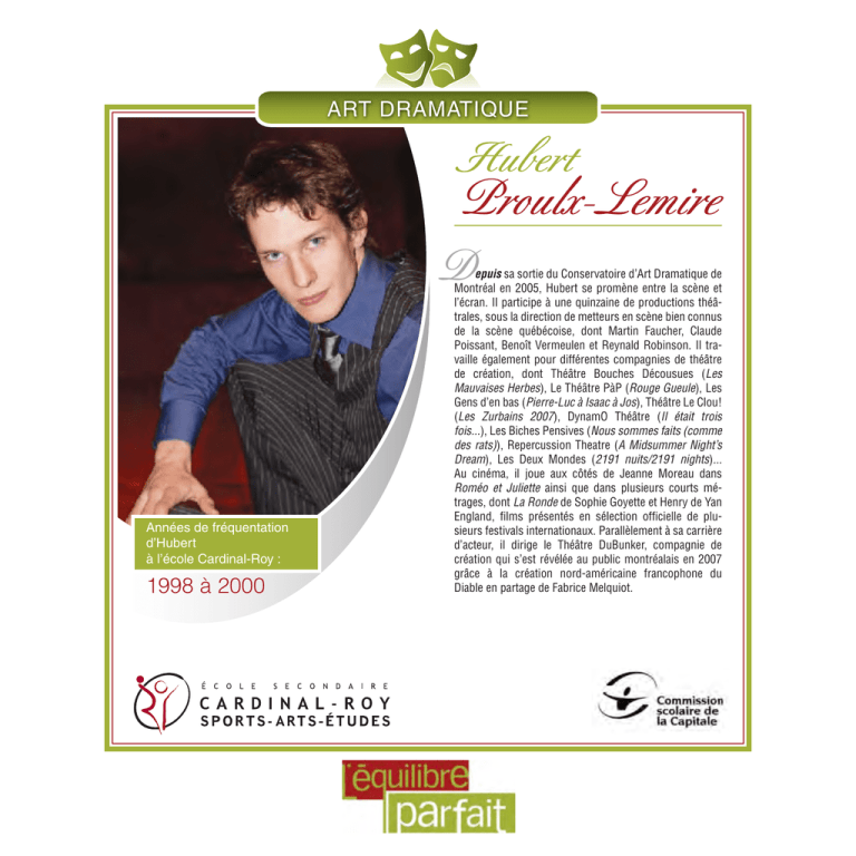 ART DRAMATIQUE Hubert Proulx-Lemire D Années de fréquentation d’Hubert à l’école Cardinal-Roy : 1998 à 2000 epuis sa sortie du Conservatoire d’Art Dramatique de Montréal en 2005, Hubert se promène entre la scène et l’écran. Il participe à une quinzaine de productions théâtrales, sous la direction de metteurs en scène bien connus de la scène québécoise, dont Martin Faucher, Claude Poissant, Benoît Vermeulen et Reynald Robinson. Il travaille également pour différentes compagnies de théâtre de création, dont Théâtre Bouches Décousues (Les Mauvaises Herbes), Le Théâtre PàP (Rouge Gueule), Les Gens d’en bas (Pierre-Luc à Isaac à Jos), Théâtre Le Clou! (Les Zurbains 2007), DynamO Théâtre (Il était trois fois...), Les Biches Pensives (Nous sommes faits (comme des rats)), Repercussion Theatre (A Midsummer Night’s Dream), Les Deux Mondes (2191 nuits/2191 nights)... Au cinéma, il joue aux côtés de Jeanne Moreau dans Roméo et Juliette ainsi que dans plusieurs courts métrages, dont La Ronde de Sophie Goyette et Henry de Yan England, films présentés en sélection officielle de plusieurs festivals internationaux. Parallèlement à sa carrière d’acteur, il dirige le Théâtre DuBunker, compagnie de création qui s’est révélée au public montréalais en 2007 grâce à la création nord-américaine francophone du Diable en partage de Fabrice Melquiot. ART DRAMATIQUE Isabeau Proulx-Lemire A rtiste très polyvalent, l’acteur et chanteur Isabeau se distingue par son aisance dans une multitude de styles dramatiques et musicaux. Débutant sa carrière comme acteur, il travaille avec les compagnies les plus reconnues de Québec : Le Cirque Éos, l'Opéra de Québec, l'Orchestre Symphonique de Québec, Les Fêtes de la NouvelleFrance et le Carnaval de Québec. Années de fréquentation d’Isabeau à l’école Cardinal-Roy : 1996 à 1999 Isabeau Proulx-Lemire confirme ses dons de comédienchanteur en tant que soliste tant à l’opérette (l’Opéra Bouffe du Québec, Jeunesses Musicales du Canada), qu’à l’opéra baroque (Atelier d'Opéra de l'Université de Montréal, Opéra Comique de Paris, Toronto Masque Theater, Le Nouvel Opéra), ou encore à l’opéra contemporain (Chants libres), à la comédie musicale (Les Misérables) et à la musique populaire (La Nouba du Cirque du Soleil à Walt Disney World et au Festival de Théâtre des Amériques). Sa carrière de chanteur l’a amené à chanter également en Amérique du Sud et en Europe. ART DRAMATIQUE Eva-Saïda Saheb-Ettaba E va-Saïda a eu son diplôme en 1999 du volet théâtre du secteur Sports-Arts-Études. En 2001, elle fait son entrée au Conservatoire d’art dramatique de Québec pour en sortir trois ans plus tard avec une formation en jeu. Depuis, elle roule sa bosse sur les différentes scènes du Québec où elle joue tant pour le public jeune qu'adulte. Années de fréquentation d’Eva-Saïda à l’école Cardinal-Roy : 1996 à 1999 BADMINTON Louis-Laurent Trudel L ouis-Laurent a participé à plusieurs compétitions d’envergures telles que les championnats du monde de badminton en Chine ainsi que les Universiades d’été en Thaïlande. En 2008, il a remporté le Championnat canadien universitaire en double mixte en plus du Championnat provincial senior. Athlète accompli, il s’est également illustré dans un autre sport en étant lanceur pour les Diamants de Québec au baseball élite. Années de fréquentation de Louis-Laurent à l’école Cardinal-Roy : 1996 à 2001 BASEBALL François-Alexandre Beaulieu A près son secondaire, François-Alexandre a côtoyé les meilleurs joueurs de baseball au Canada et a joué contre les meilleurs au monde. Il a ensuite été recruté par l’université d’Albany à New York où il a complété un baccalauréat en mathématiques. En 2003, il a fait partie de l’équipe Canada Junior. Il a aussi reçu le titre de recrue de l’année dans la LBEQ en 2004. En 2007, il a fait partie de la première équipe étoile de la conférence américaine de l’Est. Années de fréquentation de François-Alexandre à l’école Cardinal-Roy : 2000 à 2002 BASEBALL Jimmy J Durette immy a joué avec les Condors de Charlesbourg en 2001. En 2002, il est nommé meilleur joueur de la province dans la catégorie 17 ans et moins lorsqu’il évoluait pour Les Ailes du Québec. En 2003, il est repêché par les Angels d’Anaheim au 27e tour et il a été sélectionné pour l’équipe nationale Junior de baseball. Il a également joué avec les Diamants de Québec et pour les Voyageurs de Saguenay de 2003 à 2007. Il travaille maintenant en kinésiologie étant gradué du 2e cycle de l’Université Laval. Années de fréquentation de Jimmy à l’école Cardinal-Roy : 2000 à 2002 BASEBALL Kevin-Denis Fortier R epêché par les Blue Jays de Toronto au 48e tour en 2005, Kevin-Denis a été envoyé au Crowder College au Missouri pour le baseball américain. En 2006, il a connu l’une de ses meilleures saisons et a été repêché de nouveau au 38e tour par les Blue Jays. En 2007, il a obtenu son premier contrat professionnel avec cette même équipe et a joué pour cette organisation jusqu’en 2009 dans les rangs mineurs. Années de fréquentation de Kevin-Denis à l’école Cardinal-Roy : 2002 à 2004 CIRQUE Geneviève Drolet À l’âge de 15 ans, Geneviève est engagée dans une compagnie de cirque professionnelle où elle y travaille pendant trois ans. Elle a évolué dans le milieu circassien en tant que travailleuse autonome et a visité plus d’une vingtaine de pays lors de ses performances. C’est en tant que pigiste qu’elle évolue maintenant dans le domaine des arts du cirque. On a pu la voir avec le Cirque Éos, le Cirque Éloise, le Cirque du Soleil et Les 7 doigts de la main. Années de fréquentation de Geneviève à l’école Cardinal-Roy : 1998 à 2000 CIRQUE Bruno Gagnon I mpressionné par un acrobate prenant part à la p