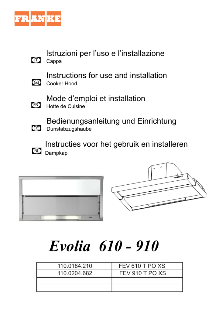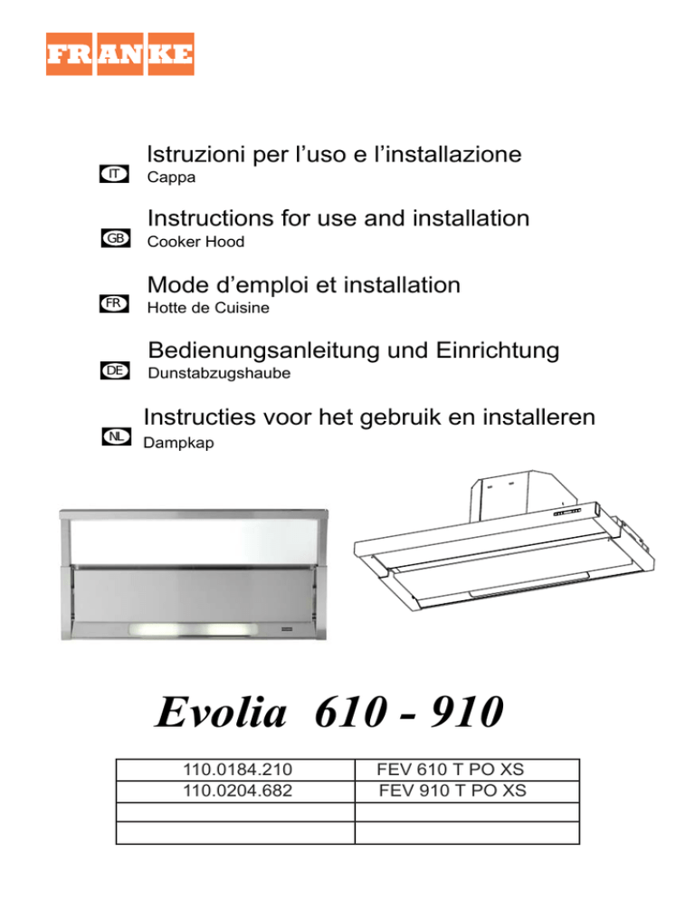 Istruzioni per l’uso e l’installazione IT Cappa Instructions for use and installation GB Cooker Hood Mode d’emploi et installation FR Hotte de Cuisine Bedienungsanleitung und Einrichtung DE Dunstabzugshaube Instructies voor het gebruik en installeren NL Dampkap Evolia 610 - 910 110.0184.210 110.0204.682 FEV 610 T PO XS FEV 910 T PO XS IT Libretto di Istruzioni INDICE CONSIGLI E SUGGERIMENTI.............................................................................................................................................. . 3 CARATTERISTICHE.............................................................................................................................................................. . 4 INSTALLAZIONE ................................................................................................................................................................... . 6 USO........................................................................................................................................................................................ . 8 MANUTENZIONE .................................................................................................................................................................. . 9 GB Instructions Manual INDEX RECOMMENDATIONS AND SUGGESTIONS ...................................................................................................................11 CHARACTERISTICS ...........................................................................................................................................................12 INSTALLATION....................................................................................................................................................................14 USE ......................................................................................................................................................................................16 MAINTENANCE ...................................................................................................................................................................17 FR Manuel d’Instructions SOMMAIRE CONSEILS ET SUGGESTIONS..........................................................................................................................................19 CARACTERISTIQUES.........................................................................................................................................................20 INSTALLATION....................................................................................................................................................................22 UTILISATION .......................................................................................................................................................................24 ENTRETIEN.........................................................................................................................................................................25 DE Bedienungsanleitung INHALTSVERZEICHNIS EMPFEHLUNGEN UND HINWEISE ...................................................................................................................................27 CHARAKTERISTIKEN .........................................................................................................................................................28 MONTAGE ...........................................................................................................................................................................30 BEDIENUNG........................................................................................................................................................................32 WARTUNG...........................................................................................................................................................................33 NL Gebruiksaanwijzing INHOUDSOPGAVE ADVIEZEN EN SUGGESTIES.............................................................................................................................................35 EIGENSCHAPPEN...............................................................................................................................................................36 INSTALLATIE.......................................................................................................................................................................38 GEBRUIK .............................................................................................................................................................................40 ONDERHOUD......................................................................................................................................................................41 2 2 CONSIGLI E SUGGERIMENTI INSTALLAZIONE Il produttore declina qualsiasi responsabilità per danni dovuti ad installazione non corretta o non conforme alle regole dell’arte. La distanza minima di sicurezza tra il Piano di cottura e la Cappa deve essere di 650 mm. Verificare che la tensione di rete corrisponda a quella riportata nella targhetta posta all’interno della Cappa. Per Apparecchi in Classe Ia accertarsi che l’impianto elettrico domestico garantisca un corretto scarico a terra. Collegare la Cappa all’uscita dell’aria aspirata con tubazione di diametro pari o superiore a 150 mm. Il percorso della tubazione deve essere il più breve possibile. Non collegare la Cappa a condotti di scarico dei fumi prodotti da combustione (caldaie, caminetti, ecc.). Nel caso in cui nella stanza vengano utilizzati sia la Cappa che apparecchi non azionati da energia elettrica (ad esempio apparecchi utilizzatori di gas), si deve provvedere ad una aerazione sufficiente dell’ambiente. Se la cucina ne fosse sprovvista, praticare un’apertura che comunichi con 