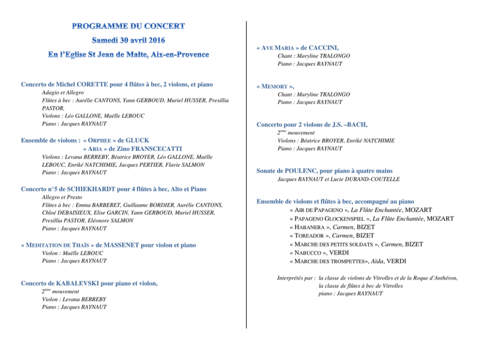 « AVE MARIA » de CACCINI, Chant : Maryline TRALONGO Piano : Jacques RAYNAUT Concerto de Michel CORETTE pour 4 flûtes à bec, 2 violons, et piano Adagio et Allegro Flûtes à bec : Aurélie CANTONS, Yann GERBOUD, Muriel HUSSER, Presillia PASTOR, Violons : Léo GALLONE, Maëlle LEBOUC Piano : Jacques RAYNAUT Ensemble de violons : « ORPHEE » de GLUCK « ARIA » de Zino FRANSCECATTI Violons : Levana BERREBY, Béatrice BROYER, Léo GALLONE, Maëlle LEBOUC, Enriké NATCHIMIE, Jacques PERTIER, Flavie SALMON Piano : Jacques RAYNAUT « MEMORY », Chant : Maryline TRALONGO Piano : Jacques RAYNAUT Concerto pour 2 violons de J.S. –BACH, 2ème mouvement Violons : Béatrice BROYER, Enriké NATCHIMIE Piano : Jacques RAYNAUT Sonate de POULENC, pour piano à quatre mains Jacques RAYNAUT et Lucie DURAND-COUTELLE Concerto n°5 de SCHIEKHARDT pour 4 flûtes à bec, Alto et Piano Allegro et Presto Flûtes à bec : Emma BARBERET, Guillaume BORDIER, Aurélie CANTONS, Chloé DEBAISIEUX, Elise GARCIN, Yann GERBOUD, Muriel HUSSER, Presillia PASTOR, Eléonore SALMON Piano : Jacques RAYNAUT « MEDITATION DE THAÏS » de MASSENET pour violon et piano Violon : Maëlle LEBOUC Piano : Jacques RAYNAUT Concerto de KABALEVSKI pour piano et violon, 2ème mouvement Violon : Levana BERREBY Piano : Jacques RAYNAUT Ensemble de violons et flûtes à bec, accompagné au piano « AIR DE PAPAGENO », La Flûte Enchantée, MOZART « PAPAGENO GLOCKENSPIEL », La Flûte Enchantée, MOZART « HABANERA », Carmen, BIZET « TOREADOR », Carmen, BIZET « MARCHE DES PETITS SOLDATS », Carmen, BIZET « NABUCCO », VERDI « MARCHE DES TROMPETTES», Aïda, VERDI Interprétés par : la classe de violons de Vitrolles et de la Roque d’Anthéron, la classe de flûtes à bec de Vitrolles piano : Jacques RAYNAUT