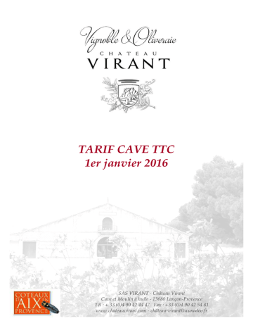 TARIF CAVE TTC 1er a vier 2016 SAS VIRA T Ch teau Vira t Cave et ui hui e 13680 a Pr ve ce T" # $ 33 (0)4 90 42 44 47 Fax # $33 (0)4 90 42 54 81 www.chateauvira t.c 0 ch teau vira t@wa ad .fr TARIF CAVE 2016 D part Ch teau TTC CHATEAU VIRA T A P C!teaux d’Aix e Pr!ve ce 75 c Cuv e Prestige R uge5 R s"5 B a c Puissa ce ga ce E ev e f t de ch e S" ecti de viei es vig es 16 50 75 c Cuv e des ) iviers R uge Structur pic r d E ev e f t de ch e Be e c 0p exit" d’ar>0es ag u0 R uge (155 ) # 23 60 # 10 50 c ffret b is # 31.10 # Cuv e Traditi R uge5 R s"5 B a c E ga ce et r deur e b uche ’expressi du terr ir ag u0 R uge 8 R s" 8 B a c (155 ) # :"r b a0 R uge 8 R s" (3 ) # Ba tha;ar R uge (12 ) # 16 30 # 35.80 # 121 65 # Cuv e Ch+teau Vira t R uge5 R s"5 B a c !a qui tesse ce des C teaux d’Aix Cuv e C assique ag u0 R uge 8 R s" (155 ) # 14.40 # 75 c 50 c 3755 c 6 90 5 55 4 30 c ffret b is # 23 80 # c ffret b is 46 80 # c ffret b is 141 65 # 75 c 50 c 3755 c 5 10 4 00 3 25 c ffret b is # 21 90 # TARIF CAVE 2016 D part Ch teau TTC D )AI E VIRA T VDP des B!uches du Rh( e D 3ai e Vira t R uge5 R s"5 B a c ! ger fruit e 3ei eur du terr ir des B uches du Rh4 e Vi de pays de caractAre 75 c 3755 c 3 90 2 65 sauf b a c R s Gris Fruit festif Chard ay T ute a fraicheur d’u c page bie c u 75 c 75 c 5 40 5 10 VI S FESTIFS S BAGS I Brut de Chard ay Brut de Vira t R s Vi Cuit de Vira t Ap"ritifs et desserts 75 c 75 c 50 c 9 20 13 10 B X 5 itres 10 itres 17 00 31 50 14 00 17 00 18 50 25 50 31 50 34 50 C!teaux d’Aix e Pr!ve ce 2.90 * itre R uge5 R s" VDP des B!uches du Rh( e 2.30 * itre 2.90 * itre 3.20 * itre R uge5 R s" Ba c R s" Gris TARIF CAVE 2016 D part Ch teau TTC CHATEAU BEAUFERA A P C!teaux d’Aix e Pr!ve ce 75 c/ Asse3b age Caber et Syrah 7 tes de D gustati Robe claire, avec un nez fruité et vivace avec des notes de fruits rouges (cerises, fraises) etc. La bouche est franche, avec des notes d’agrumes et de fruits exotiques. Acc rds 3ets8vi Via des r uges et gibiers/ P ats e sauces repas structur s/ D icieux avec des fr 3ages (R quef rt Ch4vres Ep isses !ivar t etc)/ Acc rd parfait avec e ch c at/ Te3p rature de service e tre 16 et 187c / 10 50 € R c 3pe ses < dai e d’Arge t CGA de Paris 2016 p ur e R uge 2014 < dai e Arge t C c urs des Vi s E e 6 Tab e 2016 Asse3b age Syrah Caber et 7 tes de D gustati Robe claire, avec un nez fruité et vivace avec des notes de fruits rouges (cerises, fraises) etc. La bouche est franche, avec des notes d’agrumes et de fruits exotiques. 9 80 € Acc rds 3ets8vi R s structur qui appe e des via des et des p iss s gri s/ U r ga avec des sa ades c rses u des p ats pr ve ;aux/ Servir id a e3e t e tre 8 et 107c / R c 3pe ses < dai e d’Arge t CGA de Paris 2016 p ur e R s 2015 Asse3b age C airette et B urb u e c 7 tes de D gustati R be d r e/ 0e1 b is et puissa t avec des tes beurr es et va i es/ !a b uche est gue et puissa te avec u e be e 3ati4re/ Acc rds 3ets8vi Id a e acc 3pag e3e t de sa ades c 3p s es de cuisi e 3 diterra e e 6 base de p iss s et de gu3es cuits/ Sub i3e avec des fruits de 3er/ Servir e tre 8 et 10 7c/ R c 3pe ses C ur Pr ve ce 2015 e d’8r C c urs des vi s d’Aix e 9 80 € TARIF CAVE 2016 D part Ch teau TTC HUI0E D’ 0IVE A P AIX E PR VE CE 1 Fruit" vert 0"diu0 Depuis 1996 Asse3b age d’ ives Ag a dau Sa e que Verda e Pich i e/ 0 tes d’herbe fraCche de feui age de t 3ate verte/ Carafe d"c rati 75c 35 70 R"serve fa0i ia e 20c 17 40 5 3 Bib 3 1 75 c 50 c 25 c 6c 7 90 3 00 B utei e $ Hui ier 92 57 00 59 00 20 00 17 30 HUI0E D’ 0IVE DE VARIETE 1 Sa 13 20 e que et Ag a dau Hui e d’ ive Ag a dau fruit" vert i te se Arde te et puissa te e b uche cette hui e d’ ive a des arB3es d’herbe fraCche d’artichaut de ga1 / Hui e d’ ive Sa e que fruit" vert "ger Hui e d’ ive d icate avec des tes de p 33e verte d’a3a d d’herbe fraCche et u e fi a e g4re3e t beurr e/ 3 65 00 75 c 18 30 50 c 13 50 25 c 7 90 C ffret b is d"c uverte (3x25c ) C ffret b is d"c uverte $ ivre 34 60 46 50 HUI0E D’ 0IVE FRUITE )UR ArB3es d’a3a de s4che et de p 33e 3Ere d uce et ar 3atique cette hui e est id a e p ur v s desserts/ 1 # 20 00 TARIF CAVE 2016 D part Ch teau TTC 0ES SPECIA0ITES DU D )AI E ) ives vertes vari t Pich i es b ca de 220 g p ids et "g utt" ) ives vertes vari t Pich i es b ca de 440 g p ids et "g utt" ) ives ires vari t ucques b ca de 200 g p ids et "g utt" 4 80 2 70 23 00 Ge fi e a ge "e de Vi Cuit 320 g Ge fi e a ge "e de Vi Cuit 50 g Vi aigre de vi cuit 20 c da s s "tui C C C fit d’ ig au Vi B a c de ChFteau Vira t p t de 230g fit de figue 6 ’hui e d’ ive de ChFteau Vira t p t de 250g fiture de fruits r uges au Vi Cuit de ChFteau Vira t p t de 240g ’hui e d’ ive (6 d c i ais 4 20 4 20 4 20 4 70 4 80 12 50 5 90 es Cara3e s aux ives par barquette de 9 piAces es Ca iss s d’Aix du R y Re "5 b Dte sa ge 50 g es Ca iss s d’Aix du R y Re "5 b Dte sa ge 130 g 7 ugat 100 g b a c u ir es 7avettes biscuits 3 80 5 70 4 90 4 70 s) (!a c assique ( ature) G A is & Pastis G Pav t & Va i e G P pites au ch c at G Ca e e & Ge fi e G F eur d’ ra ger & Curcu3a ) es Bri s de Vira t biscuits sa "s ’hui e d’ ive (5 d c i ais s) 4 70 (8 ives & R 3ari G T 3ates Ai & 8riga G S sa3e & Par3esa G C eri & Pi3e t d’Espe ette G Basi ic & 8ig ) De ’ ive ; ’hui e d’ ive ba de dessi "e p ur petits et gra ds5 de Christi e Chey a Saveurs Pr ve <a es 90 recettes base de vi et d’hui e d’ ive5 de Christi e Chey a D ice d’ ives vertes au pist u p t de 90 g D ice d’ ives ires au pist u p t de 90 g D ice de t 3ates s ch es p t de 90 g =ie 500 g p usieurs vari"t"s =ie 1 Ig p usieurs vari"t"s 10 00 12 00 3 70 3 70 3 70 9 50 15 00 4 70 TARIF CAVE 2016 D part Ch teau TTC SUGGESTI DE C FFRETS CADEAUX VI 2 HUI0E Cuv e Ch teau Vira t Cuv e Traditi! Cuv e des /iviers C ffret 3 b utei es 26 30 31 70 42 50 C ffret 6 b utei es 41 60 52 40 74 00 C ffret 12 b utei es 73 20 94 80 138 00 C ffret 2 b utei es J 1 hui e 50 c 34 40 38 00 45 20 ive 250g 