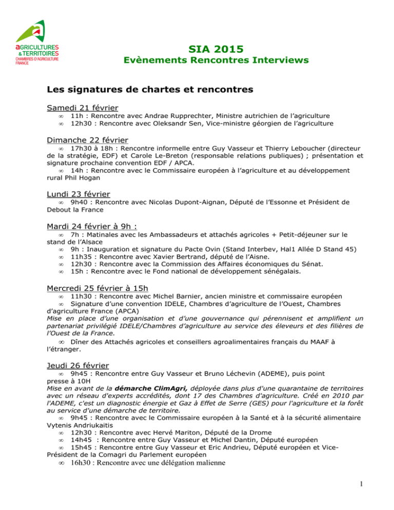 SIA 2015 Evènements Rencontres Interviews Les signatures de chartes et rencontres Samedi 21 février • • 11h : Rencontre avec Andrae Rupprechter, Ministre autrichien de l’agriculture 12h30 : Rencontre avec Oleksandr Sen, Vice-ministre géorgien de l’agriculture Dimanche 22 février • 17h30 à 18h : Rencontre informelle entre Guy Vasseur et Thierry Leboucher (directeur de la stratégie, EDF) et Carole Le-Breton (responsable relations publiques) ; présentation et signature prochaine convention EDF / APCA. • 14h : Rencontre avec le Commissaire européen à l’agriculture et au développement rural Phil Hogan Lundi 23 février • 9h40 : Rencontre avec Nicolas Dupont-Aignan, Député de l’Essonne et Président de Debout la France Mardi 24 février à 9h : • stand • • • • 7h : Matinales avec les Ambassadeurs et attachés agricoles + Petit-déjeuner sur le de l’Alsace 9h : Inauguration et signature du Pacte Ovin (Stand Interbev, Hal1 Allée D Stand 45) 11h35 : Rencontre avec Xavier Bertrand, député de l’Aisne. 12h30 : Rencontre avec la Commission des Affaires économiques du Sénat. 15h : Rencontre avec le Fond national de développement sénégalais. Mercredi 25 février à 15h • 11h30 : Rencontre avec Michel Barnier, ancien ministre et commissaire européen • Signature d’une convention IDELE, Chambres d’agriculture de l’Ouest, Chambres d’agriculture France (APCA) Mise en place d’une organisation et d’une gouvernance qui pérennisent et amplifient un partenariat privilégié IDELE/Chambres d’agriculture au service des éleveurs et des filières de l’Ouest de la France. • Dîner des Attachés agricoles et conseillers agroalimentaires français du MAAF à l’étranger. Jeudi 26 février • 9h45 : Rencontre entre Guy Vasseur et Bruno Léchevin (ADEME), puis point presse à 10H Mise en avant de la démarche ClimAgri, déployée dans plus d'une quarantaine de territoires avec un réseau d'experts accrédités, dont 17 des Chambres d'agriculture. Créé en 2010 par l'ADEME, c'est un diagnostic énergie et Gaz à Effet de Serre (GES) pour l'agriculture et la forêt au service d'une démarche de territoire. • 9h45 : Rencontre avec le Commissaire européen à la Santé et à la sécurité alimentaire Vytenis Andriukaitis • 12h30 : Rencontre avec Hervé Mariton, Député de la Drome • 14h45 : Rencontre entre Guy Vasseur et Michel Dantin, Député européen • 15h45 : Rencontre entre Guy Vasseur et Eric Andrieu, Député européen et VicePrésident de la Comagri du Parlement européen • 16h30 : Rencontre avec une délégation malienne 1 Vendredi 27 février • 17h30 : Rencontre entre Jo Giroud et Pierre Moscovici, Commissaire européen aux Affaires économiques et monétaires, à la Fiscalité et à l’Union douanière. Vendredi 28 février • 10h : Rencontre entre Jo Giroud, Christophe Hillairet et Henri Malosse, Président du CESE Les événements Samedi 21 février à 15h30 • Point presse : OpenAgrifood avec Xavier Beulin en présence de Guy Vasseur Dimanche 22 février • 13h à 14h30 : Présentation des projets AgreenStartup sur le stand de Campagnes TV • 15h30 : Remise du prix AgreenStartup sur le stand des Chambres d’agriculture avec Guy Vasseur et Emmanuelle Ledoux (représentant Axelle Lemaire - Chef de cabinet) Lundi 23 février à 17h30 • Tweet Apéro avec 10Vins Campagnes TV Public Sénat http://replay.publicsenat.fr/ Samedi 21 février à 14h Les Grands enjeux du salon avec Guy Vasseur, Président des Chambres d’agriculture, François Purseigle, Sociologue à l'ENSAT de Toulouse, Dominique Chargé, Terrena et Président de La Laïta, Alain Berger, Commissaire général de la section française à l'exposition universelle de Milan, Marc Dufumier, Ingénieur agronome, auteur de "50 idées reçues sur l'agriculture et l'alimentation Mardi 24 février L’agriculture à l’heure de la technologie avec Aurélien Deceuninck (Chambre d’agriculture la Somme) Mercredi 25 février Une agriculture plus verte avec Philippe Noyau (Vice-président de la Chambre d’agriculture du Loir et Cher) et Jacques Dufréchou (Agriculteur, InnovAction Landes) Mercredi 25 février à 19h le JT Didier Guillaume, Président du groupe PS au Sénat, Guy Vasseur, Président des Chambres d'Agriculture, Delphine Girard, Journaliste Public-Sénat 2 Les Débats : Mercredi 25 février • Transition énergétique et foret ;avec Gaëtan Le Seyec, président de la SCIC Bois Energie "Argoat Energie" en Bretagne et agriculteur. élu Chambre d’agriculture du Morbihan, Jean-Yves Caullet, Président de l’ONF, Cyril Le Picard de l’UCFF, Rémi Chabrillat de l’ADEME, Claude Turbet, Président de GDF Suez Cofely. un représentant de producteurs de granulés à bois. http://www.dailymotion.com/video/x2i5utj_terre-infos-bois-transition-energetique_school Dimanche 22 février • Transition énergétique et focus sur la méthanisation avec la participation de JM Renaudeau Autres participants : ADEME Marc Bardinal, Ingénieur et expert sur les questions de l’énergie (Forêt et agriculture) Crédit Agricole. Florence Doucet, Responsable des énergies renouvelables (prêts et assurances en matière de production d’EnR par les agriculteurs. GDF SUEZ : Xavier Passemard, directeur de l’activité méthanisation chez GDF SUEZ, sera présent pour parler des problématiques liées à la méthanisation. EDF : Thierry Leboucher, directeur de la stratégie à la direction commerce http://www.dailymotion.com/video/x2ik2py_terre-d-nfos-le-debat-la-transitionenergetique_tv Le 26 mn du Salon Mardi 24 février à 17h • Sur le bio contrôle avec JM Fratantuono (Fermes Déphy Pyrénées Orientales) http://www.dailymotion.com/video/x2i2z67_en-direct-du-salon-biocontrole-mardi-24-022015_school Le Mag du Salon Actualités du salon, produits « coup de cœur » en direct du hall des régions…et focus Lundi 23 février à 17h55 : • Florian Breton (Site de financ
