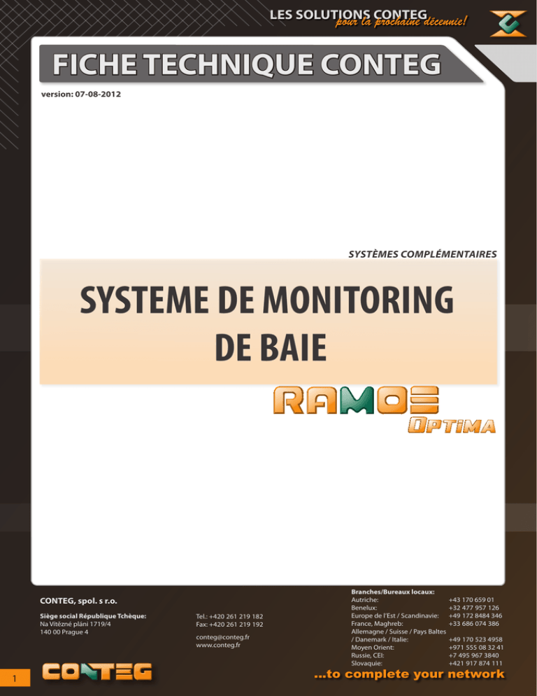 LES SOLUTIONS pour la CONTEG prochaine décennie! FICHE TECHNIQUE CONTEG version: 07-08-2012 SYSTÈMES COMPLÉMENTAIRES SYSTEME DE MONITORING DE BAIE CONTEG, spol. s r.o. Siège social République Tchèque: Na Vítězné pláni 1719/4 140 00 Prague 4 1 Tel.: +420 261 219 182 Fax: +420 261 219 192 [email protected] www.conteg.fr Branches/Bureaux locaux: Autriche: Benelux: Europe de l’Est / Scandinavie: France, Maghreb: Allemagne / Suisse / Pays Baltes / Danemark / Italie: Moyen Orient: Russie, CEI: Slovaquie: +43 170 659 01 +32 477 957 126 +49 172 8484 346 +33 686 074 386 +49 170 523 4958 +971 555 08 32 41 +7 495 967 3840 +421 917 874 111 …to complete your network LES SOLUTIONS pour la CONTEG prochaine décennie! RAMOS OPTIMA est la solution pour monitorer jusqu‘à 8 capteurs dits „intelligents“ (par exemple: avec 8 capteurs doubles [Température + Hygrométrie] jusqu’à 16 paramètres).C’est la solution idéale de une à plusieurs baies pour lesquelles 8 ports intelligents ou moins sont nécessaires. La solution du monitoring intelligent RAMOS Optima présente, pour une entreprise, les avantages d’une vitesse rapide, de précision et de l’intelligence d’un tel système.Le RA¬MOS Optima est un système avec un OS de type Linux embarqué qui inclut un stack TCP/IP ,un web serveur incorporé et des fonctions emailing et SNMP. RAMOS Optima peut enregistrer tous les évènements dans sa base de données avec une indication du temps auquel l’alarme du capteur s’est déclenchée. Un produit autonome sans aucune dépendance des logiciels utilisés, RAMOS Optima vous donnera le meilleur pour vos besoins de monitoring. Il possède 8 ports de capteurs intelligents auto sense qui travaillent avec une large plage de capteurs intelligents de la gamme RAMOS.Il peut être en effet utilisé pour monitorer, avec les capteurs respectifs, la température, l’hygrométrie, les fuites d’eau, le débit d’air,la sécurité et même contrôler des relais. Les capteurs RAMOS peuvent aussi être utilisés pour détecter des tensions de courant alternatif et mesurer des tensions de courant continu. Nos capteurs incluent une base de données et un package graphique intégrés pour la visualisation des débits d’air, la témpérature et l’hygrométrie. VUE DE FACE CARACTERISTIQUES DU RAMOS OPTIMA: • Supporte jusqu’à 8 ports de capteurs intelligents autosense • Chaque port de capteur intelligent peut être configuré comme entrée ou sortie • Tous les accessoires Ramos Optima sont alimentés par le module. • Spécificités E-mail et SNMP traps programmés. • TCP/IP et web-server embarqués. • Interface interne Linux Web-based pour une configuration et un monitoring facilités • Horloge interne secourue par batteries pour valider la date et le temps avec précision • Network Management System integré • Mots de passe requis pour les utilisateurs et l’administrateur assurant une meilleure sécurité 1 2 3 VUE ARRIERE 4 5 6 INFORMATIONS TECHNIQUES: • Dimensions: 216 x 138 x 46 mm • Tension d‘alimentation: 7 – 9 VDC, 1,2Amp • Puissance consommée typique: 1,12 Watt, 0,15A • Poids: 0,8 kg 1) LED informant sur l’alimentation électrique 2) LED indiquant l‘Activité / Liaison 3) 16 LED informant sur leurs états d’activités (activité réseau et états des lignes) 4) 8 ports de capteurs intelligents (RJ-45) 5) Base Standard Ethernet Base 10/100 6) Alimentation interne 7,5 Vdc Monitoring de baies Code Description RAMOS OPTIMA Monitoring RAMOS Optima [jusqu’à 8 ports Intelligents(Entrée/Sortie)], 1x capteur de température monté sur 30cm de câble, alimentation électrique avec son cordon, cordon patch de 1,5m, hauteur 1U avec fixations et CD d’installation. Accessoires Intelligents pour RAMOS Optima Code Description RMS-I-ST Capteur de Température monté sur 30cm de câble (RJ-45 incluse) 1 RMS-I-STH Capteurs de température et hygrométrique montés sur un seul câble de 30cm (RJ-45 incluse) 1 RMS-I-VC Convertisseur 4-20mA avec câble de 1,5m 1 RMS-I-AS Sirène & lumière Stroboscopique avec câble de 1,5m 1 RMS-I-AF Capteur de flux d’air monté sur un câble de 1,5m 1 RMS-I-DE-01 Détecteur de fumée avec un câble de 1,5m 1 RMS-I-DE-02 Détection de présence avec câble supplémentaire de 1,5m 1 RMS-I-DE-04 Détecteur de fuite d’eau monté sur 4,5m de cable 2 RMS-I-DE-06 Capteurs d’eau montés sur un câble actif de 3m , 6m de câble sans capteur et 1.5m de câble pour la connexion 1 RMS-I-MK Contact magnétique de porte monté sur un câble de 4,5m 2 RMS-I-DRC Contact sec monté sur un câble de 4,5m 2 RMS-I-PWR-NO Capteur controlant un relais AC normalement ouvert (110V/220V ) 1 RMS-I-CON Coupleur CAT.5e RJ45-RJ45 pour des extensions de câbles (par 10 pcs)cs peut etre rallongé à l’aide de câble LAN (Cat. 5e/6) 2 peut être rallongé à l’aide de câble LAN (Cat. 5e/6) et d’un coupleur RJ45 pour la connexion 1 2 www.conteg.fr …to complete your network :: monitoring de baie Le RAMOS (RAck MOnitoring System pour Monitoring de baie) a été conçu pour être installé dans une baie et contrôler son environnement intérieur comme extérieur. Tel un système dédié, le RAMOS peut reporter les états des capteurs installés en n’importe quel endroit du monde, en utilisant le protocole SNMP. Il peut être intégré à tout type de logiciel de supervision tel que HP OpenView. LES SOLUTIONS pour la CONTEG prochaine décennie! Accessoires: Capteur de température avec 30cm de câble. Capteur Autosense de température contrôlé par microprocesseur. Longueur 30m max (Cat.5/6 LAN) RMS-I-STH Capteur dual de température et d’hygrométrie montés sur 30cm de câble. Possible de connecter sur l’unité jusqu’à 8 capteurs de ce type. Plage d’hygrométrie de 0 à 100%. RMS-I-VC Convertisseur 4-20mA avec un câble LAN (Cat. 5) de 1.5m. Le convertisseur collecte les valeurs analogiques d’une large gamme de capteurs. RMS-I-AS 