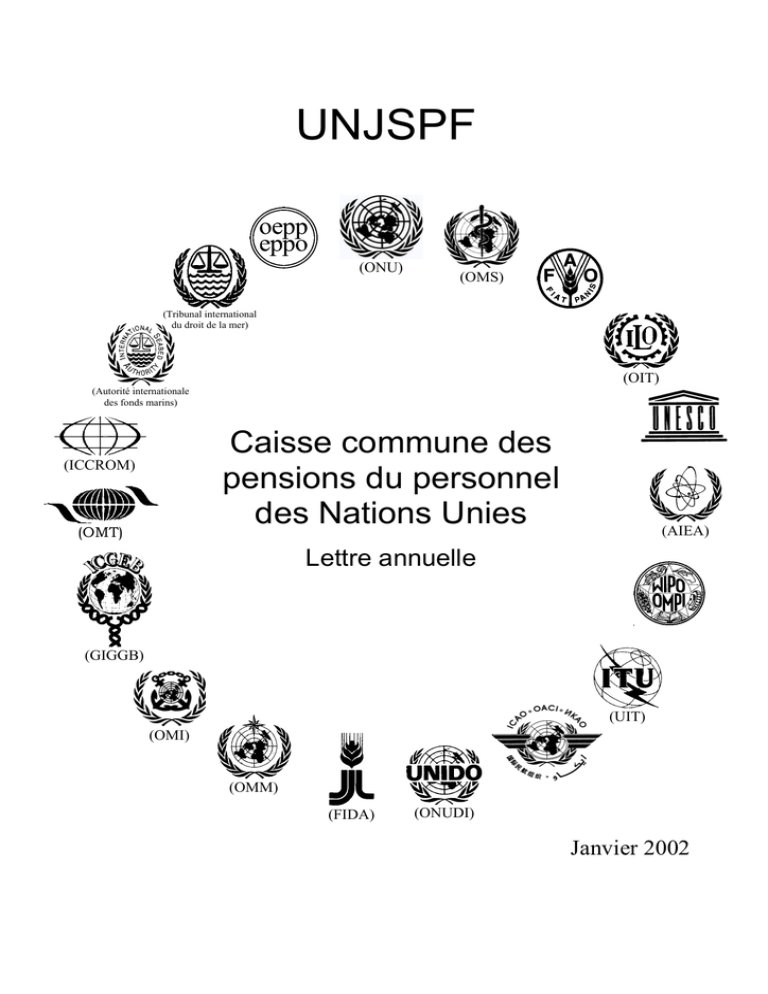 UNJSPF (ONU) (OMS) (Tribunal international du droit de la mer) (OIT) (Autorité internationale des fonds marins) Caisse commune des pensions du personnel des Nations Unies (ICCROM) (OMT) (AIEA) Lettre annuelle (GIGGB) (UIT) (OMI) (OMM) (FIDA) (ONUDI) Janvier 2002 -2UNITED NATIONS NATIONS UNIES UNITED NATIONS JOINT STAFF PENSION FUND CAISSE COMMUNE DES PENSIONS DU PERSONNEL DES NATIONS UNIES NEW YORK (Headquarters) UNITED NATIONS, N.Y. 10017 Tel: (212) 963-6931; Fax: (212) 963-3146 E-mail: [email protected] Cable: UNATIONS NEWYORK Web: http://www.un.org/unjspf GENÈVE PALAIS DES NATIONS D-108, CH-1211, GENÈVE 10 Tél: +41 (22) 917-1824; Fax: +41 (22) 917- 0004 E-mail: [email protected] Web: http://www.unog.ch/penfund Lettre annuelle de l’administrateur New York, janvier 2002 Madame, Monsieur, Comme il est depuis longtemps d’usage à la Caisse, je vous écris pour vous informer de diverses questions concernant les pensions et des faits nouveaux survenus au cours de l’année 2001. Vous trouverez également ci-après des informations mises à jour sur le fonctionnement de la Caisse et l’évolution récente de ses avoirs. INFORMATIONS INTÉRESSANT LES BÉNÉFICIAIRES Ajustement des pensions en dollars des États-Unis au 1er avril 2002 Je tiens tout d’abord à signaler qu’il n’y aura pas d’ajustement des pensions en dollars des États-Unis au 1er avril 2002, le mouvement de l’indice des prix à la consommation (IPC) des États-Unis sur la période allant de décembre 2000 à décembre 2001 n’ayant pas atteint le seuil requis de 2 %. La hausse de l’IPC des États-Unis au cours de cette période sera prise en compte pour la période suivante, qui ira donc de décembre 2000 à décembre 2002. Pour les bénéficiaires qui ont choisi le système de la double filière, l’ajustement des pensions en monnaie locale au 1er avril 2002 dépendra de l’évolution de l’IPC dans le pays de résidence, pour autant que le seuil de 2 % soit atteint. En cas de majoration du montant des prestations, les intéressés en seront avisés lors du versement de leur pension d’avril 2002, qui interviendra soit le 1er avril pour ceux qui sont partis à la retraite avant le 31 décembre 1984 soit le 1er mai pour ceux qui sont partis à la retraite après cette date. Associations de retraités Il convient de signaler qu’une aide et des renseignements précieux peuvent être obtenus auprès de la FAAFI et de ses associations membres. Ces associations, grâce à l’expérience de leurs adhérents sont une mine d’informations et de conseils non seulement en matière de pensions, mais aussi en ce qui concerne les législations nationales et d’autres aspects de la vie dans les pays du monde entier. Par l’appui et l’assistance qu’elles apportent à l’égard des questions et objectifs qui ont conduit leurs adhérents, comme ceux d’entre nous qui sont encore en fonctions, à devenir des fonctionnaires internationaux, ces associations demeurent des «partenaires» du secrétariat de la Caisse et des organisations affiliées. Plus précisément, la FAAFI apporte une aide précieuse pour la certification des droits à pension et continue de participer activement et efficacement aux délibérations du Comité mixte de la Caisse et de son Comité permanent. -3- Vous trouverez dans l’annexe à la présente lettre une liste mise à jour des associations membres de la FAAFI, avec indication de leur adresse, ainsi que d’autres sources d’assistance aux retraités. Veuillez noter que de nouvelles adresses figurent sur cette liste, à savoir celles d’associations qui viennent d’être constituées: l’Association thaï d’anciens fonctionnaires internationaux (AFICST); la section de Beyrouth de l’Association des anciens fonctionnaires internationaux (ouverte aux anciens fonctionnaires internationaux résidant au Liban, en Syrie et en Jordanie); et l’Association congolaise des anciens fonctionnaires des Nations Unies. Je signale aux nombreux bénéficiaires résidant dans la région de Genève qu’ils peuvent aussi obtenir une assistance auprès des associations d’anciens fonctionnaires des différentes organisations sises à Genève, l’ONU, l’OIT, l’OMS, l’OMM et l’UIT notamment. Fonds de secours Je rappelle aux bénéficiaires qu’un fonds de secours a été créé pour aider à alléger quelque peu les difficultés financières que la maladie, une infirmité liée à l’âge ou d’autres raisons analogues peuvent occasionner à des bénéficiaires de pensions modestes et ce, en apportant une aide dans les cas d’urgence avérés. Il convient de noter toutefois que le fonds de secours n’est pas censé servir à compléter une pension que le bénéficiaire juge insuffisante; il n’a pas non plus vocation à financer l’octroi de prêts ou à remplacer une assurance maladie. Je rappelle également que la lettre annuelle de l’Administrateur de janvier 1999 contient des renseignements concrets concernant l’aide que les bénéficiaires peuvent, en cas de difficulté financière, obtenir auprès du fonds de secours ou d’autres sources. Cette information peut être consultée sur le site Web de la Caisse, à l’adresse Internet suivante: (http://www.un.org/unjspf). Les personnes qui ne disposent pas d’une connexion Internet peuvent obtenir un exemplaire de la lettre de janvier 1999 auprès du secrétariat du comité des pension de l’organisation dont ils sont ou ont été fonctionnaires. Toujours concernant les aides d’urgence, l’Association des anciens fonctionnaires de la FAO et d’autres anciens fonctionnaires des Nations Unies (FFOA) m’a demandé de signaler aux bénéficiaires de la Caisse que la FFOA a créé un «fonds de secours» pour venir en aide à ses membres; les demandes d’assistance doivent être adressées au président du sous-comité chargé du fonds de secours de la FFOA, auprès de la FAO, et porter la mention «strictement con