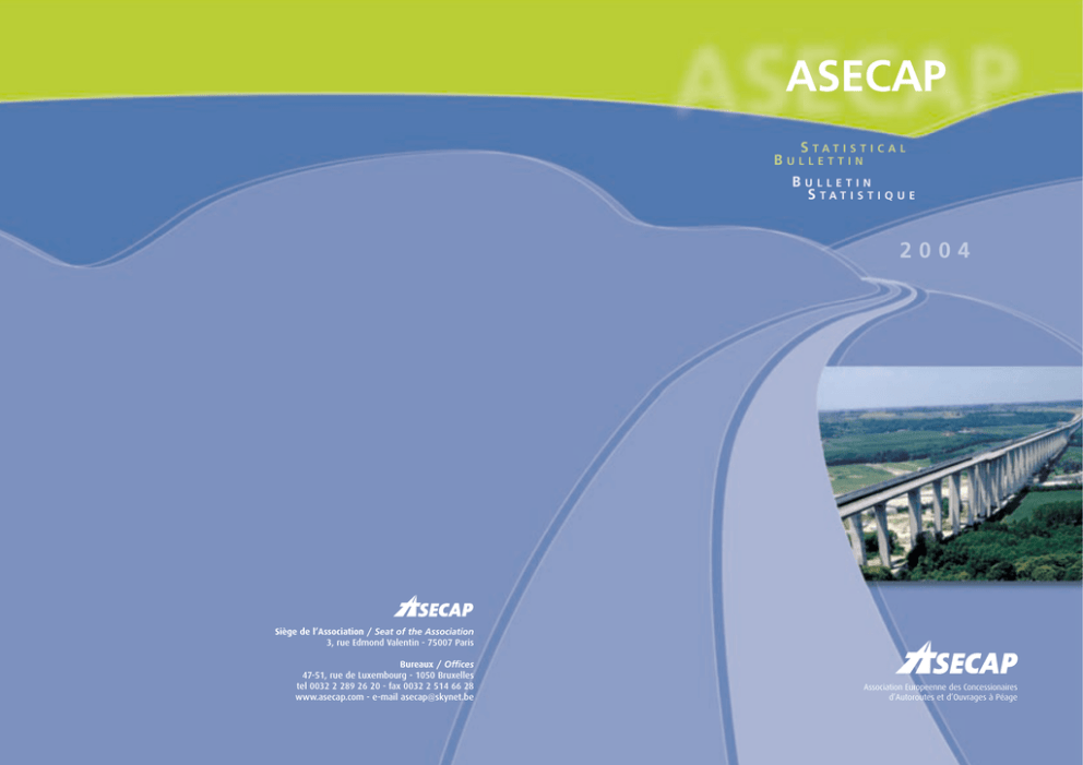 ASECAP STATISTICAL BULLETTIN BULLETIN STATISTIQUE 2004 Siège de l’Association / Seat of the Association 3, rue Edmond Valentin - 75007 Paris Bureaux / Offices 47-51, rue de Luxembourg - 1050 Bruxelles tel 0032 2 289 26 20 - fax 0032 2 514 66 28 www.asecap.com - e-mail [email protected] Association Europeenne des Concessionaires d’Autoroutes et d’Ouvrages à Péage TEO Fonds Routier National Hellenique SUND & BAELT Holding A/S AKA Alföld Koncessziós Autópálya R.T. DARS DRUZBA ZA AVTOCESTE V REPUBLIKI SLOVENIJI, d.d. (Motorway Company in the Republic of Slovenia) NORVEGFINANS Norske Vegfinansieringsselskapers Forening Consortium “Transmagistral” BRISA Auto-Estradas de Portugal, S.A. Serbian Road Authority T A B L E AISCAT Associazione Italiana Società Concessionarie Autostrade e Trafori 4 MEMBRES / MEMBERS 6 STATISTIQUES GÉNÉRALES / GENERAL STATISTICS 8 SOCIÉTÉS ET AUTOROUTES / COMPANIES C O N T E N T S ASFA Association des Sociétés Françaises d'Autoroutes et d'ouvrages à péage HUKA Hrvatska Udruga Koncesionara za Autoceste s naplatom cestarine D E S ASETA Asociación de Sociedades Españolas Concesionarias de Autopistas, Túneles, Puentes y Vías de Peaje N.V. Tunnel Liefkenshoek M A T I È R E S ASFINAG Autobahnen und Schnellstraßen Finanzierungs Aktiengesellschaft PRÉFACE / FOREWORD AND MOTORWAYS 14 AUTRICHE / AUSTRIA 16 BELGIQUE / BELGIUM 18 CROATIE / CROATIA 18 DANEMARK / DENMARK 20 ESPAGNE / SPAIN 22 FRANCE / FRANCE 29 GRECE / GREECE 35 HONGRIE / HUNGARY 36 ITALIE / ITALY 37 NORVEGE / NORWAY 43 PORTUGAL / PORTUGAL 49 SERBIE / SERBIA 51 SLOVENIE / SLOVENIA 53 UKRAINE / UKRAINA 55 DÉFINITIONS / DEFINITIONS 56 PRÉFACE / FOREWORD 4 MEMBRES / MEMBERS 6 STATISTIQUES GÉNÉRALES / GENERAL STATISTICS 8 SOCIÉTÉS ET AUTOROUTES / COMPANIES MOTORWAYS 14 BELGIQUE / BELGIUM 18 CROATIE / CROATIA 18 DANEMARK / DENMARK 20 ESPAGNE / SPAIN 22 FRANCE / FRANCE 29 GRECE / GREECE 35 HONGRIE / HUNGARY 36 ITALIE / ITALY 37 NORVEGE / NORWAY 43 Crédits Photo / Photos’ Credit PORTUGAL / PORTUGAL 49 ASECAP SERBIE / SERBIA 51 SLOVENIE / SLOVENIA 53 UKRAINE / UKRAINA 55 D E S T A B L E Mc GRAPHIS C O N T E N T S 16 M A T I È R E S AUTRICHE / AUSTRIA Réalisation / Conception DÉFINITIONS / DEFINITIONS 66 AND 56 ASECAP est l'association professionnelle des concessionnaires d'autoroutes et ouvrages à péage d'Europe. Elle réunit et représente 119 sociétés et établissements qui gèrent plus de 23.000 kilomètres d'autoroutes et d'ouvrages à péage dans 14 pays européens. Les missions de l'ASECAP consistent en: L’ SECAP is the professional association of European toll road, bridge and tunnel operators. It brings together and represents 119 companies and establishments that manage more than 23,000 kilometres of toll roads, bridges and tunnels in 14 European countries. ASECAP's missions are: A • défendre le système de la concession à péage comme le moyen le plus efficace de financement de la construction et de l'exploitation des autoroutes et des grands ouvrages à péage; • to defend the toll concession system as the most effective means of financing the construction and operation of toll roads, bridges and tunnels; • to promote the image of the toll concession sector as a key element of a sustainable transport policy and to participate in research programmes and experiments to boost the efficiency of the networks and improve the level of services provided to users. • promouvoir l'image du secteur autoroutier concédé en tant qu'élément essentiel pour une politique durable des transports et participer aux programmes de recherches et d'expérimentation pour renforcer l'efficacité des réseaux et améliorer le niveau de services offerts aux clients. Avec un chiffre d'affaires de plus de 13 milliards d'Euros, les membres de l'ASECAP constituent un ensemble économique puissant au service du développement de l'Europe et de la mobilité de ses citoyens. Cette brochure retrace le détail de leurs caractéristiques économiques et financières. O R E W O R D L'ASECAP et ses membres mettent leur savoir-faire et leur modèle économique - la concession à péage - au service d'une politique de développement économique et de progrès social durables dans l'Europe nouvellement élargie. L'ASECAP offre aux nouveaux pays membres des procédures d'échanges et d'enrichissement mutuel afin de les aider à développer les infrastructures nécessaires à leur pleine intégration dans l'Union. ASECAP has proven its worth in recent years as a partner of the European Commission and the European Parliament in the field of land transport. Following publication of the White Paper on European Transport Policy for 2010, ASECAP contributed to the finalisation of texts concerning trans-European road network charging, electronic tolling and road safety. F P R É F A C E L'ASECAP s'est affirmée au cours des dernières années comme un partenaire de la Commission et du Parlement européen dans le domaine des transports terrestres. A la suite du Livre Blanc sur les transports à l'horizon 2010, elle a contribué à la mise au point des textes concernant la tarification des réseaux trans-européens, le télépéage et la sécurité routière. ASECAP and its members place their knowledge and their toll concession economic model at the service of sustainable economic development and social progress in the newly enlarged Europe. ASECAP offers new Member States mutual exchange and enrichment procedures to help them to develop the infrastructure required for their full integration into the European Union. With turnover of more than 13 billion Euros, ASECAP members form a powerful economic force at the service of European development and citizen mobility. This brochure provides an overview of their economic and financial characteristics. I hope that you enjoy reading it. Je vous en souhaite bonne lecture. RÉMY CHARDON RÉMY CHARDON Président de l’ASECAP ASECAP President GRECE / GREECE TE