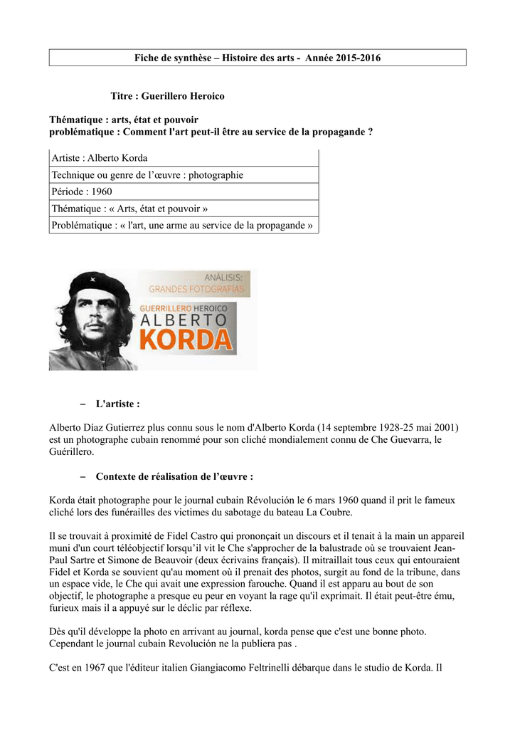 Fiche de synthèse – Histoire des arts - Année 2015-2016 Titre : Guerillero Heroico Thématique : arts, état et pouvoir problématique : Comment l'art peut-il être au service de la propagande ? Artiste : Alberto Korda Technique ou genre de l’œuvre : photographie Période : 1960 Thématique : « Arts, état et pouvoir » Problématique : « l'art, une arme au service de la propagande » – L'artiste : Alberto Díaz Gutierrez plus connu sous le nom d'Alberto Korda (14 septembre 1928-25 mai 2001) est un photographe cubain renommé pour son cliché mondialement connu de Che Guevarra, le Guérillero. – Contexte de réalisation de l’œuvre : Korda était photographe pour le journal cubain Révolución le 6 mars 1960 quand il prit le fameux cliché lors des funérailles des victimes du sabotage du bateau La Coubre. Il se trouvait à proximité de Fidel Castro qui prononçait un discours et il tenait à la main un appareil muni d'un court téléobjectif lorsqu’il vit le Che s'approcher de la balustrade où se trouvaient JeanPaul Sartre et Simone de Beauvoir (deux écrivains français). Il mitraillait tous ceux qui entouraient Fidel et Korda se souvient qu'au moment où il prenait des photos, surgit au fond de la tribune, dans un espace vide, le Che qui avait une expression farouche. Quand il est apparu au bout de son objectif, le photographe a presque eu peur en voyant la rage qu'il exprimait. Il était peut-être ému, furieux mais il a appuyé sur le déclic par réflexe. Dès qu'il développe la photo en arrivant au journal, korda pense que c'est une bonne photo. Cependant le journal cubain Revolución ne la publiera pas . C'est en 1967 que l'éditeur italien Giangiacomo Feltrinelli débarque dans le studio de Korda. Il cherchait des photos du Che et Korda lui remet la photo que le journal n'avait pas voulu publier. En octobre 1967 le Che meurt et Feltrinelli imprime la photo de Korda sur une affiche de un mètre sur 70 centimètres. Et il en vendit un million d'exemplaires. C'est cette photo qui sera reprise dans les manifestations, les affiches pour illustrer la plupart des publications. – Caractéristiques de l'image : La photographie de Korda concentre toutes les vertus qu'on attribue au Che : honnêteté, bravoure, désintéressement, loyauté, fierté, virilité militaire Le visage du Che exprime la fermeté face aux USA, la confiance en l'avenir de la Révolution cubaine, la négligence (barbe, cheveux longs au vent), le sérieux de l'engagement (l'étoile de commandant sur son béret). – La révolution cubaine : Le régime autoritaire et corrompu de Fulgencio Batista, au pouvoir depuis le coup d'état du 10 mars 1952, est combattu par un groupe d'opposants au régime menés par le jeune avocat Fidel Castro. Après l'échec de sa tentative de soulèvement armé du 26 juillet 1953, Castro est contraint à l'exil au Mexique. Il y rencontre Ernesto Guevara, jeune médecin argentin, et s'initie aux techniques de la guérilla. Il reprend la lutte armée contre le régime de Batista en 1956 et trouve des soutiens dans toutes les couches de la société, étudiants, ouvriers, paysans. En janvier 1959, après deux ans de guérilla, l'Armée rebelle de Castro profite d'une grève générale qui paralyse le pays pour prendre le pouvoir triomphalement à La Havane. Le retentissement de la révolution cubaine est alors immense, dans le monde entier. Dans les années 60, les révolutionnaires cubains mettent en place des réformes sociales radicales : réforme agraire limitant la propriété, grands travaux, lutte contre la pauvreté. – Che Guevarra : • Près de 48 ans après sa mort, Ernesto Che Guevara est toujours considéré, par une grande partie de l’opinion publique, comme le défenseur des valeurs anticapitalistes et communistes. De nombreux mouvements contestataires réutilisent et élargissent ses idéaux dans le monde. La célèbre photo de Korda prise à La Havane, lors d’un discours de Fidel Castro a évidemment participé à maintenir intacte cette image de révolutionnaire. • Le Che est un homme de terrain, un révolutionnaire qui a donné sa vie pour lutter contre l’impérialisme américain. Mais son image a été récupérée pour servir d’autres causes. Le mythe n’incarne plus nécessairement les idéaux qu’il défendait. • Le Che ainsi que la célèbre photo de Korda n’appartiennent plus à la cause pour laquelle ils s’étaient engagés mais à l’imaginaire collectif avec toutes les dérives commerciales que cela peut comporter . Guevara, Che (Ernesto Guevara) Revolucionario cubano de origen argentino (Rosario, 1928Higueras, Bolivia, 1967). Después de doctorarse en medicina1 en Buenos Aires, tomó parte en varias revueltas en Sudamérica. En México conoció a Fidel Castro(2), al que se unió para luchar contra el régimen de Batista. Tras el triunfo de la revolución cubana ocupó entre otros cargos(3) los de ministro de Economía y de Industria. Propugnó(4) una política marxista y antiimperialista frente a EE.UU5. En 1964 desapareció de la escena política para incorporarse a la guerrilla del Congo (1965-66) y más tarde a las de Bolivia, donde fue capturado en un combate por las fuerzas gubernamentales y ejecutado. Gran enciclopedia universal, Biblioteca el Mundo, 2004. 1. después de doctorarse en medicina: après avoir obtenu son doctorat en médecine. 2. primer ministro y presidente de Cuba de 1959 a 2008. 3. un cargo: un poste. 4. propugnar: défendre. 5. EE.UU= Estados Unidos. – Réseau d'oeuvres : C'est lors des révoltes étudiantes de mai 1968 en France que le peintre irlandais Jim Fitzpatrick va reproduire l'image et la styliser. Celle-ci va devenir un des symboles enblématiques de la lutte étudiante. On retrouve des symboles forts dans cette image : le fond rouge symbolise la révolution,le béret symbolise la lutte armée, la barbe et les cheveux au vent renvoient à la figure du guérillero (membre d'une unité a