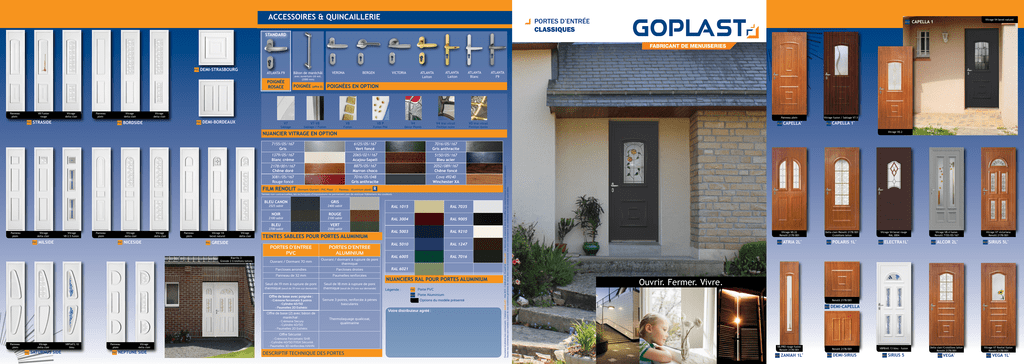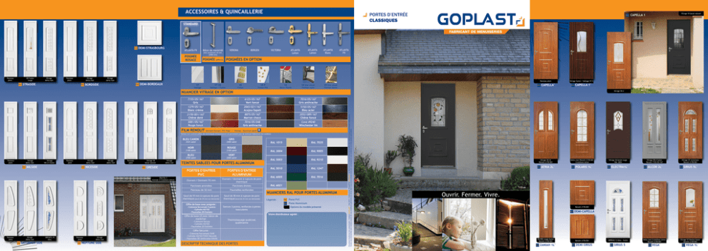 ACCESSOIRES & QUINCAILLERIE Portes d’entrée CLASSIQUES Standard PVC Panneau plein V8 Fusion rouge PVC Vitrage delta clair Panneau plein Vitrage delta clair STRASIDE PVC DEMI-STRASBOURG ATLANTA F9 Bâton de maréchâl Poignée ROSACE Poignée VERONA BERGEN VICTORIA ATLANTA Laiton ATLANTA Laiton avec ouverture clé ext. (2000 mm) ATLANTA Blanc ALU ATLANTA F9 PoignéeS EN OPTION (offre 2) Vitrage delta clair Panneau plein BORDSIDE PVC DEMI-BORDEAUX V7 Sablage V7-V8 V8 Sablage / Fusion V8 P Fusion V4 Fusion Pilé V4 Vrai vitrail Finition noire Décor Plomb V0 Vrai vitrail ALU Finition dorée Vitrage fusion / Sablage V7.5 CAPELLA * ALU CAPELLA 1* NUANCIER VITRAGE EN OPTIOn 6125/05/167 Vert foncé 7016/05/167 Gris anthracite 1379/05/167 Blanc crème 2065/021/167 Acajou-Sapeli 5150/05/167 Bleu acier 2178/001/167 Chêne doré 8875/05/167 Marron choco 2052/089/167 Chêne foncé 3081/05/167 Rouge foncé 7016/05/048 Gris anthracite Cova 49240 Winchester XA FILM RENOLIT (Dormant/Ouvrant : PVC Plaxé / Panneau : Aluminium plaxé) R Teintes non contractuelles, les techniques d’impressions ne permettent pas de restituer fidèlement les couleurs. 2525 sablé NOIR Vitrage delta clair PVC Vitrage V8 2.5 fusion Panneau plein Vitrage delta clair MILSIDE PVC NICESIDE Vitrage delta clair Panneau plein Vitrage V4 bevel naturel PVC Vitrage delta clair GRESIDE Biarritz 3 Greside 2 Croisillons laitons 2100 sablé BLEU VERT 2500 sablé Teintes sablees pour portes aluminium PORTES D’ENTREE PVC PORTES D’ENTREE ALUMINIUM Ouvrant / Dormant 70 mm Ouvrant / dormant à rupture de pont thermique Parcloses arrondies Parcloses droites Panneau de 32 mm Paumelles renforcées Seuil de 19 mm à rupture de pont thermique (seuil de 39 mm sur demande) Seuil de 18 mm à rupture de pont thermique (seuil de 24 mm sur demande) Offre de base avec poignée : - Crémone fercomatic 5 points - Cylindre 40/50 - Paumelles 2D Esthétic Offre de base (2) avec bâton de maréchal : - Crémone Secury - Cylindre 40/50 - Paumelles 2D Esthétic Serrure 3 points, renforcée à pènes basculants Vitrage delta clair PVC SATURNUS SIDE V8PSAT2.10 bleu Panneau plein PVC Vitrage delta clair NEPTUNE SIDE RAL 7035 RAL 3004 RAL 9005 RAL 5003 RAL 9210 RAL 5010 RAL 1247 RAL 6005 RAL 7016 RAL 6021 Nuanciers ral pour portes aluminium Légende : PVC Porte PVC ALU Porte Aluminium Options du modèle présenté Votre distributeur agréé : Thermolaquage qualicoat, qualimarine Offre Sécurité : Panneau plein RAL 1015 ROUGE 2100 sablé 2700 sablé Panneau plein GRIS 2400 sablé - Crémone Fercomatic SHR - Cylindre 40/50 F11SX Sécurité - Paumelles 3D renforcées HAHN DEScriptif technique des portes Document et photos non contractuels - Création GOPLAST - Mai 2013 - Crédit photo : Euradif et GOPLAST - Le fabricant se réserve le droit de modifier ses caractéristiques techniques sans préavis. Toutes nos commandes sont traitées à partir de nos conditions générales de vente, dont vous reconnaissez avoir pris connaissance. ces conditions sont les seules applicables. Vitrage V0.2 7155/05/167 Gris BLEU CANON Vitrage V4 bevel naturel CAPELLA 1 Vitrage V0.22 Renolit 2178/001 ALU ATRIA 2L* Delta clair/Renolit 2178/001 Croisillons laiton ALU POLARIS 1L* Vitrage V4 bevel rouge RAL 3004 ALU ELECTRA1L* Vitrage V8.4 fusion Renolit 7155/05/167 ALU ALCOR 2L* Vitrage V7 victoriana Renolit 2178/001 ALU SIRIUS 5L* Ouvrir. Fermer. Vivre. Renolit 2178/001 ALU DEMI-CAPELLA V8.PRO rouge fusion Renolit 2178/001 ALU ZANIAH 1L* Renolit 2178/001 ALU DEMI-SIRIUS V8PBIA5.13 bleu - fusion ALU SIRIUS 5 Delta clair/Croisillons laiton Renolit 2178/001 * ALU VEGA Vitrage V7 flosital fusion Renolit 2178/001 * ALU VEGA 1L BIARRITZ 5 PVC PVC Vitrage V8P5.23 vert Vitrage V4 bevel rouge Straside STRASBOURG 1 PVC Vitrage delta clair Croisillons laiton Vitrage V4 bevel naturel PVC BIARRITZ 3 PVC BIARRITZ 3 Vitrage delta clair Croisillons blancs PVC STRASBOURG 1 Vitrage V8PSAT2.10 fusion bleu Vitrage V0.2 PVC PVC STRASBOURG 1 PVC BAILLEUL 1 Vitrage V4 bevel naturel PVC BAILLEUL 1 Panneau plein Vitrage V8 bleu PVC BAILLEUL 1 PVC PVC Vitrage V8.11 Bleu PVC CALVI 1 Vitrage Delta clair Croisillons laiton PVC CALVI 1 VitrageV4 bevel naturel CALVI 1 BORDEAUX Vitrage V8SIL32 PVC BORDEAUX 2 Vitrage V4.7 bevel bleu PVC AGDE 1L Vitrage V8.11 fusion vert PVC AGDE 1L Vitrage V4 bevel rouge PVC CANNES 1L Vitrage V0.16 PVC CANNES 1L PVC Vitrage V0.22 Vitrage V4 bevel naturel BREST 2L PVC PVC Vitrage V4C.ROSE.A Vitrage V4.8 bevel naturel PVC LILLE 1L Vitrage V7.5 fusion/sablage PVC LILLE 1L PVC Vitrage V8PMAR3.10 fusion MARS 3 PVC MARS 3 Vitrage delta clair PVC Panneau plein VENUS 3 PVC VENUS Vitrage V7SABL17 PVC RODEZ 3 Vitrage V8SPA 15 rouge PVC Vitrage V7SABL17 Panneau plein RODEZ 3 PVC RODEZ Panneau plein Vitrage V8 Vitrage delta clair Croisillons laiton Vitrage delta clair SATURNUS 2 RODEZ 3 Vitrage V8LILLE1L.11 bleu PVC LILLE 1L Vitrage V8 flosital PVC SETE 1 L POSEIDON 2 ZEUS 1 Vitrage V7JUP1.3D PVC JUPITER 1 SETE 1 L PVC PLUTON 2 Vitrage delta clair PVC NEPTUNE 3 Vitrage V8NIC2.5 fusion bleu Vitrage V7 sablage PVC APPOLON 1 PVC NICE 2 Vitrage V8FS002 rouge PVC NIMES 1L Vitrage delta clair Petits bois thermoformés PVC GRENOBLE 1L Vitrage delta clair Petits bois thermoformés PVC NANTES 1L Vitrage delta clair Petits bois thermoformés PVC POITIERS 1 L Vitrage V8.5 Bleu Vitrage delta clair Croisillons laiton PVC Vitrage V7 Vitrage V4.5 Bevel naturel PVC Vitrage V8P ZEUS 1 Panneau plein PVC ZEUS 1 Vitrage V4.3 bleu PVC APHRODITE 2L Panneau plein PVC GENEVE 1 L Vitrage V0.6 PVC GENEVE 1L Vitrage delta clair PVC MILAN 4 Vitrage delta clair PVC RENNES 1 Vitrage V4 fleur de Lys PVC TOULOUSE 1