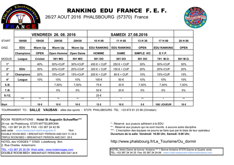 RANKING EDU FRANCE F. E. F. 26/27 AOUT 2016 PHALSBOURG (57370) France VENDREDI 26. 08. 2016 SAMEDI 27.08.2016 START 18H00 18H30 20H30 20H30 10 H 00 11 H 00 13 H 30 17 H 00 20 H 00 DISZ. EDU Warm Up Warm Up Warm Up EDU RANKING EDU RANKING OPEN EDU RANKING OPEN Champions OPEN HOMME DAME SIMPLE KO D.Y.P. League Cricket 501 MO 501 MO 501 DO 501 DO 501 DO 701 M.O. 501 M.O. 40% 30%+CUP 30%+CUP 450 € + CUP 250 € + CUP 30% 30%+CUP 30% MODUS 1° Open Homme Open Dame 2° EDU 30% 20%+CUP 20%+CUP 300 € + CUP 150 € + CUP 20% 20%+CUP 20% 3° Champions 20% 15%+CUP 15%+CUP 200 € + CUP 80 € + CUP 15% 15%+CUP 15% 4° League 10% 10% 10% 100 € 50 € 10% 10% 10% 5./6. 7,50% 7,50% 75 € 30 € 7,50% 7,50% 7,50% 7./8. 5% 5% 50 € 20 € 5% 5% 5% ** ** ** 25 € * * ** * ** 10 € 10 € 10 € 12 € 10 € 5€ 10€/ JOUEUR 10 € 9./12. *** Start TOURNAMENT TO : SALLE VAUBAN - allée des sports - 57370 PHALSBOURG TEL : +33 672 81 23 99 (Christian) ROOM RESERVATIONS : Hotel St Augustin Schoeffler*** 24 rue de Phalsbourg 57370 MITTELBRONN TEL: +33 387 24 20 70 FAX: +33 387 24 42 56 web seite : www.restaurant-saint-augustin.fr 1km DOUBLE ROOM BED + BREAKFAST/ PERSON AND DAY 31,50 € TRIPLE ROOM BED + BREAKFAST/ PERSON AND DAY 29 € * : Réservé aux joueurs adhérent à la EDU ** : Réservé aux joueurs qui ne sont inscrits à aucune autre discipline *** : L'inscription des équipes ne pourra se faire que par le biais de leur opérateur Ouverture de la salle Vendredi: 16.00 Uhr, Samedi: 9.00 Uhr, HOTEL des VOSGES ** 57820 Lutzelbourg 3km 2, Rue Charles Ackermann http://www.phalsbourg.fr/Le_Tourisme/Ou_dormir TEL: +33 387 25 30 09 Web seite : www.hotelvosges.com DOUBLE ROOM BED+ BREAKFAST/ PERSONN AND DAY 40 € HOTEL Notre Dame de bonne- fontaine *** 1 Bonne fontaine 57370 Danne et Quatre vents TEL: +33 387 24 34 33 Fax: 00 387 24 24 64 www.hotel-restaurant-ndbonnefontaine.com