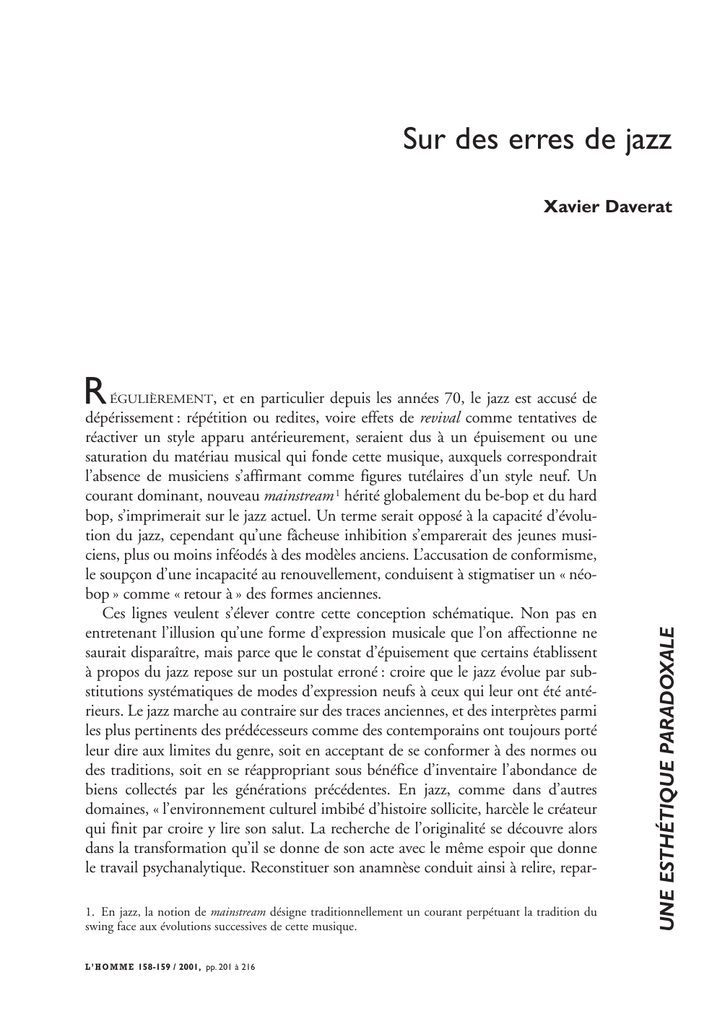 Sur des erres de jazz Xavier Daverat , et en particulier depuis les années 70, le jazz est accusé de R dépérissement : répétition ou redites, voire effets de revival comme tentatives de réactiver un style apparu antérieurement, seraient dus à un épuisement ou une saturation du matériau musical qui fonde cette musique, auxquels correspondrait l’absence de musiciens s’affirmant comme figures tutélaires d’un style neuf. Un courant dominant, nouveau mainstream 1 hérité globalement du be-bop et du hard bop, s’imprimerait sur le jazz actuel. Un terme serait opposé à la capacité d’évolution du jazz, cependant qu’une fâcheuse inhibition s’emparerait des jeunes musiciens, plus ou moins inféodés à des modèles anciens. L’accusation de conformisme, le soupçon d’une incapacité au renouvellement, conduisent à stigmatiser un « néobop » comme « retour à » des formes anciennes. Ces lignes veulent s’élever contre cette conception schématique. Non pas en entretenant l’illusion qu’une forme d’expression musicale que l’on affectionne ne saurait disparaître, mais parce que le constat d’épuisement que certains établissent à propos du jazz repose sur un postulat erroné : croire que le jazz évolue par substitutions systématiques de modes d’expression neufs à ceux qui leur ont été antérieurs. Le jazz marche au contraire sur des traces anciennes, et des interprètes parmi les plus pertinents des prédécesseurs comme des contemporains ont toujours porté leur dire aux limites du genre, soit en acceptant de se conformer à des normes ou des traditions, soit en se réappropriant sous bénéfice d’inventaire l’abondance de biens collectés par les générations précédentes. En jazz, comme dans d’autres domaines, « l’environnement culturel imbibé d’histoire sollicite, harcèle le créateur qui finit par croire y lire son salut. La recherche de l’originalité se découvre alors dans la transformation qu’il se donne de son acte avec le même espoir que donne le travail psychanalytique. Reconstituer son anamnèse conduit ainsi à relire, repar1. En jazz, la notion de mainstream désigne traditionnellement un courant perpétuant la tradition du swing face aux évolutions successives de cette musique. L ’ H O M M E 158-159 / 2001, pp. 201 à 216 UNE ESTHÉTIQUE PARADOXALE ÉGULIÈREMENT 202 courir, réinterpréter sans cesse le domaine de la civilisation artistique avec la croyance, l’espoir de se régénérer soi-même en le régénérant »2 . En suivant l’évolution du jazz, à la trace, on doit accepter l’idée d’une modernité sans ruptures, et admettre qu’en ses brisées récentes il conserve ce potentiel d’altérité qui constitue sa marque indéfectible. Une modernité sans rupture Si les traces d’un jazz antérieur sont toujours demeurées prégnantes, ce n’est pas forcément parce qu’on cherche à les rétablir ou à les célébrer, mais parce que cellesci ne s’épuisent pas. Certes, des tendances au remake ou au ressassement peuvent être mises sur le compte d’interprètes peu inspirés. Mais la constitution d’un bagage, l’engrangement des traditions dans un passé culturel, sont consubstantiels de l’évolution du jazz. L’absence d’épuisement des formes anciennes Il faut réviser la vieille conception selon laquelle chaque courant stylistique du jazz est venu se substituer à celui qui l’a précédé, comme si une relève (Aufhebung), un dépassement des formes antérieures qui deviendraient caduques ou s’éteindraient 3, serait le seul vecteur de son évolution. Contrairement à ce que laissent entendre les « histoires du jazz » très didactiques, la swing era n’a pas fait disparaître le style New Orleans, le bop n’a pas remplacé le swing, le free jazz n’a pas signé l’arrêt de mort du swing et du bop, tandis que la génération des lofts, au milieu des années 70, n’a pas supplanté le free des années 60. Au contraire de cette vision qui rameute le mythe de la destruction et de la renaissance, les caractéristiques de chaque style demeurent quand en apparaît un autre. Ainsi, pour mêler les générations, l’orchestre de Count Basie enregistrait la Kansas City Suite trois semaines après que John Coltrane eut fixé la version Atlantic de My Favorite Things, Duke Ellington donnait au disque une nouvelle version de Things Ain’t What They Used To Be quelques mois après que Miles Davis eut organisé les séances de Kind Of Blue, et, à quelques semaines d’intervalle, les studios accueillaient des musiciens aussi différents que Ben Webster (See You At The Fair), Andrew Hill (Judgement) et Albert Ayler (Witches And Devils)… Ou, pour élargir à des courants stylistiques, on sait bien que les musiciens de la West Coast ont mixé savamment bop et souplesse d’exécution héritée du swing (la dette à Count Basie est immense), donné à leur musique un grain particulier (au travers notamment du jeu des saxophonistes qui devait beaucoup à Lester Young), témoigné d’une affection pour les standards et privilégié un attachement à la 2. C. Deliège, « Création musicale autonome et (non) évidence sociale », in Musique et société. Hommages à Robert Wangermée, Bruxelles, Éd. de l’Université de Bruxelles, 1988 : 195. 3. Sur la traduction du mot et l’idée de suppression qu’il contient, voir la note du traducteur in G. W. H. Hegel, La Phénoménologie de l’esprit, trad. J. Hyppolite, Paris, Aubier Montaigne, 1997 (« Philosophie de l’esprit »), vol. I : 19, n. 34. Cf. aussi l’allusion à une « autosuppression » in Alexandre Kojève, Introduction à la lecture de Hegel, Paris, Gallimard, NRF, 1968 (« Bibliothèque des idées ») : 123. Xavier Daverat 4. Pierre Boulez, « Style ou idée ? (éloge de l’amnésie) », in Points de repère, Paris, Christian Bourgois (« Musique/Passé/Présent »), 1981 : 312 sq. Croire au progrès systéma