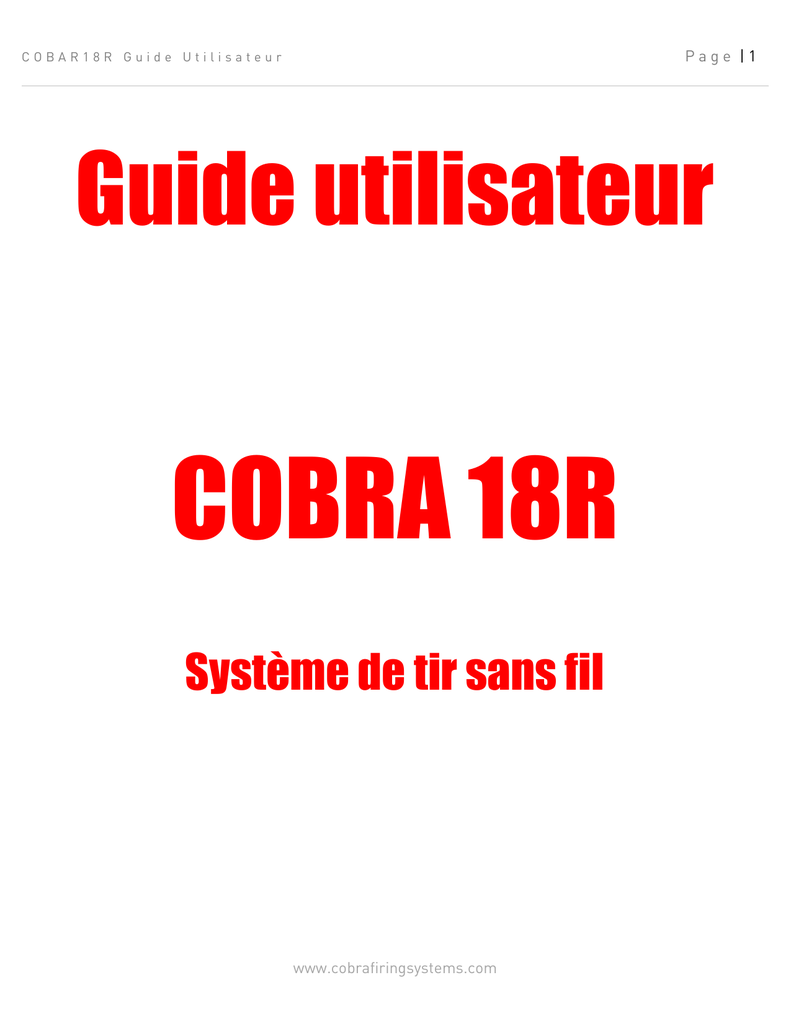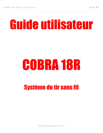 Page |1 COBAR18R Guide Utilisateur Guide utilisateur COBRA 18R Système de tir sans fil www.cobrafiringsystems.com Page |2 COBAR18R Guide Utilisateur TABLE DES MATIÈRES 1. INTRODUCTION SUR LE SYSTEME........................................................................................................................... 3 Spécifications techniques........................................................................................................................................... 3 2. MISE SOUS TENSION.............................................................................................................................................. 4 Télécommande........................................................................................................................................................... 4 Module de mise à feu.................................................................................................................................................. 5 Mode jour et nuit......................................................................................................................................................... 7 3. SYNCHRONISATION DE LA TELECOMMANDE / MODULE DE MISE A FEU..................................................................8 Synchroniser un module de mise à feu à une télécommande................................................................................... 8 Désynchroniser un module de mise à feu.................................................................................................................. 8 Désynchroniser une télécommande........................................................................................................................... 8 4. MESURER LA QUALITE DES LIAISONS DES POSITIONS DE TIR................................................................................ 9 4. INSERER ET TESTER LES E-MATCHES / IGNITERS CLIPS.......................................................................................11 Insérer les e-matchs / igniters clips........................................................................................................................ 12 Tester les e-matchs / igniters clips.......................................................................................................................... 13 5. DEFINIR LE CANAL DU MODULE DE TIR.................................................................................................................15 6. ARMER LES MODULES DE TIR............................................................................................................................... 16 7. MISE A FEU DES LIGNES....................................................................................................................................... 17 Tir en manuel............................................................................................................................................................ 17 Tir pas à pas (step).................................................................................................................................................... 17 Tir en séquence......................................................................................................................................................... 17 8. Versions............................................................................................................................................................... 18 www.cobrafiringsystems.com Page |3 COBAR18R Guide Utilisateur 1. INTRODUCTION SUR LE SYSTÈME Le COBRA18 est un système de tir sans fil, compact et robuste, idéal pour des feux de petites à moyennes tailles, ou pour des configurations nécessitant une installation rapide. Le système est facilement extensible car il peut contrôler un nombre illimité de modules à travers 100 canaux uniques et tout ceci à partir d'une seule télécommande. Contrairement aux systèmes de tir traditionnels, le COBRA18 possède une communication bidirectionnelle entre sa télécommande et ses modules de mise à feu. Cette fonctionnalité nous permet d'afficher sur la télécommande des informations en provenance des modules, comme la force du signal et la continuité des lignes. Et ceci pour tous les canaux. TECHNICAL SPECIFICATIONS Dimensions du module de tir 20.94cm x 16.42cm x 4.12cm (18M) Dimensions de la télécommande 20.8cm x 10.3cm x 4.12cm (18R) Alimentation 18M 1 x 9v pile pour le fonctionnement (5+ heures en fonctionnement actif, 24+ heures en veille) 2 x 9v piles pour les tirs des lignes (permet d'allumer 3,000+ eAlimentation 18R Base et clavier à distance Matériel utilisé Fréquence Portée du système matches / 500+ igniter clips) 3 x AA (15+ heures en fonctionnement actif, 72+ heure sen veille)) Silicone rétroéclairé ABS - Résiste aux impacts et retarde le feu 2.4 GHz (spectre étalé) 300m+ en ligne directe / fonction de détection de la qualité de la liaison sans fil Normes FCC (ID: W7Z-ICP0), CE, IC certifié module RF Max # inflamateurs e-matches / 10 inflamateurs e-matches en série ou 4 e-matches / igniters igniter clips par ligne clips en parallèle (18 Volts et 6 Ampères par ligne) Méthodes de tir Manuel, pas à pas (step) et séquence (0.1-9.9s) Canaux 100 canaux avec modules de tir illimités Portée du signal 1,500+ ft. / 500+ m. www.cobrafiringsystems.com Page |4 COBAR18R Guide Utilisateur 2. MISE SOUS TENSION REMOTE La télécommande utilise trois piles standard AA et est opérationnelle pendant 7+ heures en mode jour et 15+ heures en mode nuit (voir MODE JOUR ET NUIT) et 72+ heures en mode veille. Pour allumer la télécommande, insérez la clé dans la serrure et tournez-la en positionON. Lors de la mise sous tension de la télécommande, la version du système s'affiche à l'écran (par exemple, 1.4.4) Lorsqu'elle est allumée, la télécommande affiche sur l'écran supérieur l'état de ses piles,