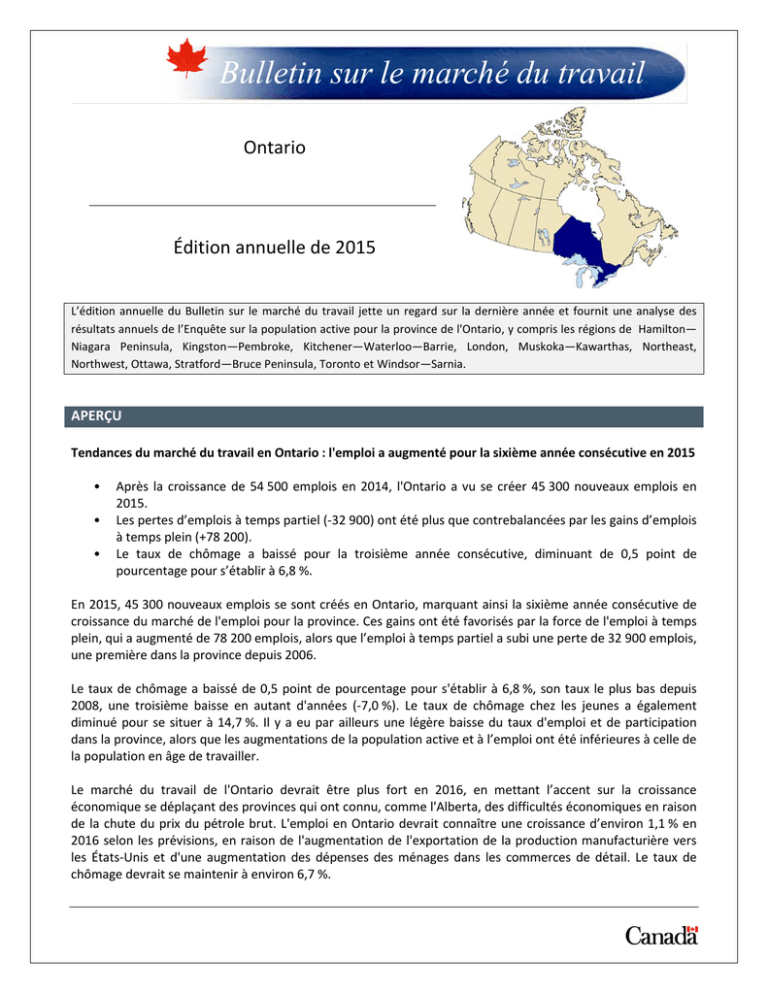 Bulletin sur le marché du travail Ontario Édition annuelle de 2015 L’édition annuelle du Bulletin sur le marché du travail jette un regard sur la dernière année et fournit une analyse des résultats annuels de l’Enquête sur la population active pour la province de l'Ontario, y compris les régions de Hamilton— Niagara Peninsula, Kingston—Pembroke, Kitchener—Waterloo—Barrie, London, Muskoka—Kawarthas, Northeast, Northwest, Ottawa, Stratford—Bruce Peninsula, Toronto et Windsor—Sarnia. APERÇU Tendances du marché du travail en Ontario : l'emploi a augmenté pour la sixième année consécutive en 2015 • • • Après la croissance de 54 500 emplois en 2014, l'Ontario a vu se créer 45 300 nouveaux emplois en 2015. Les pertes d’emplois à temps partiel (-32 900) ont été plus que contrebalancées par les gains d’emplois à temps plein (+78 200). Le taux de chômage a baissé pour la troisième année consécutive, diminuant de 0,5 point de pourcentage pour s’établir à 6,8 %. En 2015, 45 300 nouveaux emplois se sont créés en Ontario, marquant ainsi la sixième année consécutive de croissance du marché de l'emploi pour la province. Ces gains ont été favorisés par la force de l'emploi à temps plein, qui a augmenté de 78 200 emplois, alors que l’emploi à temps partiel a subi une perte de 32 900 emplois, une première dans la province depuis 2006. Le taux de chômage a baissé de 0,5 point de pourcentage pour s'établir à 6,8 %, son taux le plus bas depuis 2008, une troisième baisse en autant d'années (-7,0 %). Le taux de chômage chez les jeunes a également diminué pour se situer à 14,7 %. Il y a eu par ailleurs une légère baisse du taux d'emploi et de participation dans la province, alors que les augmentations de la population active et à l’emploi ont été inférieures à celle de la population en âge de travailler. Le marché du travail de l'Ontario devrait être plus fort en 2016, en mettant l’accent sur la croissance économique se déplaçant des provinces qui ont connu, comme l'Alberta, des difficultés économiques en raison de la chute du prix du pétrole brut. L'emploi en Ontario devrait connaître une croissance d’environ 1,1 % en 2016 selon les prévisions, en raison de l'augmentation de l'exportation de la production manufacturière vers les États-Unis et d'une augmentation des dépenses des ménages dans les commerces de détail. Le taux de chômage devrait se maintenir à environ 6,7 %. Bulletin sur le marché du travail – Ontario, édition annuelle de 2015 Page 2 Au Canada, 144 400 emplois se sont créés en 2015 (+0,8 %), mais le taux d’emploi a légèrement chuté au cours de l'année en raison de la croissance de la population de 15 ans et plus. Il y a d'autres similitudes entre le marché du travail canadien et celui de l'Ontario, avec tous les gains d’emploi à l’échelle nationale provenant du travail à temps plein (+1,3 %), alors que l’emploi à temps partiel a chuté de 1,3 %. Toutefois, le taux de chômage est demeuré stable à 6,9 % en 2015 au Canada alors que le nombre de chômeurs a augmenté, en particulier dans les provinces de l’Ouest, en raison du recul des prix du pétrole. En 2016, les prévisions entrevoient une hausse d'environ 0,6 % de l'emploi alors que le taux de chômage national devrait se maintenir à 7,1 %. En comparaison avec les modestes gains d’emploi en Ontario et au Canada, le nombre total d’emplois non agricoles s’est considérablement renforcé avec une augmentation de 2,94 millions (+2,1 %) aux États-Unis en 2015 1. Selon la Current Population Survey, le taux de chômage fédéral a fléchi à 5,3 %, son taux le plus bas depuis 2007 2. Bien que le taux de participation fédérale continue de fluctuer à un bas niveau, dans l’ensemble, l'optimisme qui règne relativement au marché du travail américain devrait se traduire par le maintien de sa vigueur en 2016 et une baisse du taux de chômage à environ 4,8 %. Données annuelles sur la population active, Ontario Données non désaisonnalisées Année 2014 à 2015 2015 2014 2013 11 385,6 11 269,3 11 142,1 Population active (000) 7 426,1 7 418,6 Emploi (000) 6 923,2 6 877,9 Temps plein (000) 5 618,2 Temps partiel (000) Nombre 2013 à 2014 % Nombre % 116,3 1,0 127,2 1,1 7 383,8 7,5 0,1 34,8 0,5 6 823,4 45,3 0,7 54,5 0,8 5 540,0 5 489,5 78,2 1,4 50,5 0,9 1 305,0 1 337,9 1 334,0 -32,9 -2,5 3,9 0,3 502,9 540,7 560,3 -37,8 -7,0 -19,6 -3,5 6,8 7,3 7,6 -0,5 - -0,3 - Taux d'activité (%) 65,2 65,8 66,3 -0,6 - -0,5 - Taux d'emploi (%) 60,8 61,0 61,2 -0,2 - -0,2 - Population 15 + (000) Chômage ('000) Taux de chômage (%) Remarque : Les totaux peuvent ne pas correspondre aux sommes indiquées en raison des arrondissements. Source: Enquête sur la population active de Statistique Canada - Tableau CANSIM 282-0002 1 U.S. Bureau of Labor Statistics. (8 janvier 2016). The Employment Situation – December 2015. U.S. Department of Labor Source :http://www.bls.gov/news.release/archives/empsit_01082016.htm 2 U.S. Bureau of Labor Statistics. (8 janvier 2016). The Employment Situation – December 2015. U.S. Department of Labor Source :http://www.bls.gov/news.release/archives/empsit_01082016.htm Bulletin sur le marché du travail – Ontario, édition annuelle de 2015 Page 3 10.0 9.0 8.0 7.0 6.0 5.0 4.0 3.0 2.0 1.0 0.0 7 000 Emploi ('000) 6 900 6 800 6 700 6 600 6 500 6 400 6 300 2010 2011 2012 2013 Emploi (000) 2014 Taux de chômage (%) Emploi et taux de chômage annuel, Ontario 2015 Taux de chômage (%) Croissance annuelle de l'emploi, Ontario 3.0% 1.5% 0.0% 2010 2011 2012 2013 2014 Ontario Canada 2015 Taux de chômage annuel selon le sexe et l'âge, Ontario Données non désaisonnalisées 2015 2014 2013 2014 to 2015 2013 to 2014 % % % Nombre Nombre Total 6,8 7,3 7,6 -0,5 -0,3 25 ans et plus 5,4 5,8 6,1 -0,4 -0,3 Hommes - 25 ans et plus 5,5 5,9 6,3 -0,4 -0,4 Femmes - 25 ans et plus 5,3 5,6 5,8 -0,3 -0,2 14,7 15,7 16,2 -1,0 -0