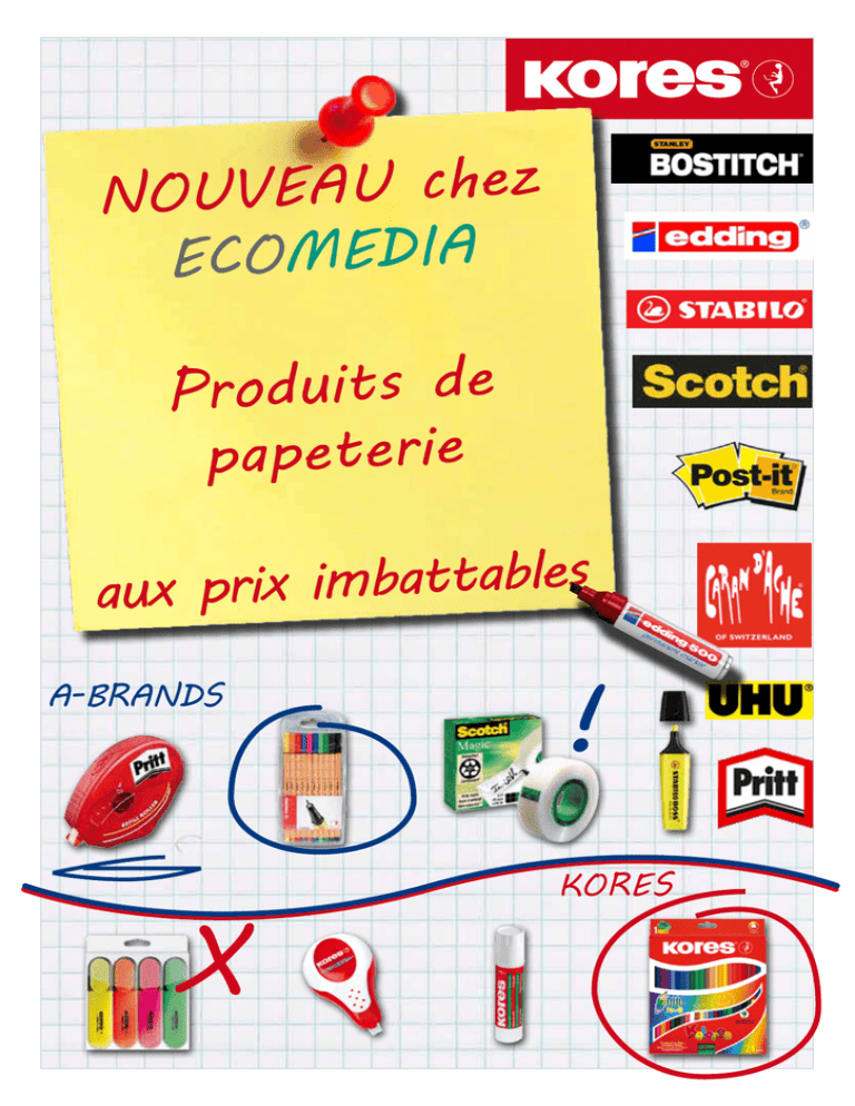 NOUVEAU chez ECOMEDIA Produits de papeterie s le b a t t a b im ix r p aux A-BRANDS X ! KORES Information Kores Kores est une entreprise présente dans le monde entier, active dans plus de 70 pays. Dans beaucoup d’entre eux, Kores est le leader dans le domaine Office Products. L’entreprise a été fondée à Vienne en 1887 et emploie aujourd’hui plus de 900 personnes. La palette de plus de 1 000 produits est très complète et couvre les catégories écriture, correction, colles et tampons. Dans bien des pays, Kores est la marque leader dans le domaine Office Products. Gamme de produits Papillon adhésif Collage Hachage Office-Bubble Corriger Gommer Crayon Crayon de couleur Stylo à bille Marque 766030 3M Description Post-it Z-Notes refill 766001 gelb Masse 76x76mm 8 8 8 9 9 10 10 10 11 11 No. d‘origine 12 pcs. R-330Y Min. de commande No. d‘article 2 Agrafes Stylo roller Marqueur Stylo - feutre Surligneur Tampon Papier carbone Adhésif anti-peluche Organiser Etiquettes 3 4 5 5 6 6 7 7 7 766032 778040 778046 Papillon adhésif 766003 3M Post-it bloc 3 pièces jaune 38x51mm 4 pcs. 653 766001 3M Post-it bloc jaune 76x76mm 12 pcs. 654 766002 3M Post-it bloc jaune 76x127mm 12 pcs. 655 766043 3M Post-it Index flèche néon assorties 4x24 pcs. 6 pcs. 684-ARR4 766040 3M Post-it Index Tabs Sign here 12 pcs. 680-31 766032 3M Post-it Index Tabs rouge 25mm 12 pcs. 680-1 766033 3M Post-it Index Tabs jaune 25mm 12 pcs. 680-5 766041 3M Post-it Index Tabs orange 25mm 12 pcs. 680-40R 766034 3M Post-it Index Tabs vert 25mm 12 pcs. 680-3 766037 Post-it Index Tabs bleu 25mm 12 pcs. 680-2 766039 3M Post-it Note jaune 51x76mm 12 pcs. 656GE 766030 3M Post-it Z-Notes refill jaune 76x76mm 12 pcs. R-330Y 778032 KORES PAGEMARKER 4x50 flls 4 couleurs 20x50mm 24 pcs. N45104 778033 KORES PAGEMARKER 5x25 flls 5 couleurs 12x45mm 24 pcs. N45105 778034 KORES PAGEMARKER 8x25 flls 7 couleurs 12x45mm 24 pcs. N45120 778035 KORES PAGEMARKER 8x15 flls 7 couleurs 12x45mm 24 pcs. N45121 778036 KORES Index-Streifen 2x25 flls jaune, rouge 45x12mm 12 pcs. 778037 KORES NOTES Index 3x10 flls 3 couleurs & règle 50x37mm 24 pcs. N45123 778038 KORES Pop-Up Index, 4x40 flls rouge et vert 45x12mm 24 pcs. N45124 778039 KORES Pop-Up Index 40/40/50 rouge, vert, jaune 45x12mm 24 pcs. N45126 778040 KORES NOTES jaune 3x100 feuilles 50x40mm 36 pcs. N46050 778041 KORES NOTES jaune 100 feuilles 50x75mm 12 pcs. N46057 778042 KORES NOTES jaune 100 feuilles 75x75mm 12 pcs. N46075 778043 KORES NOTES jaune 100 feuilles 100x75mm 12 pcs. N46100 778044 KORES NOTES jaune 100 feuilles 125x75mm 12 pcs. N46125 778045 KORES NOTES, lignées jaune 100 feuilles 100x150mm 6 pcs. N46510 778046 KORES NOTES néon-orange 80 feuilles 75x75mm 12 pcs. N47074 778047 KORES NOTES néon-rose 80 feuilles 75x75mm 12 pcs. N47075 778048 KORES NOTES néon-jaune 80 feuilles 75x75mm 12 pcs. N47076 778049 KORES NOTES néon-vert 80 feuilles 75x75mm 12 pcs. N47077 778050 KORES NOTES triées par coul. 3x100 feuilles 50x40mm 4 pcs. N47350 778051 KORES NOTES triées par coul. 100 feuilles 125x75mm 12 pcs. N47425 778052 KORES NOTES triées par coul. 100 feuilles 75x75m 12 pcs. N47475 778053 KORES NOTES transp., jaune 50 feuilles 50x75mm 18 pcs. N48186 778054 KORES PAGEMARKER 4 x 50flls 4 couleurs 40x50mm 20 pcs. N48450 778055 KORES NOTES neon 4 couleurs cube, 200 feuilles 75x75mm 6 pcs. N48475 778056 KORES NOTES Easy Cube cube, 5-couleurs 50x75mm 12 pcs. N48505 3M N45122 3 Collage 766067 4 PRITT Bâton de colle compact permanent 8.4mm 20 pcs. ZDXDH 766068 PRITT Bâton de colle compact non permanent 8.4mm 20 pcs. ZNXDH 766069 PRITT Cass. de colle Refill non permanent 8.4mm 20 pcs. ZNEDH 766071 PRITT Bâton de colle Refill permanent 8.4mm 10 pcs. 766072 PRITT Cass. de colle Refill permanent 8.4mm 20 pcs. ZDRDH ZDEDH 766065 PRITT Bâton de collle grand 40g 10 pcs. 766066 PRITT Bâton de colle petit 11g 25 pcs. PK411 766010 Bâton de colle 20g 12 pcs. PK611 766022 UHU Bâton de colle 21g 12 pcs. 65 766035 SCOTCH Magic Tape inscriptible 19mmx66m 12 pcs. 810 766038 SCOTCH Ruban adhésif Magic avec 1 rouleau 19mmx7.5m 12 pcs. 810/8-1975D 766042 SCOTCH Transparent Tape 550 19mmx66m 12 pcs. 5501966K 766073 SCOTCH Magic Tape autoadh. trans. 50mmx66m 36 pcs. 371 5066 766074 SCOTCH Magic Tape autoadh. brun 50mmx66m 36 pcs. 371 5066 766031 3M Scotch Spray Mount Colles aérosol 400ml 12 pcs. SM/400 766036 3M Scotch Spray PhotoMout Colles aérosol 400ml 12 pcs. M/400 778057 KORES Colle bricolage KORFIX blanche 1000g 1 pc. K75810 778058 KORES Colle bricolage KORFIX blanche 60g 8 pcs. K75816 778059 KORES Colle bricolage KORFIX blanche 125g 6 pcs. K75825 778060 KORES Ruban adhés. bureau PP transparent 10mx12mm 36 pcs. K50112 778061 KORES Ruban adhés. bureau PP transparent 10mx15mm 30 pcs. K50115 778062 KORES Ruban adhés. bureau PP transparent 10mx19mm 24 pcs. K50119 778063 KORES Ruban adhés. bureau PP transparent 33mx12mm 24 pcs. K50312 778064 KORES Ruban adhés. bureau PP transparent 33mx15mm 20 pcs. K50315 778065 KORES Ruban adhés. bureau PP transparent 33mx19mm 16 pcs. 778066 KORES Dévidoir ruban adhés.FISH avec 1 rouleau 10mx19mm 24 pcs. K50619 778067 KORES Dévidoir ruban adhés. 2D avec 1 rouleau 10mx19mm 24 pcs. K50629 778068 KORES Ruban adh. INVISIBLE inscripible 33mx19mm 16 pcs. K53309 778069 KORES Dévidoir ruban adh Caracol avec 1 rouleau 33mx19mm 12 pcs. K53639 PRITT 766066 766067 766035 PK811 K50319 778067 778070 KORES Dévid. rub. adh. Deskpot avec 1 rouleau 778071 KORES Ruban adhésif CRYSTAL transparent cristal 33mx19mm 778072 KORES Ruban adhésif double-face 5mx15mm 32 pcs. K55515 778073 KORES Ruban adhésif double-face 5mx30mm 22 pcs. K55530 778074 KORES GUMFIX pâte adh. détach 84 pads 25 pcs. K31600 778075 KORES GLUEDOTS pastilles trans. permanent 64 pads 12 pcs. K31602 778076 KORES GLUEDOTS pastilles trans. non-permanent 64 pads 12 pcs. K31603 778077 KORES Bâton de colle PREMIUM sans solvant 8g 24 pcs. K12081 778078 KORES Bâton de colle PREMIUM sans solvant 10g 24 pc