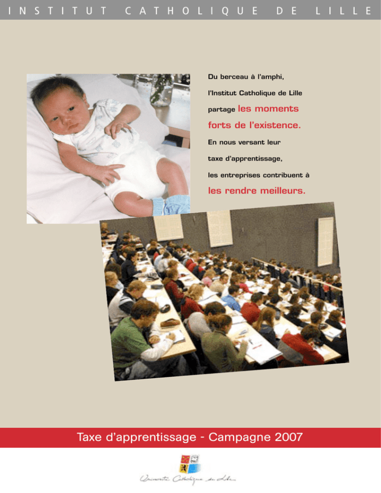I N S T I T U T C A T H O L I Q U E D E Du berceau à l’amphi, l’Institut Catholique de Lille partage les moments forts de l’existence. En nous versant leur taxe d’apprentissage, les entreprises contribuent à les rendre meilleurs. Taxe d’apprentissage - Campagne 2007 L I L L E Pour répondre aux besoins des Entreprises et des Collectivités, l’Institut Catholique de Lille propose 60 formations dans 7 établissements : Faculté Libre de Droit Faculté Libre des Lettres et Sciences Humaines Faculté Libre de Médecine Faculté Libre des Sciences et Technologies Faculté Libre des Sciences Economiques et de Gestion Faculté de Théologie Ecole de Sages-Femmes L’Institut Catholique de Lille, c’est aussi : • Un groupe hospitalier de 800 lits sur 2 sites (St Philibert à Lomme St Vincent de Paul à Lille-Moulins) disposant d’un pôle mère-enfant • Un département consacré à la formation continue : ICL-Entreprises • Un centre d’apprentissage et de perfectionnement en langues : ICL-Clarife • Un département d’éthique • Un centre de Recherche dans les domaines de la Santé, de l’Habitat et des Politiques Sociales : le CRESGE • L’Institut de Rééducation Psychothérapeutique (IRP) à Croix La taxe d’apprentissage est déterminante pour le développement et l’excellence de nos Facultés. La taxe d’apprentissage représente une part significative du financement d’un étudiant en Faculté. A l’Institut Catholique de Lille, le coût de revient moyen d’un étudiant en Faculté est de 4 000 e/an et se répartit comme suit : Participation moyenne des familles 60 % 12,5 % Taxe d’apprentissage et autres ressources 2 400 e 500 e 27,5 % Subvention de l’Etat 1 100 e En attribuant la taxe d’apprentissage de votre entreprise aux Facultés de l’Institut Catholique de Lille, vous participez à la réalisation de nos projets : • Ouverture d’un séminaire de coaching et d’intégration à la vie professionnelle • Création d’un centre de documentation scientifique • Rénovation de salles de cours et d’amphis • Ouverture de nouvelles formations (master de tourisme, préparation par apprentissage du diplôme de comptabilité et de gestion…) • Acquisition d’équipements multimédia Cette année, les montants de taxe d’apprentissage collectés ont notamment contribué à l’équipement d’une salle de rédaction dédiée au journalisme. On y trouve du matériel professionnel de prise de vue et d’enregistrement, un banc de montage audiovidéo-photo et une imprimante spéciale permettant l’impression de journaux en quadrichromie grand format. Répartition de la taxe d’apprentissage d’une entreprise Taxe brute : 0,50 % de la Masse Salariale (MS) de 2006 (Montant brut des salaires versés en 2006 figurant sur la DADS) QUOTA 52 % de la Taxe brute FNDMA CFA Fonds National de Développement et de Modernisation de l’Apprentissage Centre de Formation des Apprentis (dont CFA d’origine des apprentis présents dans l’entreprise pour un montant forfaitaire de 1 500 e) 22 % de la Taxe brute 30 % de la Taxe brute HORS QUOTA ou TAXE NETTE 48 % de la Taxe brute – Exonération pour l’accueil des stagiaires (plafonnée à 4 % de la Taxe brute) TAXE DISPONIBLE A répartir entre les établissements d’enseignement selon la catégorie d’habilitation de leur(s) formation(s) Catégorie(s) d’habilitation* A B C Taxe disponible à répartir 40 % 40 % 20 % *Catégorie A : Formations de niveau IV et V (CAP/BEP à Baccalauréat) *Catégorie B : Formations de niveau II et III (Bac + 2 à Bac + 4) *Catégorie C : Formations de niveau I (Bac + 5 et plus) 6 établissements de l’Institut Catholique de Lille sont habilités à percevoir la taxe disponible : la Faculté Libre de Droit • Catégorie d’habilitation : C • Possibilité de cumuler les catégories C et B la Faculté Libre de Médecine • Catégorie d’habilitation : C • Possibilité de cumuler les catégories C et B la Faculté Libre des Lettres et Sciences Humaines • Deux catégories d’habilitation : B et C • Possibilité de cumuler les catégories B et A ou les catégories B et C la Faculté Libre des Sciences et Technologies • Deux catégories d’habilitation : B et C • Possibilité de cumuler les catégories B et A ou les catégories B et C la Faculté Libre des Sciences Economiques et de Gestion • Deux catégories d’habilitation : B et C • Possibilité de cumuler les catégories B et A ou les catégories B et C l’Ecole de Sages-Femmes • Catégorie d’habilitation : C • Possibilité de cumuler les catégories C et B Si la taxe disponible est inférieure à 305 e, l’entreprise peut en verser l’intégralité à l’établissement de son choix. Taxe d’apprentissage - Campagne 2007 Merci de renvoyer ce formulaire à l’Institut Catholique de Lille Service Taxe d’Apprentissage - 60 boulevard Vauban - BP 109 - 59016 LILLE CEDEX fax. 03 20 13 40 95 - e-mail : [email protected] Entreprise : ....................................................................................................................................................................................................................... Adresse : ............................................................................................................................................................................................................................ Code postal : ......................................... Ville : ......................................................... Tél. : .............................................................................. Nom de la personne décidant le versement de la taxe d’apprentissage : ............................................................. Fonction : ............................................................................................... e-mail : .................................................................