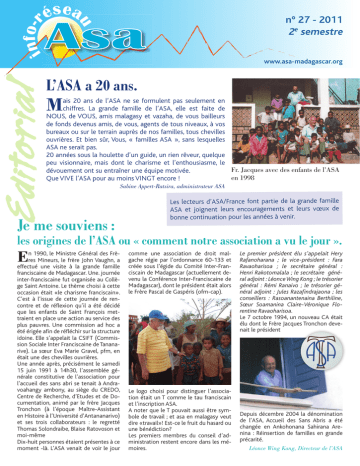 ése a u info-r Asa n° 27 - 2011 2e semestre www.asa-madagascar.org Editorial L’ASA a 20 ans. M ais 20 ans de l’ASA ne se formulent pas seulement en chiffres. La grande famille de l’ASA, elle est faite de NOUS, de VOUS, amis malagasy et vazaha, de vous bailleurs de fonds devenus amis, de vous, agents de tous niveaux, à vos bureaux ou sur le terrain auprès de nos familles, tous chevilles ouvrières. Et bien sûr, Vous, « familles ASA », sans lesquelles ASA ne serait pas. 20 années sous la houlette d’un guide, un rien rêveur, quelque peu visionnaire, mais dont le charisme et l’enthousiasme, le Fr. Jacques avec des enfants de l’ASA dévouement ont su entraîner une équipe motivée. en 1998 Que VIVE l’ASA pour au moins VINGT encore ! Sabine Appert-Ratsira, administrateur ASA Je me souviens : Les lecteurs d’ASA/France font partie de la grande famille ASA et joignent leurs encouragements et leurs vœux de bonne continuation pour les années à venir. les origines de l’ASA ou « comment notre association a vu le jour ». E n 1990, le Ministre Général des Frères Mineurs, le frère John Vaughn, a effectué une visite à la grande famille franciscaine de Madagascar. Une. journée inter-franciscaine fut organisée au Collège Saint Antoine. Le thème choisi à cette occasion était «le charisme franciscain». C’est à l’issue de cette journée de rencontre et de réflexion qu’il a été décidé que les enfants de Saint François mettraient en place une action au service des plus pauvres. Une commission ad hoc a été érigée afin de réfléchir sur la structure idoine. Elle s’appelait la CSIFT (Commission Sociale Inter Franciscaine de Tananarive). La sœur Eva Marie Gravel, pfm, en était une des chevilles ouvrières. Une année après, précisément le samedi 15 juin 1991 à 14h30, l’assemblée générale constitutive de l’association pour l’accueil des sans abri se tenait à Andravoahangy ambony, au siège du CREDO, Centre de Recherche, d’Etudes et de Documentation, animé par le frère Jacques Tronchon (à l’époque Maître-Assistant en Histoire à l’Université d’Antananarivo) et ses trois collaborateurs : le regretté Thomas Solondraibe, Blaise Ratovoson et moi-même Dix-huit personnes étaient présentes à ce moment -là. L’ASA venait de voir le jour comme une association de droit malgache régie par l’ordonnance 60-133 et créée sous l’égide du Comité Inter-Franciscain de Madagascar (actuellement devenu la Conférence Inter-Franciscaine de Madagascar), dont le président était alors le Frère Pascal de Gaspéris (ofm-cap). Le logo choisi pour distinguer l’association était un T comme le tau franciscain et l’inscription ASA. A noter que le T pouvait aussi être symbole de travail ; et asa en malagasy veut dire «travail»! Est-ce le fruit du hasard ou une bénédiction? Les premiers membres du conseil d’administration restent encore dans les mémoires. Le premier président élu s’appelait Hery Rafanoharana ; le vice-président : Fara Ravaoharisoa ; le secrétaire général : Henri Rakotomalala ; le secrétaire général adjoint : Léonce Wing Kong ; le trésorier général : Rémi Ranaivo ; le trésorier général adjoint : Jules Razafindrajaona ; les conseillers : Rasoanantenaina Berthiline, Sœur Soamanina Claire-Véronique Florentine Ravaoharisoa. Le 7 octobre 1994, un nouveau CA était élu dont le Frère Jacques Tronchon devenait le président Depuis décembre 2004 la dénomination de l’ASA, Accueil des Sans Abris a été changée en Ankohonana Sahirana Arenina : Réinsertion de familles en grande précarité. Léonce Wing Kong, Directeur de l’ASA Installation de la 15e promotion L e lundi 3 octobre, 19 familles (132 personnes) arrivent épuisées, après le très long voyage, dû à une crevaison d’un pneu du car qui les amenait du Casa2 à leur nouveau village :Antsarahasina. Les villageois de la 14e promotion installés depuis un an à Antsahamivoatra distant de qqes Km étaient venus à pied, spontanément, pour les accueillir. Rires, embrassades, chants,Tonga soa (Bienvenue), ils sont heureux de se retrouver sur ces terres lointaines, après un an de séparation. Puis, c’est le déballage du gros camion qui les accompagne : le mobilier qu’ils ont fabriqué, les angady, des caisses-clapiers avec les lapins et aussi poules et canards. Quand tout est sorti du camion, on procède à l’attribution des maisons par tirage au sort. Chaque famille tire d’un chapeau le N° de la maison où il va s’installer. En présence du Chef de site et du personnel d’encadrement d’Ampasipotsy, Madame Jeanne Ratsirahonana du CA de l’ASA et nous-même : Maryse, Claude et Berna- L’attribution de la maison dette remettons à chacun le contrat d’occupation de la maison et le cadenas qui la ferme. Nous représentons ASA/France qui, avec l’aide d’un mécénat, a pu financer cette année la construction de ces maisons. C’est avec beaucoup d’émotion partagée que chacun s’installe et transporte le matériel apporté. La nuit arrive et nous devons repartir à Ampasiposy. 48 h plus tard, nous avons la chance de pouvoir revenir faire un tour à ce nouveau village. Quel changement. L’un des chefs de famille bat le rappel à notre arrivée. Les femmes sont fières de nous faire entrer chez elles, déjà des rideaux pendent aux fenêtres, l’installation se poursuit. Certains villageois ont déjà commencé à aménager les abords de la maison, préparé autour un petit jardinet, ou garni de pierres le devant de la porte, pour éviter la boue. Des abris en briques protègent la marmite où cuisent les brèdes cueillies alentour ; à proximité de petits tas de bois mort pour alimenter le feu. Des gar- Devant la maison Le car çons jouent au ballon, Dans cette steppe d’herbes sèches, les filles ont pu cependant ramasser quelques brassées d’herbes vertes pour leurs lapins, deux canards barbotent dans un