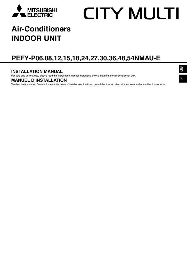 Air-Conditioners INDOOR UNIT INSTALLATION MANUAL GB PEFY-P06,08,12,15,18,24,27,30,36,48,54NMAU-E MANUEL D’INSTALLATION Veuillez lire le manuel d’installation en entier avant d’installer ce climatiseur pour éviter tout accident et vous assurer d’une utilisation correcte. F For safe and correct use, please read this installation manual thoroughly before installing the air-conditioner unit. 3 3.2 [Fig. 3.2.1] (Unit: mm [in]) 50~150[2~5-15/16] 450[17-3/4] C B A C 450[17-3/4] 4 23 [15/16] A 625[24-5/8] B 49[1-15/16] D 100[3-15/16] 20[13/16] D 2 1 C 250[9-7/8] 3 F A Access door B Electrical parts box 1 600 mm [23-5/8 in] or more C Air inlet 2 100 mm [3-15/16 in] or more D Air outlet 3 20 mm [13/16 in] or more E Ceiling surface 4 300 mm [11-13/16 in] or more F Service space (viewed from the side) G Service space (viewed from the direction of arrow) Model PEFY-P06,08,12NMAU-E E A PEFY-P15,18NMAU-E E 777[30-5/8] PEFY-P24,27,30NMAU-E G PEFY-P36,48NMAU-E PEFY-P54NMAU-E 4 A 700 [27-9/16] 900 [35-7/16] 1100 [43-5/16] 1400 [55-1/8] 1600 [63] B 754 [29-11/16] 954 [37-9/16] 1154 [45-7/16] 1454 [57-1/4] 1654 [65-1/8] C 800 [31-1/2] 1000 [39-3/8] 1200 [47-1/4] 1500 [59-1/16] 1700 [66-15/16] (Unit: mm [in]) D E 660 800 [25-31/32] [31-1/2] 860 1000 [33-27/32] [39-3/8] 1060 1200 [41-23/32] [47-1/4] 1360 1500 [53-17/32] [59-1/16] 1560 1700 [61-13/32] [66-15/16] 4.1 [Fig. 4.1.1] L Z W X 5 Y A A Center of gravity 5.1 [Fig. 5.1.1] 5.2 C [Fig. 5.1.2] [Fig. 5.2.1] D A A D C B E C Nuts (field supply) A Unit body D Washers (field supply) B Lifting machine E M10 hanging bolt (field supply) 6 A Indoor unit’s bottom surface 6.2 33[1-5/16] 41[1-5/8] 122[4-13/16] A 137[5-7/16] 67 [2-5/8] 239[9-7/16] 357[14-1/16] 2 D 217[8-9/16] (Unit: mm [in]) C B [Fig. 6.2.1] A Refrigerant pipe (liquid pipe) B Refrigerant pipe (gas pipe) C Drain pipe (O.D. ø32 mm [1-1/4 in]) D Drain pipe (O.D. ø32 mm [1-1/4 in], spontaneous draining) 7 7.1 [Fig. 7.1.1] [Fig. 7.1.3] A C B A A Cut here B Remove brazed cap [Fig. 7.1.2] D E A A Cool by a wet cloth F A Thermal insulation B Pull out insulation C Wrap with damp cloth D Return to original position E Ensure that there is no gap here F Wrap with insulating tape 7.2 [Fig. 7.2.1] Max. 20m [65ft] 1.5-2m[5-7ft] C Max. 300mm[11-13/16 in] Correct piping Wrong piping N B A B J F K L O A Insulation (9 mm [3/8 in] or more) B Downward slope (1/100 or more) C Support metal K Air bleeder L Raised M Odor trap Grouped piping B D M D E D F F F G D O. D. ø32 [1-1/4 in] PVC TUBE E Make it as large as possible. About 10 cm [3-15/16 in]. F Indoor unit G Make the piping size large for grouped piping. H Downward slope (1/100 or more) I O. D. ø38 [1-1/2 in] PVC TUBE for grouped piping. (9 mm [3/8 in] or more insulation) I H J Up to 550 mm [21-11/16 in] N Drain hose (accessory) O Horizontal or slightly upgradient [Fig. 7.2.2] (Unit: mm [in]) F E A B 35 32 [1-13/32] [1-1/4] C D 25 [1] D H G A Indoor unit B Tie band (accessory) C Visible part D Insertion margin E Drain hose (accessory) F Drain pipe (O.D. ø32 mm [1-1/4 in] PVC TUBE, field supply) G Insulating material (field supply) H Tie band (accessory) 3 7.3 [Fig. 7.3.1] SWE [Fig. 7.3.2] A B E C D F A Insert pump's end 2 to 4 cm [13/16 to 1-5/8 in]. B Remove the water supply port. C About 2500 cc D Water E Filling port F Screw <Indoor controller board> 8 [Fig. 8.0.2] [Fig. 8.0.1] <A> In case of rear inlet D A A C E F B G A Duct B Air inlet C Access door D Canvas duct E Ceiling surface F Air outlet G Leave distance A enough to prevent short cycle B <B> In case of bottom inlet D A Filter B Bottom plate C [Fig. 8.0.4] A A E C F B G [Fig. 8.0.3] D 9 9.1 9.2 [Fig. 9.1.1] [Fig. 9.2.1] A B M1M2 TB3 A D B C C C M1M2 S TB5 M1M2 S TB15 TB5 1 2 TB15 E C C C C A Switch 16 A B Overcurrent protection 16 A C Indoor unit D Total operating current be less than 16 A E Pull box C [Fig. 9.2.2] A B M1M2 TB3 C A M1M2 S TB5 M1M2 S TB5 C 4 A 1 2 C A Terminal block for indoor transmission cable B Terminal block for outdoor transmission cable C Remote controller 9.2 B [Fig. 9.2.4] [Fig. 9.2.3] B 2 D 2 D 1 A S 1 M2 S M2 M1 A M1 DC10~13V GR C GR L2 A 1 L1 B 2 L1 DC24~30V L2 C A Non-polarized B TB15 C Remote Controller D TB5 1 2 (A, B) 9.3 B [Fig. 9.3.1] [Fig. 9.3.2] D A A Screw holding cover (1pc) B Cover C E L [Fig. 9.3.3] K N [Fig. 9.3.4] J C Terminal box D Knockout hole E Remove P O J G M F I H F Use PG bushing to keep the weight of the cable and external force from being applied to the power supply terminal connector. Use a cable tie to secure the cable. G Power source wiring K Side frame H Use ordinary bushing L Knockout hole (for power source wiring) I Transmission wiring M Washer (accessory) J Conduit N Terminal block for power source O Terminal block for indoor transmission P Terminal block for remote controller [Fig. 9.3.5] M1 M2 A S B D E A Terminal block B Round terminal C Shield wire D The earth wire from two cables are connected together to the S terminal. (Dead-end connection) E Insulation tape (To keep the earth wire of the shielded cable from coming in contact with the transmission terminal) C 9.5 [Fig. 9.5.1] SWC SW11 SW5 SW12 SW14 SWA <Indoor controller board> 5 GB Contents 1. Safety precautions ...................................................................................... 1.1. Before installation and electric work .......................................... 1.2. Precautions for devices that use R410A refrigerant .................. 1.3. Before getting installed .............................................................. 1.4. Before getting installed (moved) - electrical work ...................... 1.5. Before starting the test run ........................................................ 2. Indoor unit accessories ............................................................................... 3. Selecting an installation site ....................................................................... 3.1. Install the indoor unit on a ceiling strong enough to