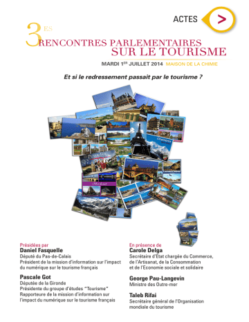 3 ACTES ES > RENCONTRES PARLEMENTAIRES SUR LE TOURISME MARDI 1ER JUILLET 2014 MAISON DE LA CHIMIE Et si le redressement passait par le tourisme ? Présidées par En présence de Député du Pas-de-Calais Président de la mission d’information sur l’impact du numérique sur le tourisme français Secrétaire d’Etat chargée du Commerce, de l’Artisanat, de la Consommation et de l’Economie sociale et solidaire Daniel Fasquelle Pascale Got Députée de la Gironde Présidente du groupe d’études “Tourisme” Rapporteure de la mission d’information sur l’impact du numérique sur le tourisme français Carole Delga George Pau-Langevin Ministre des Outre-mer Taleb Rifai Secrétaire général de l’Organisation mondiale du tourisme Remerciements Daniel Fasquelle et Pascale Got remercient Carole Delga, secrétaire d’État chargée du Commerce, de l’Artisanat, de la Consommation et de l’Économie sociale et solidaire et George Pau-Langevin, ministre des Outre-mer pour nous avoir fait l’honneur de leur présence lors de ces Rencontres, Taleb Rifai, secrétaire général de l’Organisation mondiale du tourisme pour l’ouverture cette matinée, Sophie Jovillard, journaliste, présentatrice d’Échappées belles sur France 5 pour son édito optimiste, Franck Ferrand, historien, présentateur de Au coeur de l’histoire sur Europe 1 et L’ombre d’un doute sur France 3 pour son allocution lors du déjeuner, Philippe Lefebvre, journaliste sur France Inter pour avoir animé les débats, leurs collègues, Luc Carvounas, sénateur du Val-de-Marne, Jean-Michel Couve, député du Var, Sophie Dion, députée de la Haute-Savoie, Édith Gueugneau, députée de Saône-et-Loire, Jean-Jacques Lasserre, sénateur des Pyrénées-Atlantiques et Monique Rabin, députée de la Loire-Atlantique, ainsi que l’ensemble des intervenants qui, par leur expertise et leur contribution aux débats, ont concouru au succès de cette manifestation. Ces Rencontres ont également été rendues possibles grâce au soutien et à l’implication de leurs partenaires : Aéroports de la Côte d’Azur Belambra Clubs Les clubs Vacanciel Fédération unie des Auberges de jeunesse (FUAJ) Alliance du Commerce - UCV Sommaire Ouverture des Rencontres 1 Taleb Rifai Secrétaire général de l’Organisation mondiale du tourisme SESSION II Défis et conditions de succès 21 Avoir une vraie démarche d’entreprise Éric Sauvage, partner d’AT Kearney, rapporteur du groupe de travail sur le Tourisme de l’Institut Montaigne 23 Une entreprise digitale au service des marques et du marketing territorial Martine Granier, présidente de vente-privee-voyage.com 24 Pourquoi la France est-elle attractive pour les étrangers (et pour les Français) ? Jean-Daniel Lévy*, directeur du département politique et opinion d’Harris Interactive 25 La fiscalité au service du développement des territoires Monique Rabin, députée de la Loire-Atlantique, co-rapporteure de la mission d’évaluation et de contrôle sur la fiscalité locale des hébergements touristiques 26 Soigner l’image de la France Daniel Fasquelle, député du Pas-de-Calais, président de la mission d’information sur l’impact du numérique sur le tourisme français, maire du Touquet-Paris-Plage 27 Formation : revenir aux fondamentaux Lionel Walker, vice-président national de l’Institut français du tourisme (IFT), président du pôle d’excellence IFT Paris-Est, vice-président du conseil général de Seine-et-Marne 28 Le tourisme social comme outil de développement des territoires Claudie Buisson, contrôleur économique et financier, auteur du rapport "Lutter contre la fracture touristique", rapporteur du groupe de travail "Redynamiser les vacances des Français" des Assises du tourisme Allocution 4 Carole Delga Secrétaire d’État chargée du Commerce, de l’Artisanat, de la Consommation et de l’Économie sociale et solidaire SESSION I Une industrie d’avenir pour la France 10 11 12 14 Introduction Pascale Got, députée de la Gironde, présidente du groupe d’études "Tourisme", rapporteure de la mission d’information sur l’impact du numérique sur le tourisme français Le potentiel touristique de la destination France Olivier Colcombet*, président du directoire de Belambra Clubs L’attractivité du territoire, comment repenser la gouvernance du tourisme en France ? Joël Giraud, député des Hautes-Alpes, co-pilote du groupe de travail "Fédérer et dynamiser les pouvoirs publics en faveur du tourisme" des Assises du tourisme Le grand projet de construction d’un groupe de tourisme dédié à la destination France Jean-Claude Nérisson, président de Vacanciel 16 Les innovations touristiques (au-delà du numérique) Christian Mantei, directeur général d’Atout France 18 DÉBATS * Synthèse des propos non validée par son auteur (intervention liminaire et échanges avec la salle) Sommaire ÉDITO OPTIMISTE 29 Le développement durable et le numérique, facteurs clés de l’attractivité des auberges de jeunesse et des territoires Édith Arnoult-Brill, secrétaire générale de la Fédération unie des auberges de jeunesse (FUAJ), présidente d’Hostelling international 44 Le tourisme évènementiel comme facteur d’attractivité des territoires Luc Carvounas, sénateur du Val-de-Marne, co-président du groupe "s’adapter aux mutations du secteur" des Assises du tourisme, co-auteur du rapport d’information "Tourisme : une place de leader à reconquérir" 46 Le tourisme « doux » et les stations thermales, leviers d’attractivité du territoire Édith Gueugneau, députée de Saône-et-Loire Sophie Jovillard* Journaliste, présentatrice d’Échappées Belles sur France 5 SESSION III Le tourisme au service des territoires 32 Le transport aérien comme soutien au développement des territoires Dominique Thillaud, président du directoire des Aéroports de la Côte d’Azur, vice-président de l’Union des aéroports français 