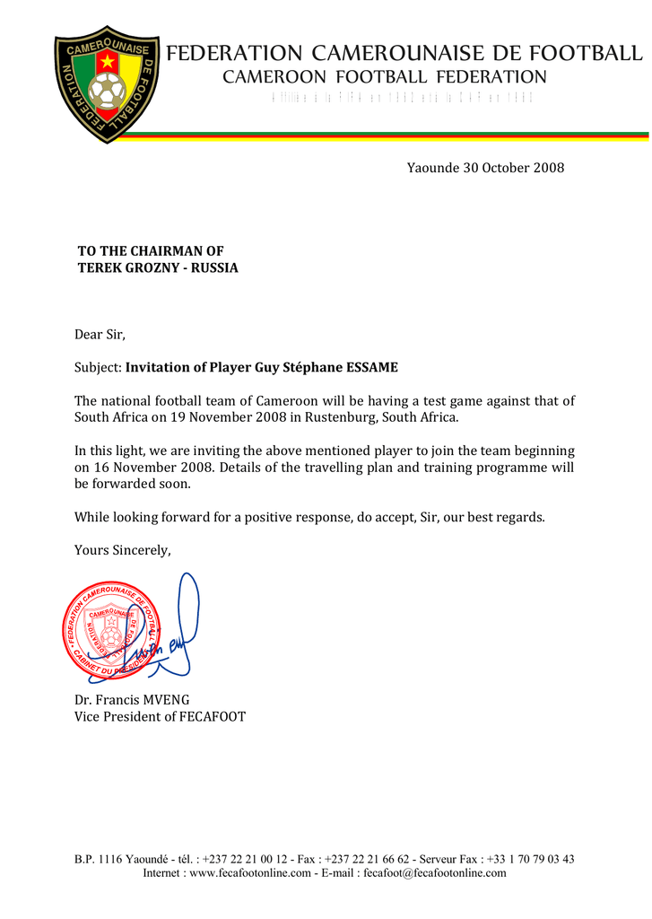 FEDERATION CAMEROUNAISE DE FOOTBALL CAMEROON FOOTBALL FEDERATION A f f ilié e à la F I F A e n 1 9 6 2 e t à la C A F e n 1 9 6 3 Yaounde 30 October 2008 TO THE CHAIRMAN OF TEREK GROZNY - RUSSIA Dear Sir, Subject: Invitation of Player Guy Stéphane ESSAME The national football team of Cameroon will be having a test game against that of South Africa on 19 November 2008 in Rustenburg, South Africa. In this light, we are inviting the above mentioned player to join the team beginning on 16 November 2008. Details of the travelling plan and training programme will be forwarded soon. While looking forward for a positive response, do accept, Sir, our best regards. Yours Sincerely, Dr. Francis MVENG Vice President of FECAFOOT B.P. 1116 Yaoundé - tél. : +237 22 21 00 12 - Fax : +237 22 21 66 62 - Serveur Fax : +33 1 70 79 03 43 Internet : www.fecafootonline.com - E-mail : [email protected]