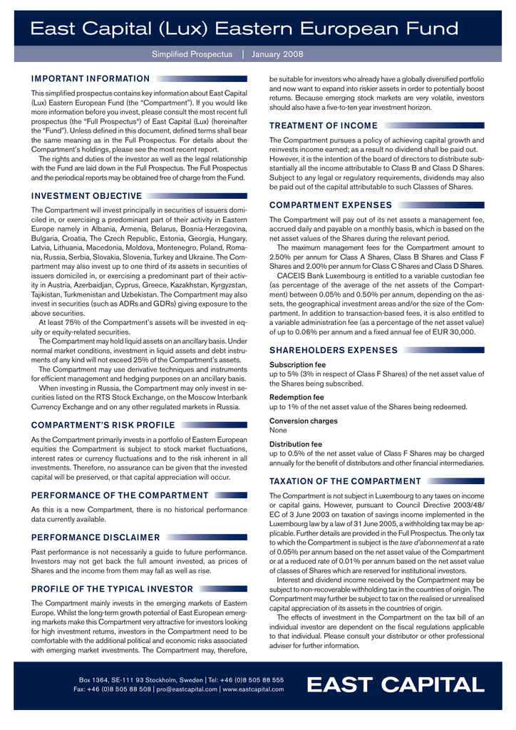 East Capital (Lux) Eastern European Fund Simplified Prospectus | January 2008 IMPORTANT INFORMATION This simplified prospectus contains key information about East Capital (Lux) Eastern European Fund (the “Compartment”). If you would like more information before you invest, please consult the most recent full prospectus (the “Full Prospectus“) of East Capital (Lux) (hereinafter the “Fund”). Unless defined in this document, defined terms shall bear the same meaning as in the Full Prospectus. For details about the Compartment’s holdings, please see the most recent report. The rights and duties of the investor as well as the legal relationship with the Fund are laid down in the Full Prospectus. The Full Prospectus and the periodical reports may be obtained free of charge from the Fund. be suitable for investors who already have a globally diversified portfolio and now want to expand into riskier assets in order to potentially boost returns. Because emerging stock markets are very volatile, investors should also have a five-to-ten year investment horizon. TREATMENT OF INCOME The Compartment pursues a policy of achieving capital growth and reinvests income earned; as a result no dividend shall be paid out. However, it is the intention of the board of directors to distribute substantially all the income attributable to Class B and Class D Shares. Subject to any legal or regulatory requirements, dividends may also be paid out of the capital attributable to such Classes of Shares. INVESTMENT OBJECTIVE The Compartment will invest principally in securities of issuers domiciled in, or exercising a predominant part of their activity in Eastern Europe namely in Albania, Armenia, Belarus, Bosnia-Herzegovina, Bulgaria, Croatia, The Czech Republic, Estonia, Georgia, Hungary, Latvia, Lithuania, Macedonia, Moldova, Montenegro, Poland, Romania, Russia, Serbia, Slovakia, Slovenia, Turkey and Ukraine. The Compartment may also invest up to one third of its assets in securities of issuers domiciled in, or exercising a predominant part of their activity in Austria, Azerbaidjan, Cyprus, Greece, Kazakhstan, Kyrgyzstan, Tajikistan, Turkmenistan and Uzbekistan. The Compartment may also invest in securities (such as ADRs and GDRs) giving exposure to the above securities. At least 75% of the Compartment’s assets will be invested in equity or equity-related securities. The Compartment may hold liquid assets on an ancillary basis. Under normal market conditions, investment in liquid assets and debt instruments of any kind will not exceed 25% of the Compartment’s assets. The Compartment may use derivative techniques and instruments for efficient management and hedging purposes on an ancillary basis. When investing in Russia, the Compartment may only invest in securities listed on the RTS Stock Exchange, on the Moscow Interbank Currency Exchange and on any other regulated markets in Russia. COMPARTMENT’S RISK PROFILE As the Compartment primarily invests in a portfolio of Eastern European equities the Compartment is subject to stock market fluctuations, interest rates or currency fluctuations and to the risk inherent in all investments. Therefore, no assurance can be given that the invested capital will be preserved, or that capital appreciation will occur. PERFORMANCE OF THE COMPARTMENT As this is a new Compartment, there is no historical performance data currently available. PERFORMANCE DISCLAIMER Past performance is not necessarily a guide to future performance. Investors may not get back the full amount invested, as prices of Shares and the income from them may fall as well as rise. PROFILE OF THE TYPICAL INVESTOR The Compartment mainly invests in the emerging markets of Eastern Europe. Whilst the long-term growth potential of East European emerging markets make this Compartment very attractive for investors looking for high investment returns, investors in the Compartment need to be comfortable with the additional political and economic risks associated with emerging market investments. The Compartment may, therefore, COMPARTMENT EXPENSES The Compartment will pay out of its net assets a management fee, accrued daily and payable on a monthly basis, which is based on the net asset values of the Shares during the relevant period. The maximum management fees for the Compartment amount to 2.50% per annum for Class A Shares, Class B Shares and Class F Shares and 2.00% per annum for Class C Shares and Class D Shares. CACEIS Bank Luxembourg is entitled to a variable custodian fee (as percentage of the average of the net assets of the Compartment) between 0.05% and 0.50% per annum, depending on the assets, the geographical investment areas and/or the size of the Compartment. In addition to transaction-based fees, it is also entitled to a variable administration fee (as a percentage of the net asset value) of up to 0.06% per annum and a fixed annual fee of EUR 30,000. SHAREHOLDERS EXPENSES Subscription fee up to 5% (3% in respect of Class F Shares) of the net asset value of the Shares being subscribed. Redemption fee up to 1% of the net asset value of the Shares being redeemed. Conversion charges None Distribution fee up to 0.5% of the net asset value of Class F Shares may be charged annually for the benefit of distributors and other financial intermediaries. TAXATION OF THE COMPARTMENT The Compartment is not subject in Luxembourg to any taxes on income or capital gains. However, pursuant to Council Directive 2003/48/ EC of 3 June 2003 on taxation of savings income implemented in the Luxembourg law by a law of 31 June 2005, a withholding tax may be applicable. Further details are provided in the Full Prospectus. The only tax to which the Compartment is subject is the taxe d’abonnement at a rate of 0.05% per annum based on the net asset value of the Compartment or at a reduced rate of 0.01% per annum based on the net asset value of classes of Shares which are reserved for institutional investors. Interest a