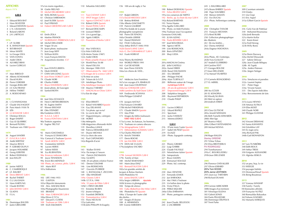 AFFICHES depuis 1974 4,00 € 1975 1 Edouard BOUBAT 2 Hans SILVESTER 3 Edward WESTON Epuisée 4 J. N. UELSMANN 5 Roland LABOYE 6 J.H. LARTIGUE 1976 7 J.P. SUDRE 8 K. SHINOYAMA Epuisée 9 Bill BRANDT 10 Minor WHITE 11 Le Groupe VIVA 12 VON CONTA 13 André CROS 14 ALVAREZ BRAV 16 Lucien CLERGUE 1977 17 Marc RIBOUD 18 Alberto SCHOMMER 19 David HURN 20 Pierre CORDIER 22 Georges RAILLART 23 J-C GAUTRAND 24 Hélène THERET 25 A. RODCHENKO 1978 26 I. CUNNINGHAM 27 Claude SAUVAGEOT 28 Paris Match 1938-78 29 IZIS 30 J-J ACHACHE 5,00 € 31 Christian SOULA 32 Roger DASPET 33 Guy LE QUERREC 34 Bernard PLOSSU 35 Toulouse vers 1900 Epuisée 1979 36 August SANDER 37 O.N.E.R.A 5,00 € 38 André KERTESZ 39 Maurice ROUX 40 P. GERARD DUPUY 41 Jacques HOLMIERE 42 Georg GERSTER 43 Robert DOISNEAU 44 Jean RAUZY 1980 45 Janine NIEPCE 46 C. CAMBEROQUE 47 J.F. BAURET 48 Denis BRIHAT 5,00 € 49 Rachel THERET 50 C-J. LAUGHLIN 51 Hans HARTUNG 52 Claude BATHO 53 John BATHO 5,00 € 54 GLADYS 55 F.S.A. 1981 56 Dominique BAUDIS 57 Justin GREGOIRE 57a Les mains regardent... 58 Gisèle FREUND 59 Michel DELABORDE 5,00 € 60 Willy RONIS Epuisée 61 Christian SARRAMON 62 Josef SUDEK Epuisée 63 Paul STRAND 64 Hubert GROOTECLAES 5,00 € 1982 65 Emile ZOLA 66 Martine FRANCK 67 NURIDSANY /PERRENOU5,00 € 68 Michel DIEUZAIDE 69 Vogue 50 ans 70 Jeune photo. toulousaine 71 Jean Loup SIEFF 72 William KLEIN 73 Louis François BACOU 74 Acquisitions récentes C57 1983 75 Joan FONTCUBERTA 76 Eikoh HOSOE 77 CHIN SAN LONG Epuisée 78 Jean Pierre VORLET 5,00 € 79 Claude NORI 80 Charles FABRE 81 Bruce DAVIDSON 5,00 € 82 Jeune photo. de Gascogne 83 Sanford ROTH 1984 84 José Ortiz ECHAGÜE 85 Henri CARTIER-BRESSON 86 W. Eugène SMITH 87 Werner BISCHOF 88 Otto STEINERT 88a Fondation LEICA 89 N.A.S.A. 5,00 € 90 Franco FONTANA 5,00 € 90a Trottoirs argentins 91 Eugène TRUTAT 1985 92 Mario GIACOMELLI 93 François LE DIASCORN 93a Carnaval à Toulouse Epuisée 94 Sarah MOON 5,00 € 95 Constantine MANOS 96 Lucien HERVE 97 Sabine WEISS 98 Eva RUBINSTEIN 98a Errances indiennes 5,00 € 99 Joyce TENNESON 99a Erwin BLUMENFELD 100 Photo, art, science, philo. 5,00 € 101 Marie BOT 101a Sidérations 1986 102 LIFE 1946-1955 103 GASTON 103a Objectifs Monuments 104 Alex. MACIJAUSKAS 104a Photographie lituanienne 105 BRASSAÏ 106 Marc GARANGER 5,00 € 106a Elèves E.T.P.A. 107 Edward S. CURTIS 108 Toulouse en 1986 5,00 € 109 Erich SALOMON 110 Sebastião SALGADO 156 100 ans de rugby à Tse 1987 111 Toni CATANY 5,00 € 112 SPOT Images 5,00 € 113 Agence CONTACT 5,00 € 114 Robert CAPA Epuisée 115 Daniel PONS 5,00 € 117 Bernard DESCAMPS 118 Leonard FREED 119 Un si grand âge... 120 Agnès VARDA 121 Poussières d’étoiles 5,00 € 1991 157 Ralph GIBSON 157a David HISCOCK 5,00 € 158 Bettina RHEIMS 158a Alberto GIACOMETTI 159 Patrick GALIBERT 159a Prix Kodak de la jeune photographie européenne 160 Pierre DE FENOYL 160a Christèle LERISSE 161 Daniel FRASNAY 162 FNAC Collections 162a Arthur BATUT 1846-1918 162b Daniel LAINE 5,00 € 162c G. De CLERAMBAULT 5,00 € 163 Frank HORVAT 1988 122 Max VADUKUL 122a Nitin VADUKUL 122b Moins Trente (1987) 122c André CROS 123 Photo actuelle (France) 5,00 € 124 World Press 56-88 125 Manel ESLUSA 126 Mexique 1900-1935 127 Observatoire Pic Midi 5,00 € 127a Images de la science 5,00 € 127b Mise en scène 128 Trésors de la S.F.P. 129 Artothèque Photo 129a Artothèque Estampes 5,00 € 130 Maurice TABARD 131 MAGNUM en Chine 5,00 € 131a Etat de siège 1989 132 Elliot ERWITT 133 Rafael NAVARRO Epuisée 134 Guy DELAHAYE 135 Toi photo. qui es-tu? 136 Le cercle des XII 137 Daguerréotypes, calotypes 138 HORST 138a Métropolis 138b Magazines allemands 46/84 139 Dorothea LANGE 140 Patricia DESMARQUEST 141 Duane MICHALS 141a La choix des sens 142 Paul CAPONIGRO 142a Regards d’acier 1990 143 Walker EVANS 143a Du temps à l’œuvre 144 Patrick ZACHMANN 144a GLADYS 144b 20 ans photo créative France 145 Denise COLOMB 146 Line ROSSIGNOL 147 Graciela ITURBIDE 148 L. BATAGLIA& F. ZECCHIN 149 Elke HINDEMIT 149a Gitanes 5,00 € 149b E.T.P.A. 1990 149c 55 jours de Pékin 5,00 € 149d I. FRITZ GRUBER 151 Ernestine RUBEN 152 Jeunes tchèques 153 František DRTIKOL 154 Transantarctica 5,00 € 155 Floris NEÜSUSS 155a Latécoère 155b John PHILLIPS St-Exupéry 163a Thierry BLANDINO 164 WORLD PRESS 1991 165 Carl DE KEYSER 166 Jean Pierre GILSON 166a Les chiens de 1850... 1992 167 Médecins Sans Frontières 167a Les voyages d’A. RIMBAUD 168 Jean Louis COURTINAT 168a Luc CHOQUER 5,00 € 168b Lumières du Sud-Ouest 5,00 € 169 Ferdinando SCIANNA 169a Philippe CLEMENT 170 Jacques MATALY 170a François CANARD 170b Michel PARADINAS 171 Claude SIMON Epuisée 172 Max PAM 173 Images du Métro toulousain 1990-1992 5,00 € 173a La mer, les bateaux, les hommes... 174 Toulouse en camera obscura 174a Aérographisme 5,00 € 175 Déforestation (GAMMA) 5,00 € 175a Charles PEIGNOT 176 Keiichi TAHARA 177 Denis ROCHE 178 Jan SAUDEK 5,00 € 179 DON MC CULLIN 179a Joséphine SACABO 1993 179b Lennart NILSSON 5,00 € 179c Family of Man 180 Michel SEMENIAKO 181 Marie Jésus DIAZ 182 Bernard FAUCON 5,00 € 182a Les grandes amitiés de Jacques & Raïssa Maritain 182b Photofolies 93 183 James BALOG 5,00 € 183a Sergio LARRAIN épuisée 183b Science & photographie 184 Temps de silence 185 Cuba (RobertVan Der Hilst) 5,00 € 186 Photofolies 93 Epuisée 186a L’Europe de l’autre côté des étoiles... 187 Images d’Ukraine 188 A. MINKKINEN 189 Connie IMBODEN 1994 190 Robert DOISNEAU Epuisée 191 Felice BEATO 5,00 € 191a Les conserves de NIEPCE 192 Berlin, ap. la chute du mur 5,00 € 192a Roland BARTHES 193 Terres Hautes 193a Agathe GAILLARD 194 Photo. en Midi-Pyrénées 194a Toulouse sous l’occupation Germaine CHAUMEL 195 JUAN-I-JONG 196 Paolo ROVERSI 5,00 € 197 Josef KOUDELKA 198 Agence METIS 199 Line ROSSIGNOL 200 Boris LIPNITZKY 201 Shoji UEDA 1995 201a MAGNUM Cinéma 202 Jellel GASTELLI 202a Kamel DRIDI 202b Ra