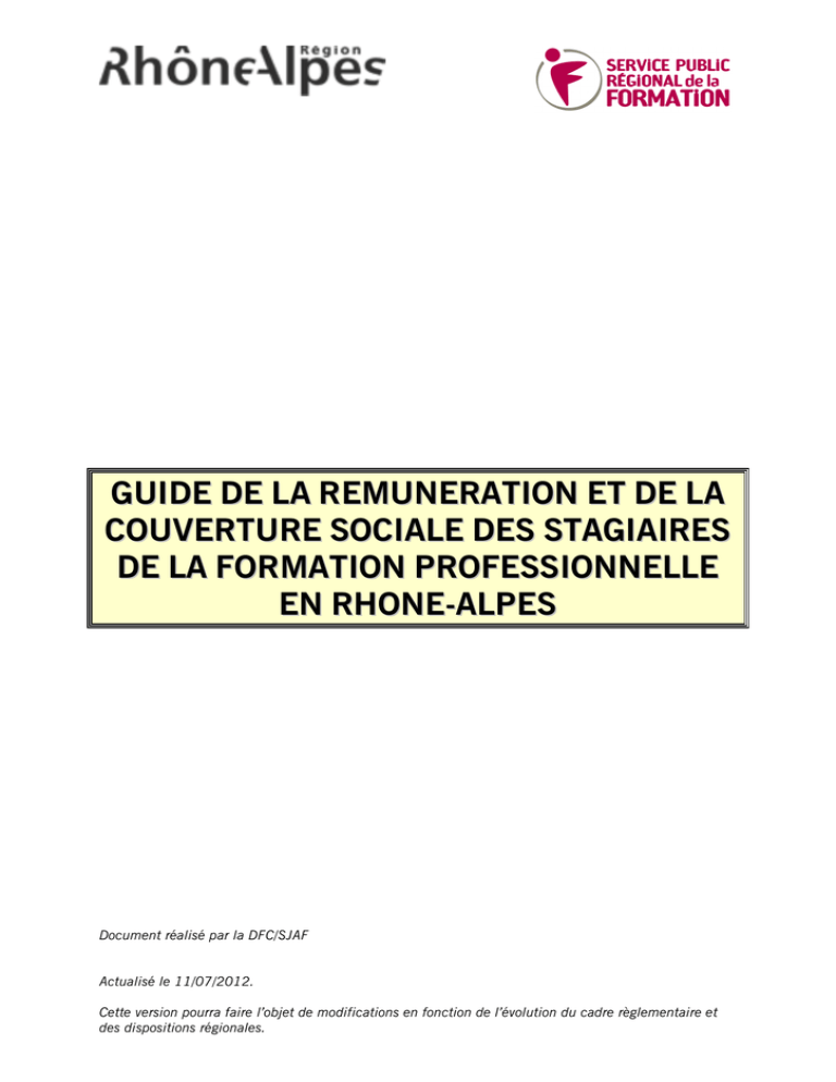 GUIDE DE LA REMUNERATION ET DE LA COUVERTURE SOCIALE DES STAGIAIRES DE LA FORMATION PROFESSIONNELLE EN RHONE-ALPES Document réalisé par la DFC/SJAF Actualisé le 11/07/2012. Cette version pourra faire l’objet de modifications en fonction de l’évolution du cadre règlementaire et des dispositions régionales. Vous le savez, la Région Rhône-Alpes, au titre de ses compétences essentielles, mais aussi par choix politique, a fait de la « Formation tout au long de la vie » une de ses priorités. Pour concrétiser cela, elle construit le Service public régional de la formation (SPRF) qui a vocation à rendre lisibles et accessibles à toutes et tous les formations proposées et financées par la Région. Ces formations s’adressent en priorité aux demandeurs d’emploi qui peuvent bénéficier ainsi d’une rémunération et d’une couverture sociale. Même si cette rémunération (en moyenne 650 euros par mois) n’est pas à la hauteur de ce que nous pourrions souhaiter, elle représente un montant de 41 millions d’euros par an pour la collectivité régionale. Et elle est, pour ses bénéficiaires, une aide décisive sans laquelle ils ne pourraient pas bénéficier de formation. Il est donc essentiel que cette rémunération puisse être perçue dans les meilleures conditions possibles. C’est tout l’objet de ce guide, qui n’existait pas jusqu’à aujourd’hui et qui donne aux prescripteurs et aux organismes de formation, dans une forme exhaustive et synthétique à la fois, toutes les informations nécessaires. Les services de la Direction de la Formation Continue de la Région Rhône-Alpes ont fait un gros travail pour réaliser ce guide. Qu’ils en soient vivement remerciés. Les prescripteurs et les organismes de formation qui en bénéficient pourront ainsi rendre aux stagiaires un service plus précis et rapide, mieux les aider à surmonter leurs difficultés et améliorer, par là même, leur entrée en formation comme le bénéfice qu’ils peuvent en retirer. C’est pour chacun et chacune de nos stagiaires que les services et les partenaires de la Région s’engagent au quotidien, conscients que, derrière toutes les questions techniques et de procédures, il y a des hommes et des femmes. La formation, comme le disait Rabelais, construit avec des « pierres vives ». C’est là ce que nous ne devons jamais oublier, car c’est là tout le sens de notre mission. Philippe Meirieu Vice-président délégué à la Formation tout au long de la vie Page 2 sur 56 INTRODUCTION La Région Rhône-Alpes intervient en matière de formation professionnelle continue au travers du financement de dispositifs de formation, de la prise en charge de la rémunération et de la couverture sociale des stagiaires. L’objet de ce guide est de rappeler les règles en matière de rémunération et de couverture sociale (dénommée également « protection sociale ») pour les stagiaires de la formation professionnelle, appliquées par la Région Rhône-Alpes. Il est à destination des organismes de formation et des prescripteurs. Il ne concerne pas la rémunération des stagiaires de la formation professionnelle assurée par d’autres financeurs que la Région Rhône-Alpes (Pôle Emploi, Agefiph…). Certaines dispositions résultent d’une stricte application du Code du travail, d’autres sont issues des décisions du Conseil Régional. Page 3 sur 56 LES REGIMES DE REMUNERATION Il existe deux régimes de rémunération : le régime conventionnel d'assurance chômage est celui qui prend normalement en charge les salariés privés d’emploi, le régime public prenant en charge ceux qui ne peuvent bénéficier de l’allocation chômage. • le régime conventionnel : il prend en charge les demandeurs d’emploi qui justifient d’une période d’affiliation suffisante, et donc d’allocations de chômage versées par le régime d’assurance chômage (Allocation d’aide au retour à l’emploi – ARE - Allocation d’aide au retour à l’emploi formation – AREF –) ou l’employeur public lorsqu’il ne cotise pas à ce régime. • le régime public : en vertu de l’article L. 6341-3 du Code du travail, les stages pour lesquels l’Etat et les Régions assurent le financement de la rémunération du stagiaire, lorsqu’il suit un stage agréé, sont : o les stages en direction des demandeurs d’emploi qui ne relèvent plus du régime d’assurance chômage ; o les stages en direction des travailleurs reconnus handicapés ; o les formations suivies au centre de formation d’apprentis par les apprentis dont le contrat a été rompu sans qu’ils soient à l’initiative de cette rupture, pour une durée n’excédant pas trois mois. C’est dans ce régime public que s’inscrit la rémunération versée par la Région, dans les conditions prévues par la Partie VI, Livre III, Titre IV du Code du travail. Rôle de l’ASP : La Région Rhône-Alpes a confié la gestion de la rémunération des stagiaires de la formation professionnelle et la prise en charge de la couverture sociale ainsi que les charges annexes à l’Agence de Services et de Paiement (ASP) par le biais d’un marché de mandat débutant au 1er janvier 2012. L’ASP agit donc en tant qu’organisme payeur, pour le compte de la Région Rhône-Alpes. Les coordonnées de l’ASP sont précisées en Annexe 8. Page 4 sur 56 INTRODUCTION ........................................................................................................................ 3 LES REGIMES DE REMUNERATION ......................................................................................................... 4 I. BENEFICIAIRES..................................................................................................................... 7 PRINCIPE.............................................................................................................................................. 7 CAS PARTICULIERS ...............