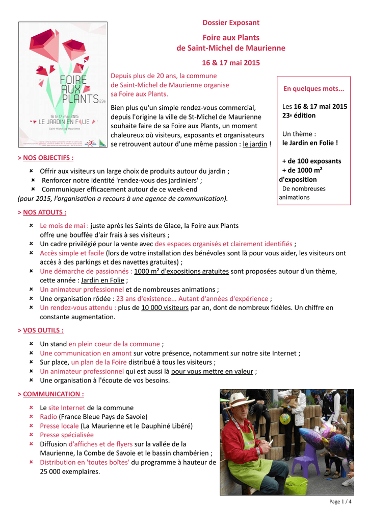 Dossier Exposant Foire aux Plants de Saint-Michel de Maurienne 16 & 17 mai 2015 Depuis plus de 20 ans, la commune de Saint-Michel de Maurienne organise sa Foire aux Plants. Bien plus qu'un simple rendez-vous commercial, depuis l'origine la ville de St-Michel de Maurienne souhaite faire de sa Foire aux Plants, un moment chaleureux où visiteurs, exposants et organisateurs se retrouvent autour d'une même passion : le jardin ! > NOS OBJECTIFS : Offrir aux visiteurs un large choix de produits autour du jardin ; Renforcer notre identité 'rendez-vous des jardiniers' ; Communiquer efficacement autour de ce week-end (pour 2015, l'organisation a recours à une agence de communication). En quelques mots... Les 16 & 17 mai 2015 23e édition Un thème : le Jardin en Folie ! + de 100 exposants + de 1000 m² d'exposition De nombreuses animations > NOS ATOUTS : Le mois de mai : juste après les Saints de Glace, la Foire aux Plants offre une bouffée d'air frais à ses visiteurs ; Un cadre privilégié pour la vente avec des espaces organisés et clairement identifiés ; Accès simple et facile (lors de votre installation des bénévoles sont là pour vous aider, les visiteurs ont accès à des parkings et des navettes gratuites) ; Une démarche de passionnés : 1000 m² d'expositions gratuites sont proposées autour d'un thème, cette année : Jardin en Folie ; Un animateur professionnel et de nombreuses animations ; Une organisation rôdée : 23 ans d'existence... Autant d'années d'expérience ; Un rendez-vous attendu : plus de 10 000 visiteurs par an, dont de nombreux fidèles. Un chiffre en constante augmentation. > VOS OUTILS : Un stand en plein coeur de la commune ; Une communication en amont sur votre présence, notamment sur notre site Internet ; Sur place, un plan de la Foire distribué à tous les visiteurs ; Un animateur professionnel qui est aussi là pour vous mettre en valeur ; Une organisation à l'écoute de vos besoins. > COMMUNICATION : Le site Internet de la commune Radio (France Bleue Pays de Savoie) Presse locale (La Maurienne et le Dauphiné Libéré) Presse spécialisée Diffusion d'affiches et de flyers sur la vallée de la Maurienne, la Combe de Savoie et le bassin chambérien ; Distribution en 'toutes boîtes' du programme à hauteur de 25 000 exemplaires. Page 1 / 4 > LA TOMBOLA A chaque édition, les organisateurs de la Foire aux Plants propose une grande tombola, gratuite, à l'ensemble de ses visiteurs. L'occasion pour vous de valoriser vos produits et savoir-faire puisque à chaque lot, nous tenons à vous mettre en avant et en valeur. Pour le bon déroulement de cette tombola, nous demandons aux exposants d'offrir un lot (d'une valeur minimale de 30 €) pour chaque inscription. > NOUVEAU CETTE ANNÉE ! LE CONCOURS DU PLUS BEL EXPOSANT ! A la clef : on vous offre votre emplacement sur la Foire aux Plants 2016. La règle du jeu : coller au thème de l'année, 'Jardin en folie'. Plusieurs prix en jeu : Le chapeau le plus fleuri ; Un habit soigné, original, très tendance jardin ; Le stand le plus joliment fleuri (les horticulteurs seront évidemment hors concours pour cette catégorie...) ; Le parasol le plus original (des fleurs évidemment, mais cotillons et autres franfreluches sont les bienvenues) ; La plus belle démonstration... La Foire étant avant tout un rendez-vous de passionnés et d'artisans, l'Organisation encourage ses exposants à montrer, expliquer, communiquer... Pour participer, pas besoin de s'inscrire. Le jury déambulera dans les allées dimanche et désignera les lauréats. Pas besoin non plus de sortir le grand jeu, pas question de se grimer, juste de jouer le jeu... De nous donner envie de sourire avec vous. > COMMENT SE DÉROULE L'INSCRIPTION ? Vous trouverez à la fin de ce dossier un bulletin d'inscription à nous retourner impérativement avant le 25 mars 2015. Vous y trouverez les tarifs. Pensez à bien remplir, et de manière lisible, l'ensemble de vos coordonnées. Pensez à joindre : Votre règlement (condition indispensable pour entériner l'inscription) ; Les pièces justificatives concernant votre activité commerciale : carte professionnelle et justificatif d'inscription à la chambre de commerce ; Une semaine avant la Foire vous recevrez un carton de confirmation à présenter à l'entrée de la Foire (Attention ! Ce carton est envoyé uniquement aux personnes ayant réglé leur emplacement et à jour de toutes les pièces justificatives). Page 2 / 4 > INFORMATIONS PRATIQUES Les horaires : La foire commerciale : L'espace "produits alimentaires régionaux" se tiendra dans la cours de l'école et sera accessible dès le samedi à 10 h 30. Le reste de la Foire commerciale se déroulera rue Général Ferrié et sera ouverte le dimanche uniquement de 9 h à 18 h. La grande vente de plants se déroule le dimanche de 9 h à 18 h. L'espace exposition : Il sera accessible à tous, gratuitement, le samedi de 13h30 à 18 h et le dimanche de 9 h à 18 h. Nous ne manquerons pas de vous faire part du programme. Installation : Pour les exposants du samedi et dimanche (produits alimentaires régionaux) : installation le samedi? Arrivée au plus tard à) 8h30 dans la cour de l'Ecole Primaire. Attention ! Il n'est plus possible de ressortir les véhicules de la cour avant le dimanche 17h30. Pour les exposants du dimanche (hors produits alimentaires) : installation sur le linéaire jusqu'à 8 heures dernier délai. L'accès en voiture est autorisé jusqu'à 8 h. De 8 h à 18 h, le linéaire est interdit à tout véhicule non autorisé par l'Organisation. Accès : Autoroute A 43 Lyon – Turin (sortie 29 – Saint Michel de Maurienne) Départementale 1006 Paris Lyon Torino (Italie) Chambéry Grenoble 650 km 185 km 125 km 90 km 120 km Coordonnées GPS : Latitude : 45.216667 – Longitude : 6.466667 Page 3 / 4 > OÙ S'HÉBERGER ? Adresse Nom Coordonnées Beau Grand Village 73140 Saint-Michel de Maurienne Tel. 04 79 83 07 11 Mail. [email protected] Web. w