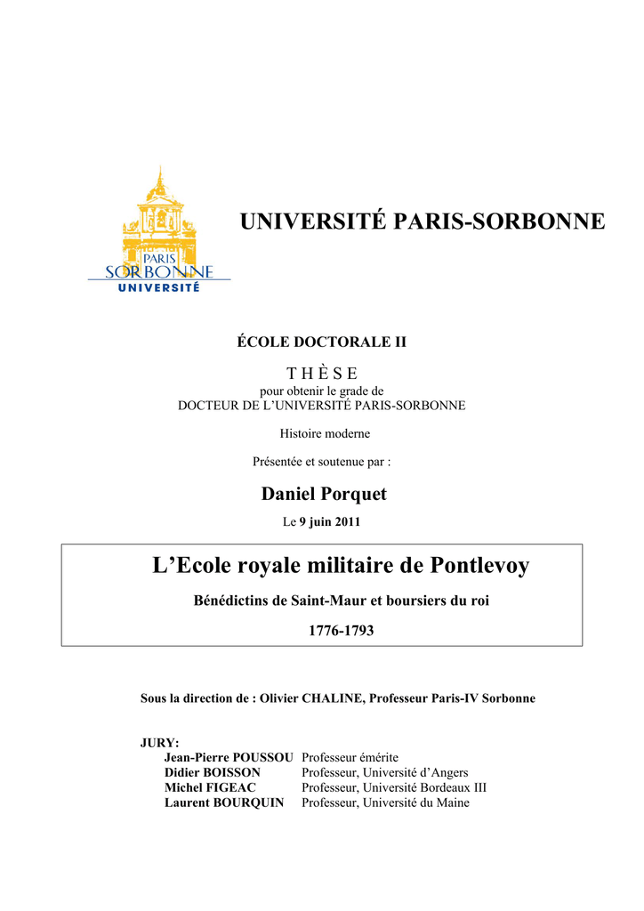 UNIVERSITÉ PARIS-SORBONNE ÉCOLE DOCTORALE II THÈSE pour obtenir le grade de DOCTEUR DE L’UNIVERSITÉ PARIS-SORBONNE Histoire moderne Présentée et soutenue par : Daniel Porquet Le 9 juin 2011 L’Ecole royale militaire de Pontlevoy Bénédictins de Saint-Maur et boursiers du roi 1776-1793 Sous la direction de : Olivier CHALINE, Professeur Paris-IV Sorbonne JURY: Jean-Pierre POUSSOU Didier BOISSON Michel FIGEAC Laurent BOURQUIN Professeur émérite Professeur, Université d’Angers Professeur, Université Bordeaux III Professeur, Université du Maine 2 L’Ecole royale militaire de Pontlevoy Bénédictins de Saint-Maur et boursiers du roi 1776-1793 3 4 Propos liminaire Pour me permettre de mener à bien cette recherche qui a requis tous mes soins pendant ces quatre dernières années, nombreux sont ceux qui m’ont éclairé de leurs conseils et m’ont aidé au cours de mes travaux. Merci tout d’abord au professeur Olivier Chaline qui a bien voulu m’accepter en qualité de « thésard » et qui a dirigé mes recherches sur l’Ecole royale militaire de Pontlevoy. Je lui sais particulièrement gré d’avoir attiré mon attention sur les spécificités de l’historiographie et d’avoir su, par touches successives, par de très nombreux conseils de lecture, me ramener à ce qui était essentiel. Des recherches patientes et fructueuses ont été menées dans d’excellentes conditions aux archives de Blois. J’ai pu bénéficier pendant toutes ces années de l’aide de M. Philippe Pintrand des Archives départementales de Loir-et-Cher. Il fut toujours disponible pour répondre à mes interrogations, à mes doutes, en particulier sur certaines datations. Il en fut de même pour M. Bruno Guignard de la Bibliothèque de l’abbé Grégoire, toujours prêt à commenter quelque document iconographique. Enfin, les troisièmes acteurs de Blois, le père Dominique Ougazéau puis M. Jean Sauvage des Archives diocésaines, ont fait preuve de la plus grande bienveillance pour m’ouvrir leur fonds ancien. D’autres archives départementales, notamment celles de Corse, de la Meuse, de l’Ardèche, de l’Aveyron, du Morbihan ou de la Loire-Atlantique, m’ont envoyé documents et références et ont répondu bien volontiers à mes demandes, tout comme les archives et la médiathèque d’Orléans, la mairie de Lamballe ou les archives de Montréal au Canada et d’Albany dans l’état de New York. Qu’elles en soient remerciées car elles m’ont permis de compléter certains dossiers de boursiers du roi qui seraient restés bien vides sans leur assistance. Merci aux professeurs M. Nassiet et R. Blaufarb, qui ont bien voulu me communiquer l’un des documents relatifs à la densité nobiliaire de la France de la fin du XVIIIe siècle, l’autre son appréciation des réformes de Saint-Germain. Merci à M. Finon, membre de la Société d’Histoire et d’Archéologie de Senlis, qui m’a confié des documents relatifs à l’Institution Paternelle des Chevaliers de Saint-Louis. J’ai pu également avoir accès, grâce à Mme B. Le Coënt, à l’ancienne maison d’éducation qu’ils avaient créée, aujourd’hui propriété privée. Qu’ils sachent que je leur en sais gré. 5 Enfin merci à Monsieur le professeur Jean Chagniot sans qui mon intérêt pour l’Ecole royale militaire de Pontlevoy ne se serait peut être jamais manifesté. Que vaudrait un travail portant sur de jeunes gentilshommes si on ne pouvait recueillir le témoignage de quelques uns de leurs descendants ? J’ai pu, grâce à des amis, m’entretenir longuement avec M. le marquis Antoine Le Mintier de la Motte Basse qui m’a accueilli à son château du Gouray où ont vécu deux boursiers du roi, les jeunes René-Florian et ToussaintLouis Le Mintier et m’a ouvert ses archives. Qu’il en soit vivement remercié. De la même façon, Madame Gaudart de Mongirault d’Allaines a bien voulu me communiquer la généalogie de sa famille. Je garde l’anonymat, comme elles me l’ont demandé, sur deux familles bretonnes qui, elles aussi, m’ont apporté des informations sur leurs aïeux. Leurs témoignages m’ont été utiles. Enfin, je tiens à remercier mes proches qui ont accepté mes absences, mon indisponibilité et qui m’ont apporté leur appui. Il fut multiforme. Tout d’abord mes enfants, qu’ils soient à quelques milliers de kilomètres de Paris, Catherine et Jean-Philippe, ou tout proche, Odile et Stephen, ont régulièrement participé à la résolution des nombreux problèmes informatiques qui ne manquèrent pas de m’embarrasser. Ensuite, pour le travail le plus fastidieux mais aussi le plus nécessaire qui soit, la lecture puis la relecture de plusieurs centaines de pages, je ne sais comment exprimer ma reconnaissance à ma femme et à ma sœur qui ont consacré de très nombreuses heures à cette tâche ingrate. Ainsi, un travail que l’on pourrait imaginer solitaire se révèle, in fine, être une œuvre peu ou prou collective. Que tous ceux que j’ai nommés, et ceux dont j’ai pu omettre le nom, sachent que j’ai toujours apprécié leurs concours. Je ne fus que le lecteur de milliers de documents, l’analyste et, je l’espère, le metteur en œuvre ordonné et attentif d’écrits et de témoignages, peu ou mal connus ou même ignorés, de ce siècle ou des siècles passés. 6 Avertissement ____________ Bien que le 10 août 1792 marque la chute de la Royauté et que la République ne soit proclamée que le 21 septembre, il m’est apparu légitime de prolonger jusqu’à la date du 31 octobre 1793 l’étude de l’Ecole militaire de Pontlevoy et des boursiers du roi. En effet, à l’exception de Joseph Haby, reçu et installé à Pontlevoy le 21 avril 1793 en conséquence des ordres du citoyen Audoin, adjoint du ministre de la guerre, et parti le 9 octobre de la même année, tous les autres élèves ont bénéficié des grâces de Louis XVI, le dernier recensé dans les registr