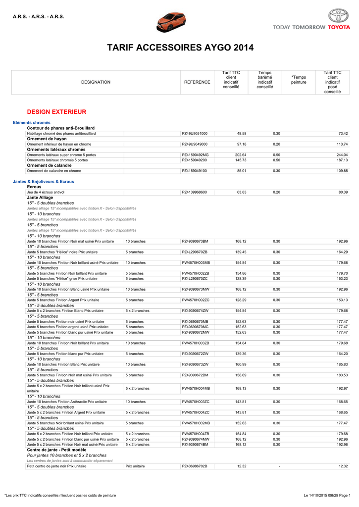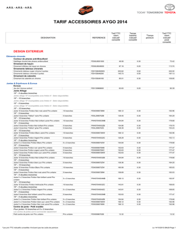 A.R.S. - A.R.S. - A.R.S. TARIF ACCESSOIRES AYGO 2014 DESIGNATION REFERENCE Tarif TTC client indicatif conseillé Temps barèmé indicatif conseillé *Temps peinture Tarif TTC client indicatif posé conseillé DESIGN EXTERIEUR Eléments chromés Contour de phares anti-Brouillard Habillage chromé des phares antibrouillard PZ49U9051000 48.58 0.30 73.42 PZ49U9049000 97.18 0.20 113.74 PZ41590492MG PZ4159049200 202.64 145.73 0.50 0.50 244.04 187.13 PZ4159049100 85.01 0.30 109.85 PZ4139968600 63.83 0.20 80.39 10 branches PZ49390673BM 168.12 0.30 192.96 5 branches PZ4L290670ZB 139.45 0.30 164.29 10 branches PW4570H003MB 154.84 0.30 179.68 5 branches 5 branches PW4570H002ZB PZ4L290670ZC 154.86 128.39 0.30 0.30 179.70 153.23 10 branches PZ49390673MW 168.12 0.30 192.96 5 branches PW4570H002ZC 128.29 0.30 153.13 5 x 2 branches PZ49390674ZW 154.84 0.30 179.68 5 branches 5 branches 5 branches PZ40690670MB PZ40690670MC PZ49390672MW 152.63 152.63 152.63 0.30 0.30 0.30 177.47 177.47 177.47 10 branches PW4570H003ZB 154.84 0.30 179.68 5 branches PZ49390672ZW 139.36 0.30 164.20 10 branches PZ49390673ZW 160.99 0.30 185.83 5 branches PZ49390672BM 158.69 0.30 183.53 5 x 2 branches PW4570H004MB 168.13 0.30 192.97 10 branches PW4570H003ZC 143.81 0.30 168.65 5 x 2 branches PW4570H004ZC 143.81 0.30 168.65 5 branches PW4570H002MB 152.63 0.30 177.47 5 x 2 branches 5 x 2 branches 5 x 2 branches PW4570H004ZB PZ49390674MW PZ49390674BM 154.84 168.12 168.12 0.30 0.30 0.30 179.68 192.96 192.96 Prix unitaire PZ406986702B 12.32 - 12.32 Ornement de hayon Ornement inférieur de hayon en chrome Ornements latéraux chromés Ornements latéraux super chrome 5 portes Ornements latéraux chromés 5 portes Ornement de calandre Ornement de calandre en chrome Jantes & Enjoliveurs & Ecrous Ecrous Jeu de 4 écrous antivol Jante Alliage 15" - 5 doubles branches Jantes alliage 15" incompatibles avec finition X - Selon disponibilités 15" - 10 branches Jantes alliage 15" incompatibles avec finition X - Selon disponibilités 15" - 5 branches Jantes alliage 15" incompatibles avec finition X - Selon disponibilités 15" - 10 branches Jante 10 branches Finition Noir mat usiné Prix unitaire 15" - 5 branches Jante 5 branches "Hélice" noire Prix unitaire 15" - 10 branches Jante 10 branches Finition Noir brillant usiné Prix unitaire 15" - 5 branches Jante 5 branches Finition Noir brillant Prix unitaire Jante 5 branches "Hélice" grise Prix unitaire 15" - 10 branches Jante 10 branches Finition Blanc usiné Prix unitaire 15" - 5 branches Jante 5 branches Finition Argent Prix unitaire 15" - 5 doubles branches Jante 5 x 2 branches Finition Blanc Prix unitaire 15" - 5 branches Jante 5 branches Finition noir usiné Prix unitaire Jante 5 branches Finition argent usiné Prix unitaire Jante 5 branches Finition blanc pur usiné Prix unitaire 15" - 10 branches Jante 10 branches Finition Noir brillant Prix unitaire 15" - 5 branches Jante 5 branches Finition blanc pur Prix unitaire 15" - 10 branches Jante 10 branches Finition Blanc Prix unitaire 15" - 5 branches Jante 5 branches Finition Noir mat usiné Prix unitaire 15" - 5 doubles branches Jante 5 x 2 branches Finition Noir brillant usiné Prix unitaire 15" - 10 branches Jante 10 branches Finition Anthracite Prix unitaire 15" - 5 doubles branches Jante 5 x 2 branches Finition Argent Prix unitaire 15" - 5 branches Jante 5 branches Noir brillant usiné Prix unitaire 15" - 5 doubles branches Jante 5 x 2 branches Finition Noir brillant Prix unitaire Jante 5 x 2 branches Finition blanc pur usiné Prix unitaire Jante 5 x 2 branches Finition Noir mat usiné Prix unitaire Centre de jante - Petit modèle Pour jantes 10 branches et 5 x 2 branches Les centres de jantes sont à commander séparement Petit centre de jante noir Prix unitaire *Les prix TTC indicatifs conseillés n'incluent pas les coûts de peinture Le 14/10/2015 09h29 Page 1 A.R.S. - A.R.S. - A.R.S. TARIF ACCESSOIRES AYGO 2014 DESIGNATION Petit centre de jante Cyan 8W9 Prix unitaire Petit centre de jante bleu océan 8R7 Prix unitaire Petit centre de jante gris éclipse 1E0 Prix unitaire Petit centre de jante orange pop 4W5 Prix unitaire Petit centre de jante Gris métallisé Prix unitaire Petit centre de jante Rouge 3P0 Prix unitaire Petit centre de jante blanc pur 068 Prix unitaire REFERENCE Prix unitaire Prix unitaire Prix unitaire Prix unitaire Prix unitaire Prix unitaire Prix unitaire PZ406986702F PZ406986702D PZ406986702I PZ406986702H PZ406986702C PZ406986702G PZ406986702E Tarif TTC client indicatif conseillé 12.32 12.32 12.32 12.32 12.32 12.32 12.32 Temps barèmé indicatif conseillé *Temps peinture Tarif TTC client indicatif posé conseillé - 12.32 12.32 12.32 12.32 12.32 12.32 12.32 Centre de jante - Grand modèle Les centres de jantes grand modèles doivent OBLIGATOIREMENT être associés à un anneau centre de jante. A commander séparement. Pour jantes 5 branches Grand centre de jante noir brillant logo chromé Prix unitaire Grand centre de jante noir mat logo chromé Prix unitaire Grand centre de jante gris logo chromé Prix unitaire Grand centre de jante noir mat logo noir brillant Prix unitaire Grand centre de jante blanc pur logo chromé Prix unitaire Prix unitaire Prix unitaire Prix unitaire PZ493986722A PZ493986722B PZ493986722C 21.60 21.60 21.60 - 21.60 21.60 21.60 Prix unitaire PZ493986722D 21.60 - 21.60 Prix unitaire PZ493986722E 21.60 - 21.60 Prix unitaire Prix unitaire Prix unitaire Prix unitaire Prix unitaire Prix unitaire Prix unitaire Prix unitaire Prix unitaire PZ493986723A PZ493986723B PZ493986723D PZ493986723I PZ493986723C PZ493986723G PZ493986723E PZ493986723H PZ493986723F 10.48 10.48 10.48 10.48 10.48 10.48 10.48 10.48 10.48 - 10.48 10.48 10.48 10.48 10.48 10.48 10.48 10.48 10.48 426110H020 62.45 0.30 87.29 426110H030 83.15 0.30 107.99 PZ41590492MG PZ41590492HU PZ41590492BA PZ41590492DF 202.64 145.73 145.73 145.63 0.30 0.30 0.30 0.30 227.48 170.57 170.57 170.47 879450H040J1 879450H040A0 879450H040J0 879450H040B0 879450