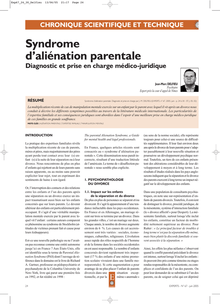 Exp67_24_30_Delfieu 13/06/05 21:17 Page 24 CHRONIQUE SCIENTIFIQUE ET TECHNIQUE Syndrome d’aliénation parentale Diagnostic et prise en charge médico-juridique Jean-Marc DELFIEU Psychiatre Expert près la cour d’appel de Nîmes RÉSUMÉ Syndrome d’aliénation parentale. Diagnostic et prise en charge par J.-M. DELFIEU (EXPERTS, n° 67, 2005, juin - p. 24 à 30 - ST, J, 05, 02) La multiplication récente de cas de manipulation mentale exercée sur un enfant par le parent avec lequel il vit après un divorce nous conduit à décrire les différents symptômes possibles au travers de la littérature médicale internationale. Les particularités de l’expertise familiale et ses conséquences juridiques sont abordées dans l’espoir d’une meilleure prise en charge médico-juridique de ces familles en grande souffrance. MOTS CLÉS : ALIÉNATION PARENTALE / EXPERTISE FAMILIALE / MANIPULATION MENTALE INTRODUCTION La pratique des expertises familiales révèle la multiplication récente de cas de parents, mères et pères, mais majoritairement des pères ayant perdu tout contact avec leur (s) enfant (s) à la suite de leur séparation ou à leur divorce. Nous rencontrons de plus en plus d’enfants qui rejettent un de leurs parents sans raison apparente, ou au moins sans pouvoir expliciter leur rejet, tout en exprimant des sentiments de haine à son égard. Or, l’interruption des contacts et des relations entre les enfants et l’un des parents après une séparation ou un divorce exerce un impact traumatisant aussi bien sur les enfants concernés que sur leurs parents. Le devenir ultérieur des enfants est particulièrement préoccupant. Il s’agit d’une véritable manipulation mentale exercée par le parent avec lequel vit l’enfant : certains auteurs comparent ce phénomène au syndrome de Stockholm (attitudes de victimes prenant fait et cause pour leurs kidnappeurs). Est-ce une nouvelle pathologie ou ne l’avaiton pas reconnue comme une entité autonome jusqu’ici en France ? Aux États-Unis, elle est identifiée sous le terme de Parental Alienation Syndrome (PAS) dont l’ouvrage de référence dans le domaine est le livre de Richard A. Gartner, professeur en pédopsychiatrie et psychanalyste de la Columbia University de New-York, livre qui parut une première fois en 1992, et fut réédité en 1998 : 24 The parental Alienation Syndrome, a Guide for mental health and legal professionals. En France, quelques articles récents sont consacrés au « syndrome d’aliénation parentale ». Cette dénomination nous paraît incorrecte, résultant d’une traduction littérale de l’américain. Le terme de « désaffection parentale » nous semble plus explicite. 1. PSYCHOPATHOLOGIE DU DIVORCE 1.1. Impact sur les enfants de la séparation et du divorce De plus en plus de personnes se séparent et/ou divorcent. Il s’agit là apparemment d’une tendance inéluctable dans les pays occidentaux. En France et en Allemagne, un mariage récent sur trois se termine par un divorce. Dans les grandes villes, c’est un mariage sur deux. Chaque année, le nombre de divorce augmente environ de 6 %. Les causes de cet accroissement sont très variées : sociales, économiques, culturelles, religieuses. L’évolution assez rapide des rôles respectifs de l’homme et de la femme dans les sociétés occidentales en est aussi responsable. Le nombre d’enfants concernés devient rapidement très important (17 % des enfants d’une même promotion scolaire vivraient dans une famille monoparentale). Si cette augmentation a pour avantage de ne plus placer l’enfant de parents divorcés dans une situation excepmême « anormale » tionnelle, et par la (au sens de la norme sociale), elle représente toujours pour celui-ci une source de difficultés supplémentaires. Il leur faut environ deux ans après le divorce de leurs parents pour s’adapter passablement à leur nouvelle situation et poursuivre un développement psychique normal. Toutefois, un tiers de ces enfants présentent des altérations considérables de leur développement à moyen et à long terme. Les résultats d’études réalisés dans les pays anglosaxons indiquent que la séparation et le divorce des parents exercent à long terme un impact négatif sur le développement des enfants. Dans une population de consultants psychiatriques, on note une sur-représentation d’enfants de parents divorcés. Toutefois, il convient de distinguer le divorce, procédé juridique, de la mésentente, système d’interaction familiale (le « divorce affectif » pour Despert). La mésentente familiale, surtout lorsqu’elle inclut les enfants, constitue un facteur de morbidité nettement supérieur au divorce. Pour Rutter : « Le principal facteur de troubles à long terme n’est pas la séparation elle-même, mais bien plutôt la discorde familiale si souvent associée à la séparation. » Ainsi, les effets les plus néfastes s’observent quand le conflit parental précédant le divorce est intense, surtout lorsqu’il inclut les enfants : ils peuvent être pris comme témoins ou otages rendus responsables de la mésentente, ou complices et confidents de l’un des parents. On peut leur demander de se substituer à l’un des parents, ou de soigner celui qui est déprimé EXPERTS - N° 67 - juin 2005 Exp67_24_30_Delfieu 13/06/05 21:17 Page 25 CHRONIQUE SCIENTIFIQUE ET TECHNIQUE (« enfant-médicament »). Au total, ils sont pris dans un conflit de loyauté inextricable qui est directement responsable des évolutions pathologiques éventuelles. Ces impacts négatifs sont : – un risque accru de maladies psychiques (plaintes hypocondriaques, accès d’angoisse, épisodes anorexiques ou insomniaques, états dépressifs ou psychosomatiques) ; – un échec ou un désintérêt scolaire ; – un risque accru de suicide ; – des problèmes relationnels et conjugaux ultérieurs. Certaines études soulignent spécialement les conséquences négativ