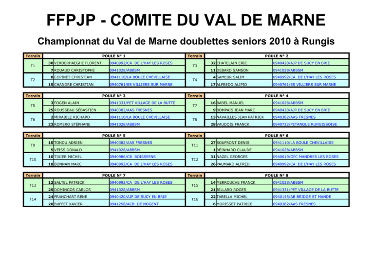 FFPJP - COMITE DU VAL DE MARNE Championnat du Val de Marne doublettes seniors 2010 à Rungis Terrain T1 T2 POULE N° 1 30 VERDERHAEGHE FLORENT 7 ROUAUD CHRISTOPHE 0941028/ABBSM 8 COPINET CHRISTIAN 0941110/LA BOULE CHEVILLAISE 19 CHANDRE CHRISTIAN Terrain T5 3 FOGEN ALAIN 2 MIRABILE RICHARD 23 ROMERO STÉPHANE Terrain T9 5 VEISS DONALD T10 T14 T4 0941110/LA BOULE CHEVILLAISE T7 T8 18 BONNAN MARC 0940992/CA DE L'HAY LES ROSES POULE N° 7 12 SALTEL PATRICK 0940992/CA DE L'HAY LES ROSES 29 DOMINGOS CARLOS 0941028/ABBSM 24 FRANCHART RENÉ 0940420/AJP DE SUCY EN BRIE 20 BUFFET XAVIER 0941258/ACB DE NOGENT 0940420/AJP DE SUCY EN BRIE 11 DEBARD SAMSON 0941028/ABBSM 4 SAMEUR SALIM 0940992/CA DE L'HAY LES ROSES 17 ALFREDO ALIPIO 0940761/ES VILLIERS SUR MARNE POULE N° 4 16 BABEL MANUEL T11 28 VAUDOIS FRANCK 0940722/PETANQUE RUNGISSOISE POULE N° 6 27 SOUFRONT DENIS T16 0941110/LA BOULE CHEVILLAISE 0941028/ABBSM 31 NAGEL GEORGES 0940619/GFC MANDRES LES ROSES 26 PAUMARD ALFRED 0940992/CA DE L'HAY LES ROSES Terrain T15 0940420/AJP DE SUCY EN BRIE 0940382/AAS FRESNES 1 REINHARD CLAUDE T12 0941028/ABBSM 13 NAVAILLES JEAN PATRICK Terrain 0941028/ABBSM 0940986/CB BOISSEENS 32 CHATELAIN ERIC 9 BOMPAIS JEAN MARC 0941028/ABBSM 0940382/AAS FRESNES POULE N° 2 Terrain 0940382/AAS FRESNES 10 TIXIER MICHEL Terrain T13 0941331/PET VILLAGE DE LA BUTTE POULE N° 5 15 TONDU ADRIEN T3 0940761/ES VILLIERS SUR MARNE POULE N° 3 25 ROUSSEAU SÉBASTIEN T6 0940992/CA DE L'HAY LES ROSES Terrain POULE N° 8 14 MERROUCHE FRANCK 0941028/ABBSM 21 BILLARD ROGER 0941331/PET VILLAGE DE LA BUTTE 22 TABELLA MICHEL 0940145/AB BRIDGE ST MANDE 6 MORISSET PATRICE 0940382/AAS FRESNES