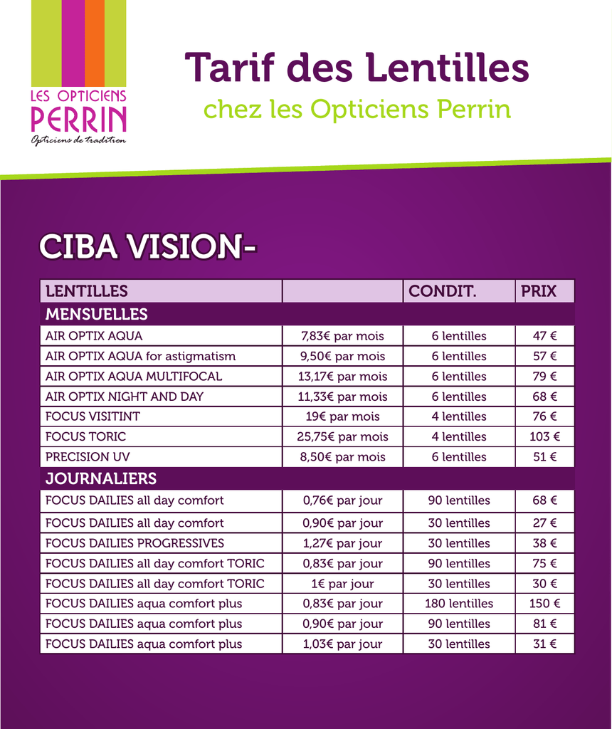 Tarif des Lentilles chez les Opticiens Perrin CIBA VISION- LENTILLES MENSUELLES CONDIT. PRIX AIR OPTIX AQUA 7,83€ par mois 6 lentilles 47 € AIR OPTIX AQUA for astigmatism 9,50€ par mois 6 lentilles 57 € AIR OPTIX AQUA MULTIFOCAL 13,17€ par mois 6 lentilles 79 € AIR OPTIX NIGHT AND DAY 11,33€ par mois 6 lentilles 68 € 19€ par mois 4 lentilles 76 € FOCUS TORIC 25,75€ par mois 4 lentilles 103 € PRECISION UV 8,50€ par mois 6 lentilles 51 € FOCUS DAILIES all day comfort 0,76€ par jour 90 lentilles 68 € FOCUS DAILIES all day comfort 0,90€ par jour 30 lentilles 27 € FOCUS DAILIES PROGRESSIVES 1,27€ par jour 30 lentilles 38 € FOCUS DAILIES all day comfort TORIC 0,83€ par jour 90 lentilles 75 € FOCUS DAILIES all day comfort TORIC 1€ par jour 30 lentilles 30 € FOCUS DAILIES aqua comfort plus 0,83€ par jour 180 lentilles 150 € FOCUS DAILIES aqua comfort plus 0,90€ par jour 90 lentilles 81 € FOCUS DAILIES aqua comfort plus 1,03€ par jour 30 lentilles 31 € FOCUS VISITINT JOURNALIERS
